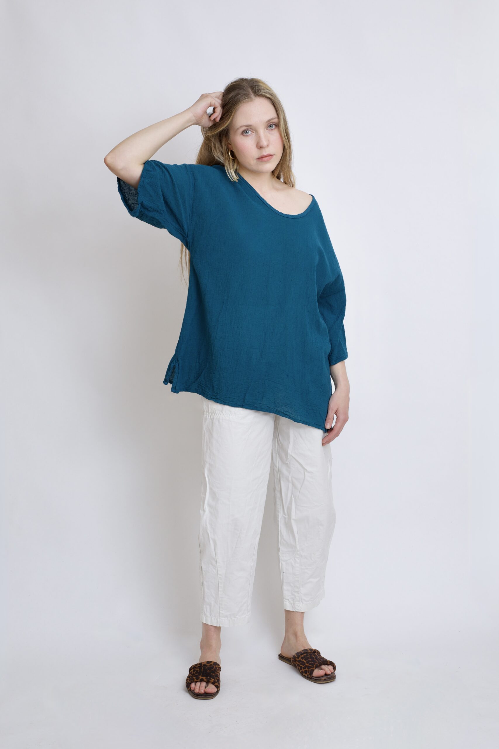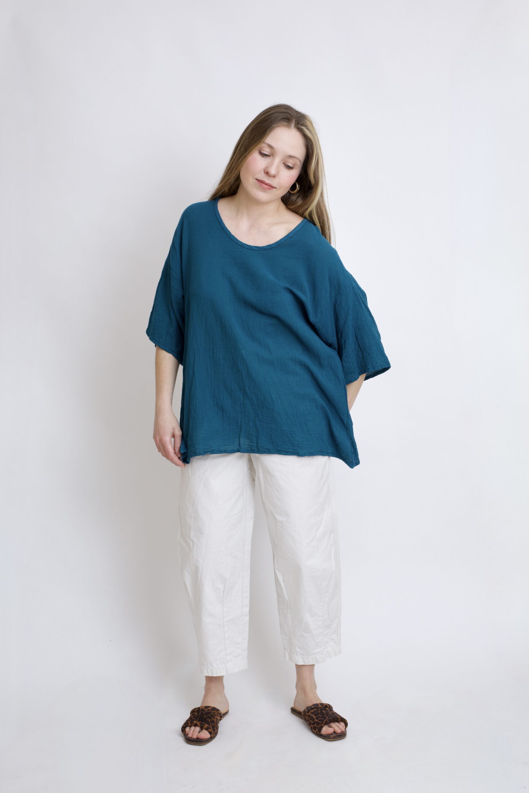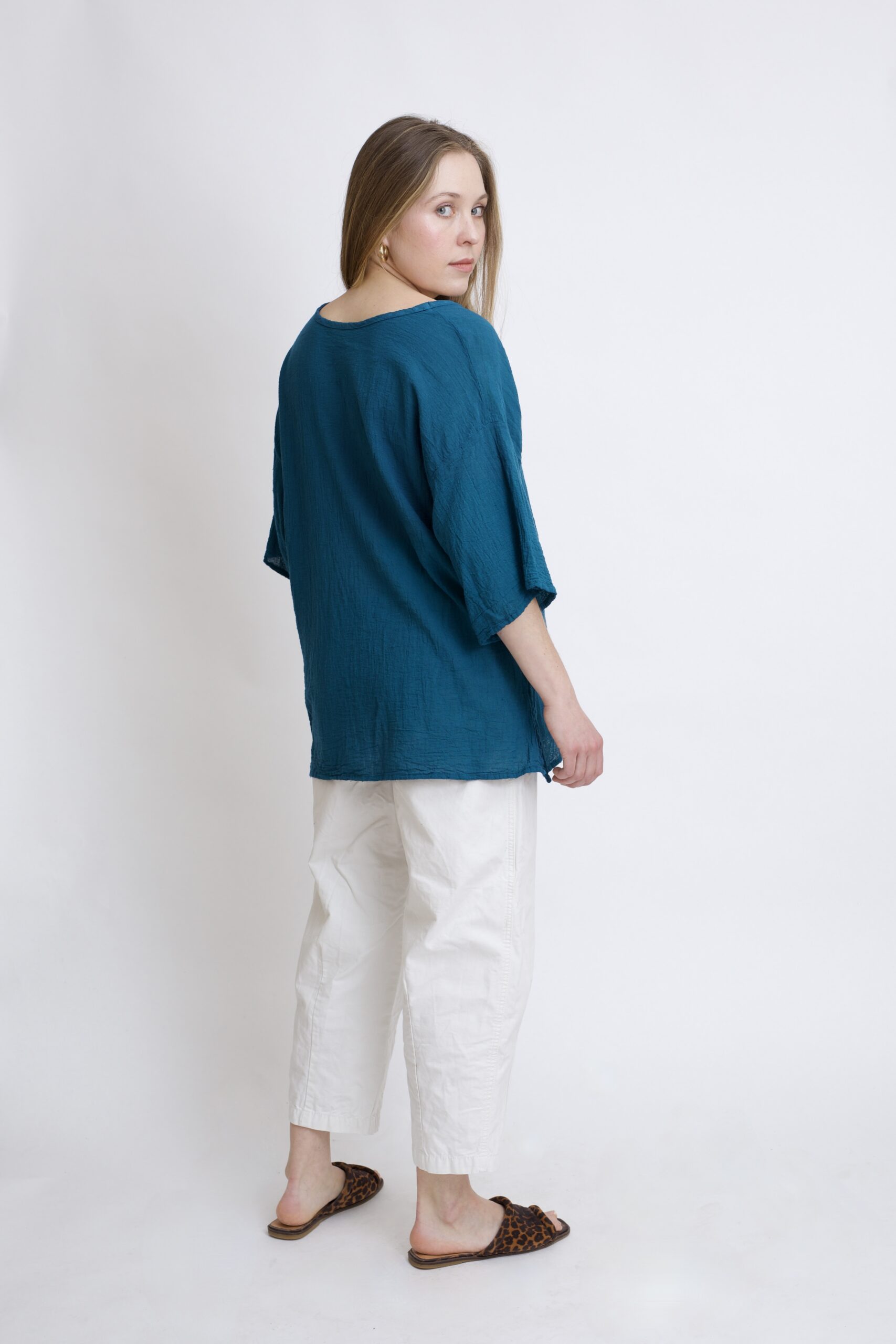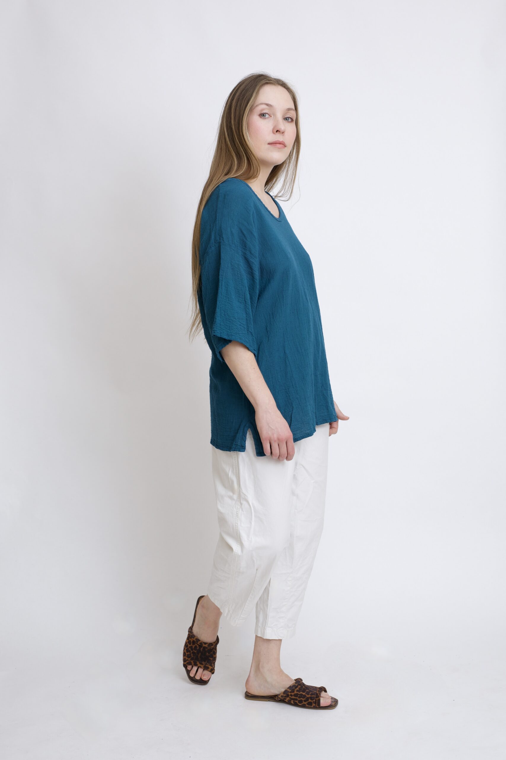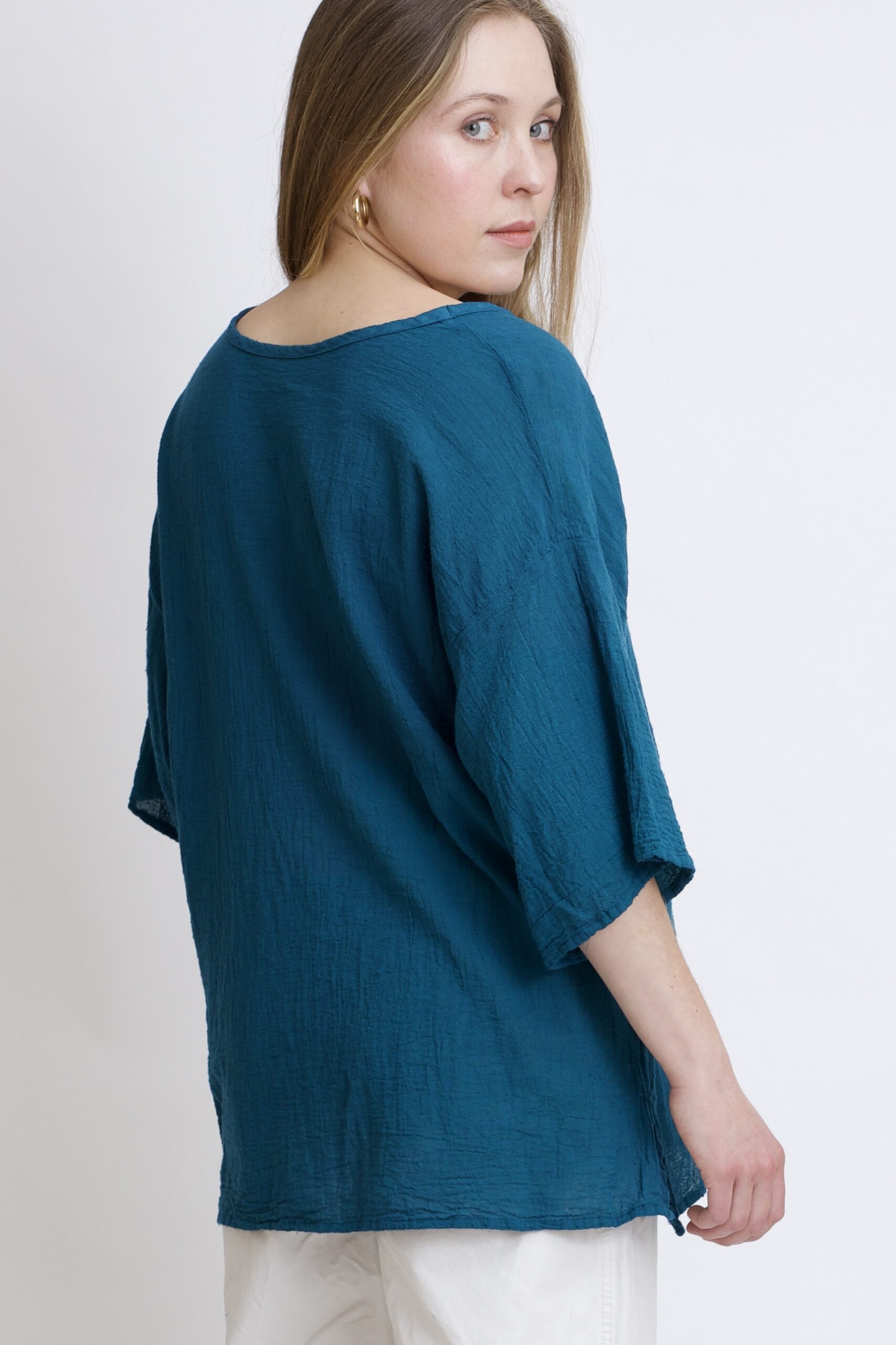 Damska bluzka z czystej, miłej w dotyku bawełny organicznej. Vera to luźna bluzka oversize, typu nietoperz – z szerokim, przedłużonym rękawkiem. Szeroki fason gwarantuje swobodę ruchu i komfort codziennego użytku. Prosty i uniwersalny krój sprawia, że pasuje do wielu zestawień na co dzień. Bluzka w kolorze niebieski – petrol.