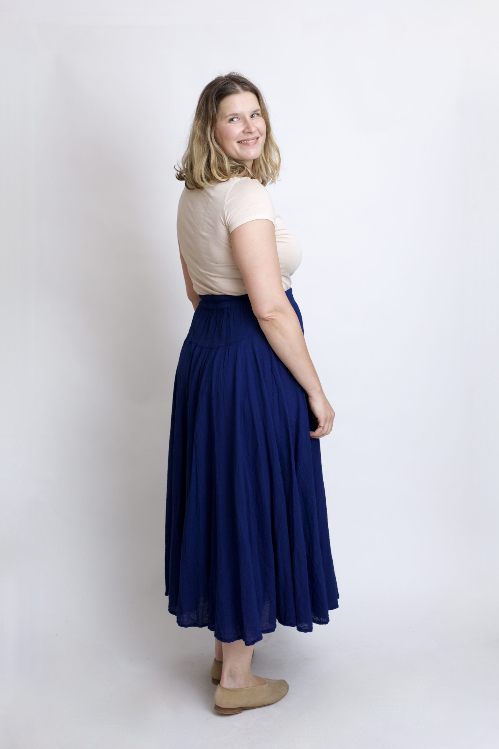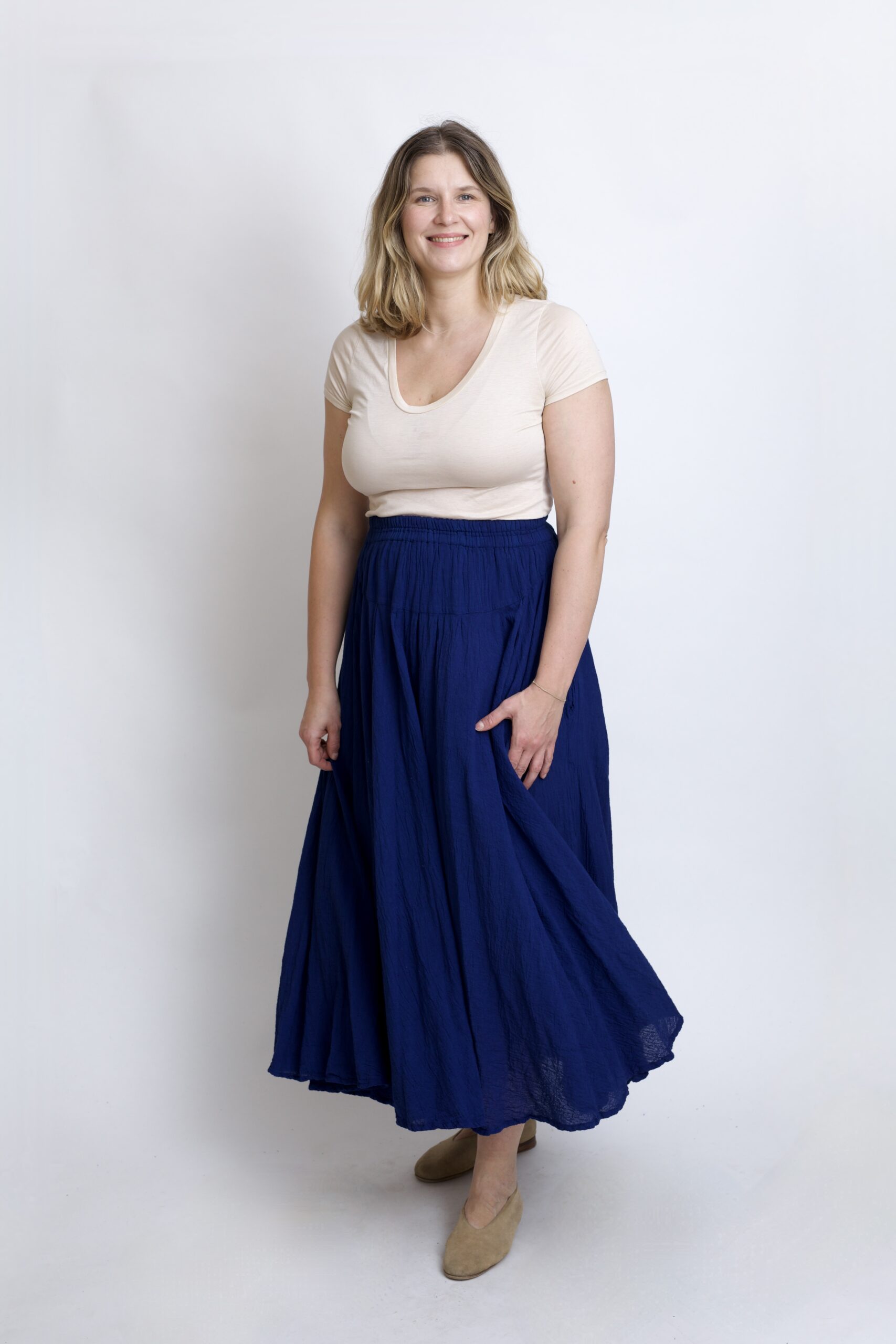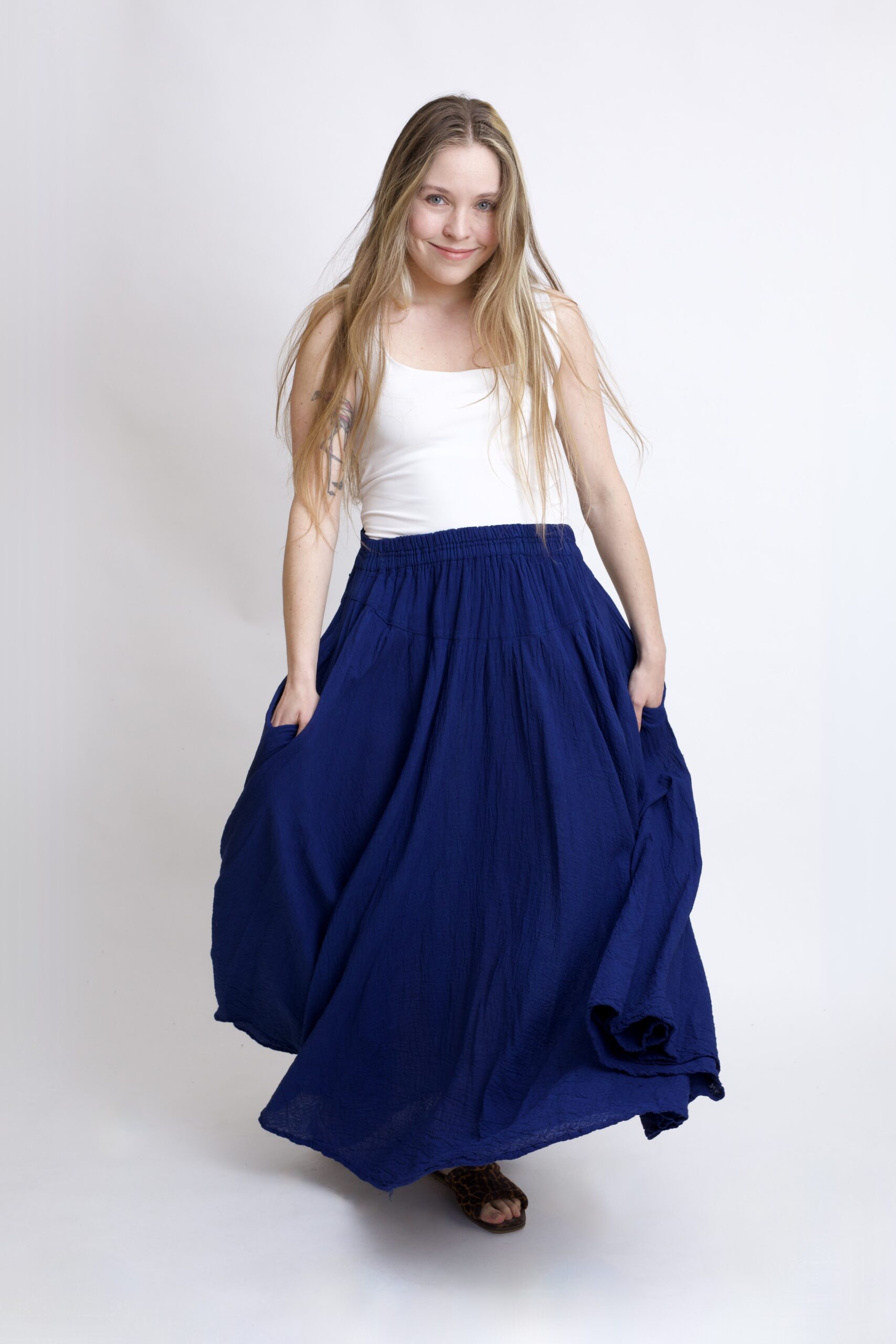 Długa, plisowana granatowo – niebieska spódnica z pełnego koła, wykonana z wysokiej jakości naturalnej bawełny. Spódnica oferuje niezrównaną miękkość na skórze oraz doskonałą przewiewność. Lekka, miła i wygodna. Plisowany fason z dwoma kieszeniami oraz elastyczną gumą w pasie gwarantują doskonałe dopasowanie i komfort codziennego użytku. Idealnie sprawdza się również w cieplejsze dni.