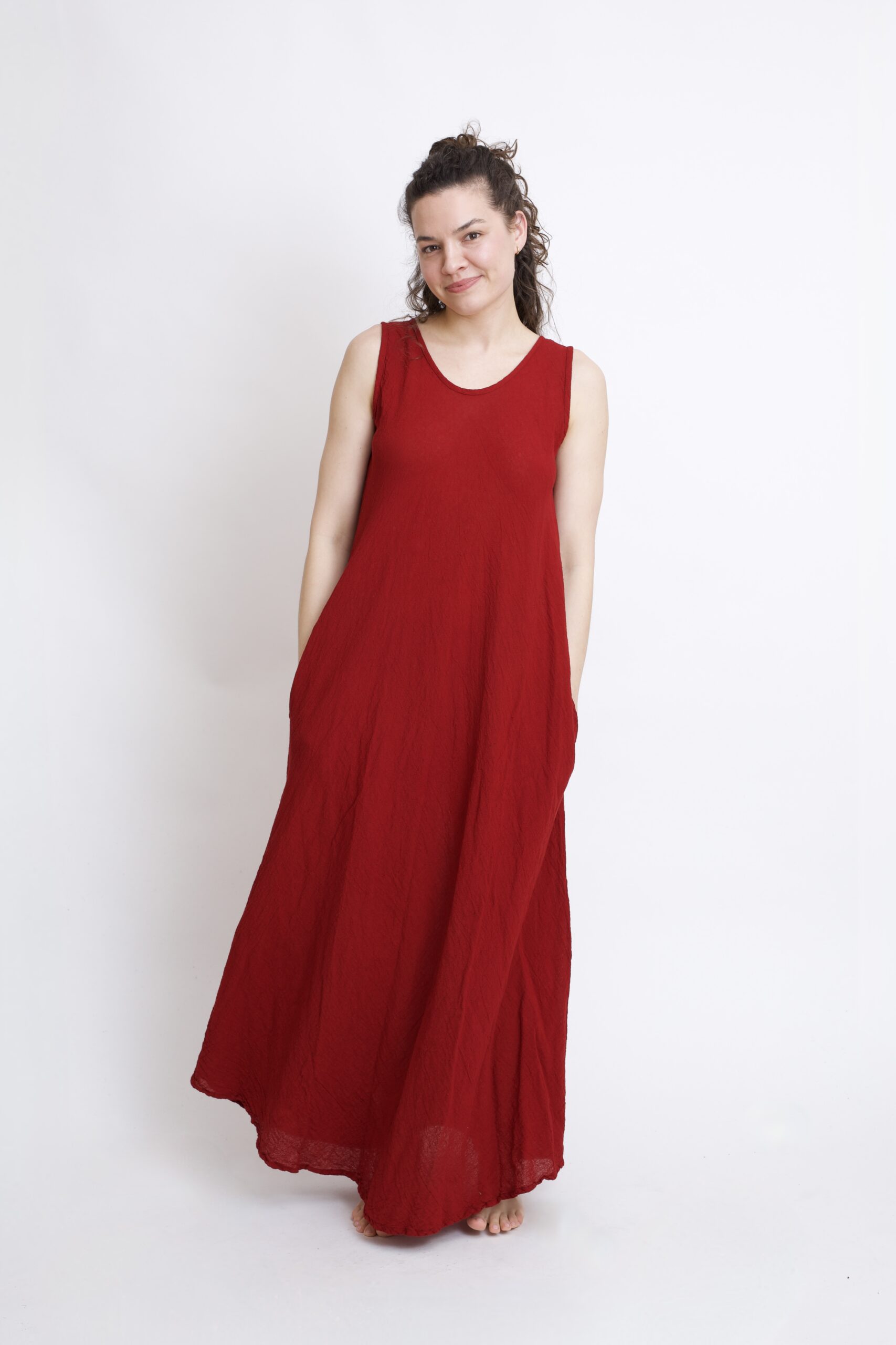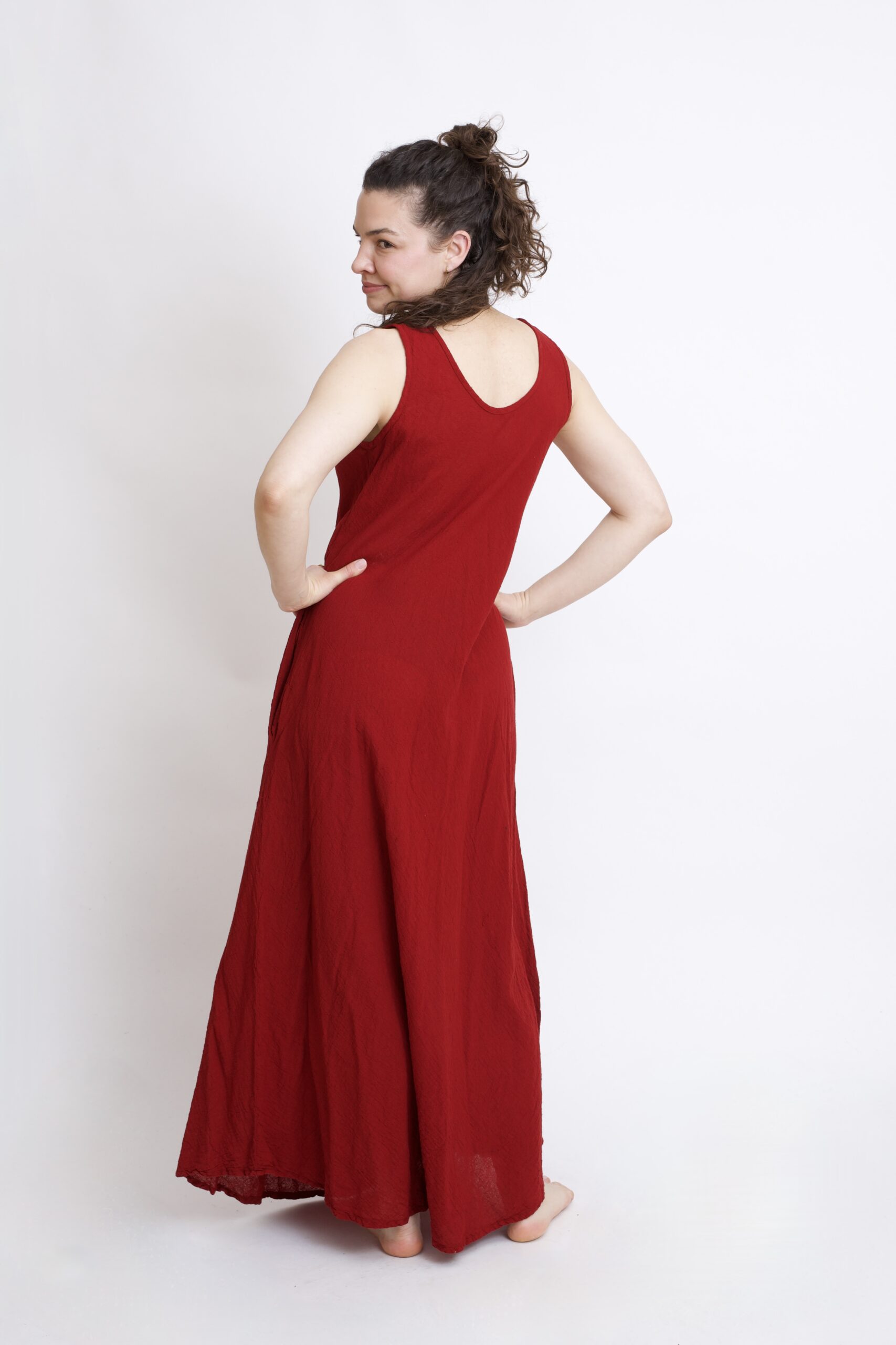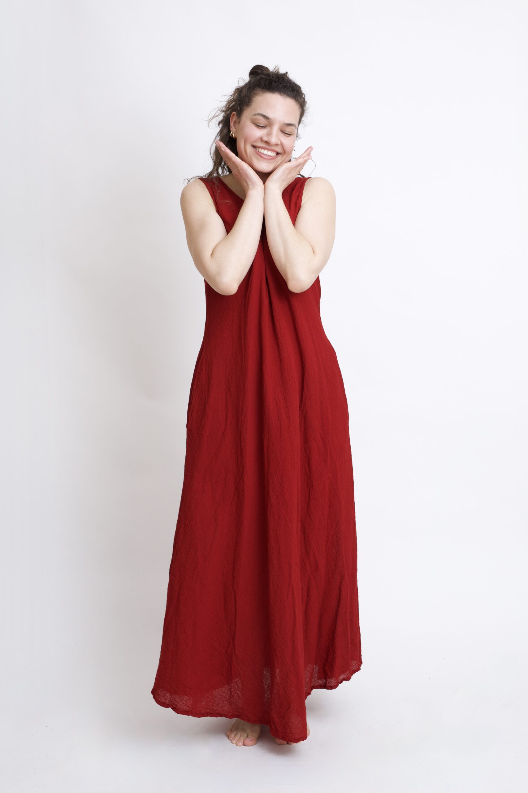 Długa sukienka maxi wykonana z czystej bawełny w kolorze burgundowym. Fason w kształcie litery „A” zapewnia wygodę noszenia, ładnie układa się na sylwetce i daje swobodę ruchów. Naturalny materiał sprawia, że sukienka jest przewiewna i idealna na co dzień – zarówno na spacer, do pracy, jak i na letnie wyjścia.