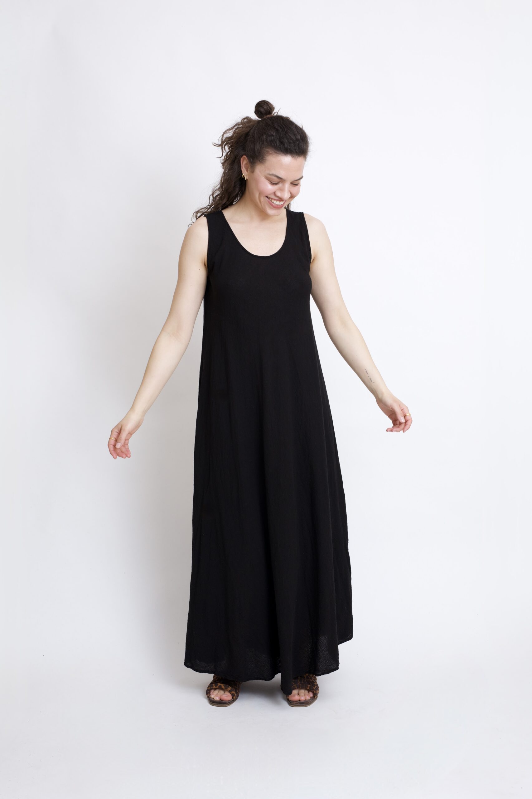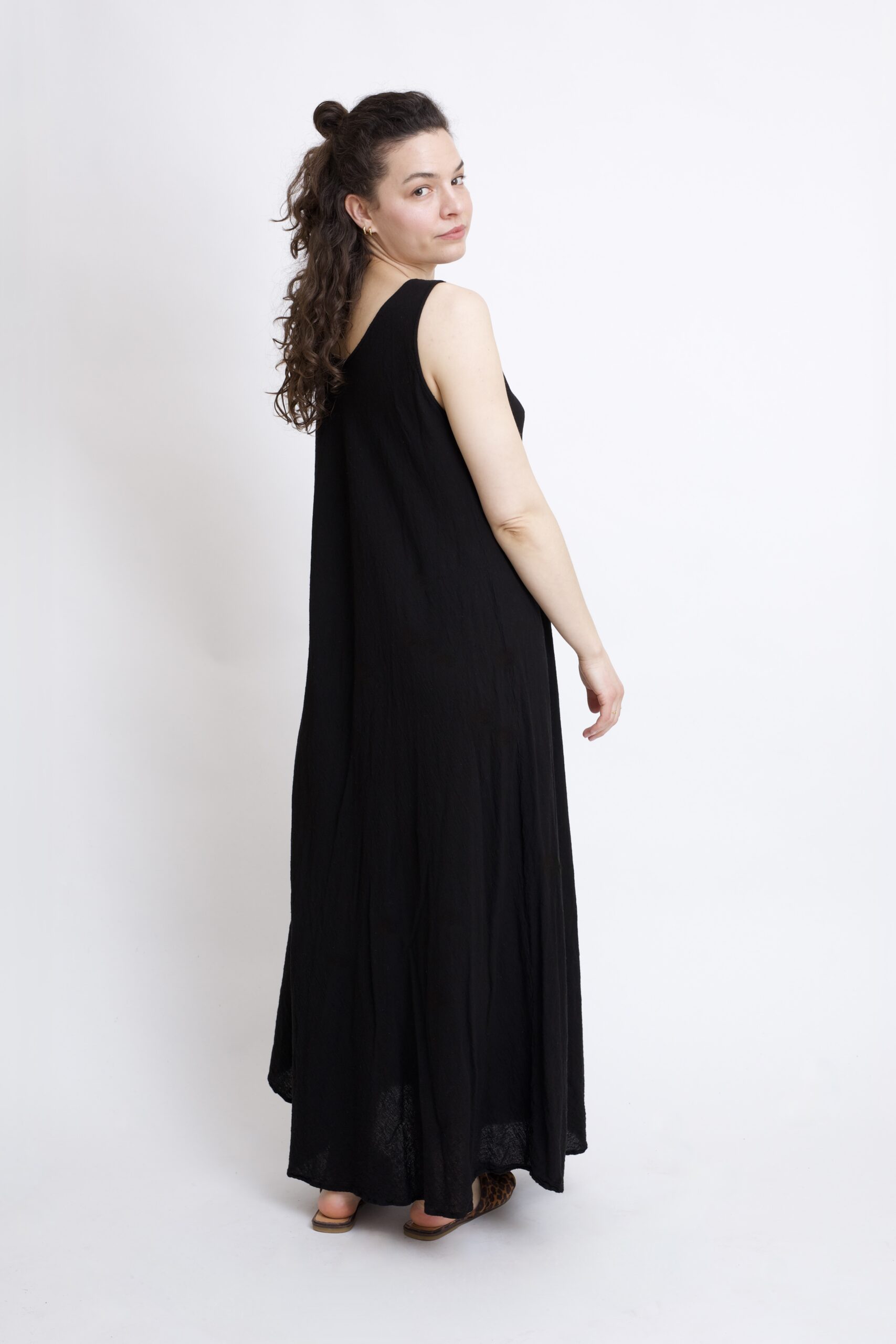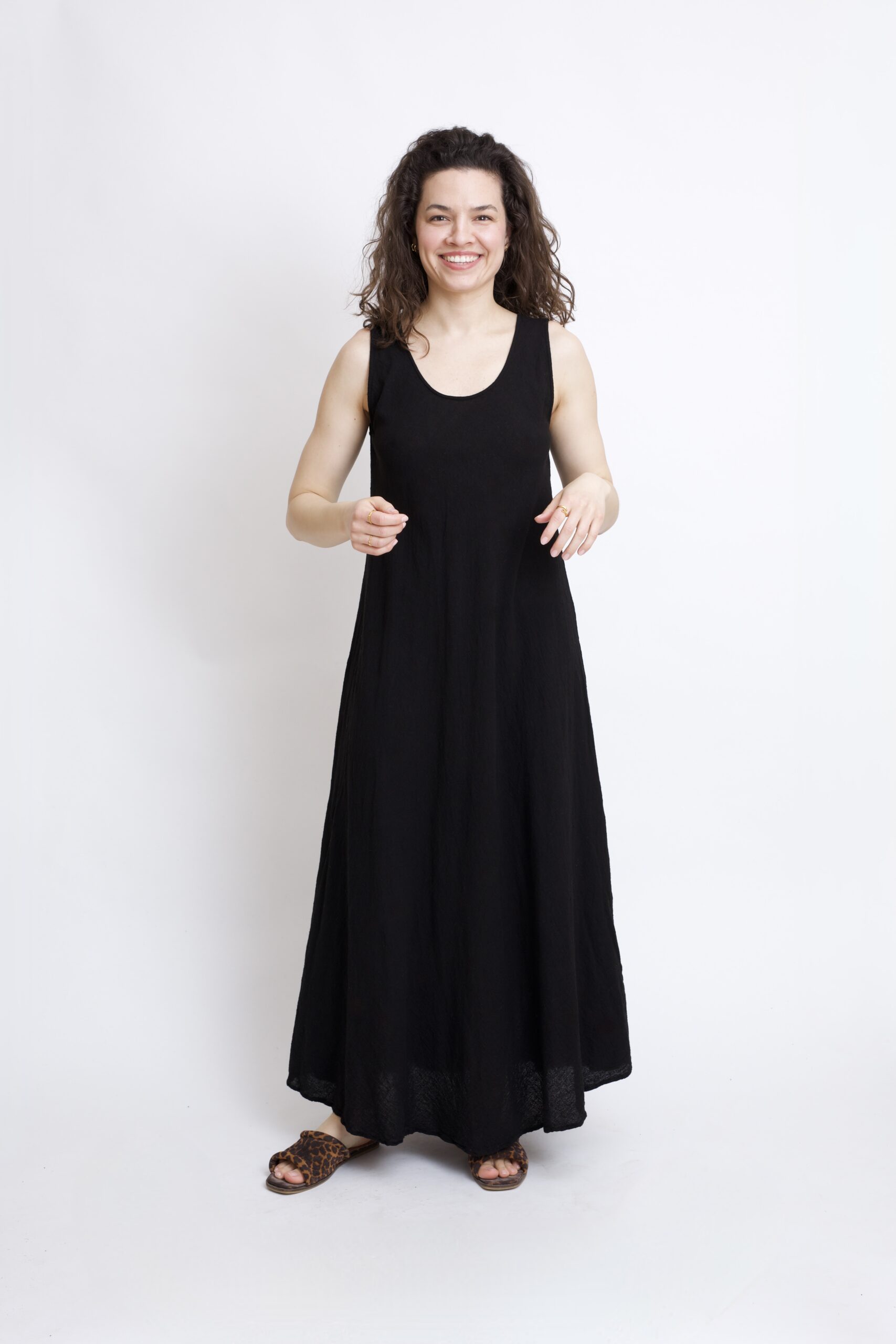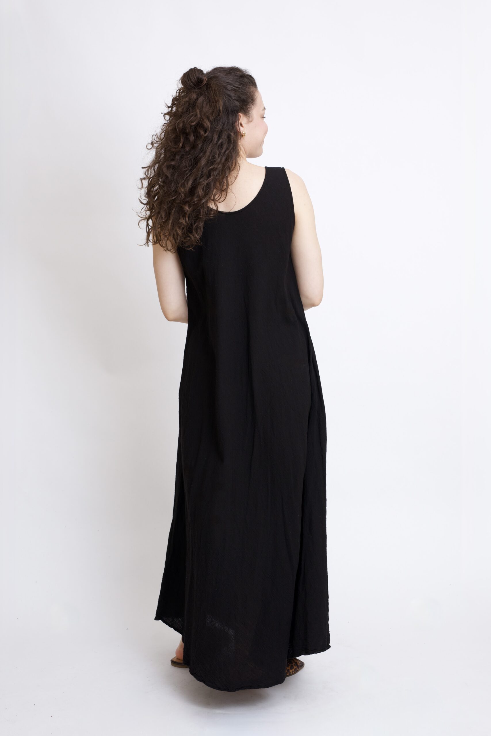 Długa sukienka maxi wykonana z czystej bawełny w kolorze czarnym. Fason w kształcie litery „A” zapewnia wygodę noszenia, ładnie układa się na sylwetce i daje swobodę ruchów. Naturalny materiał sprawia, że sukienka jest przewiewna i idealna na co dzień – zarówno na spacer, do pracy, jak i na letnie wyjścia.