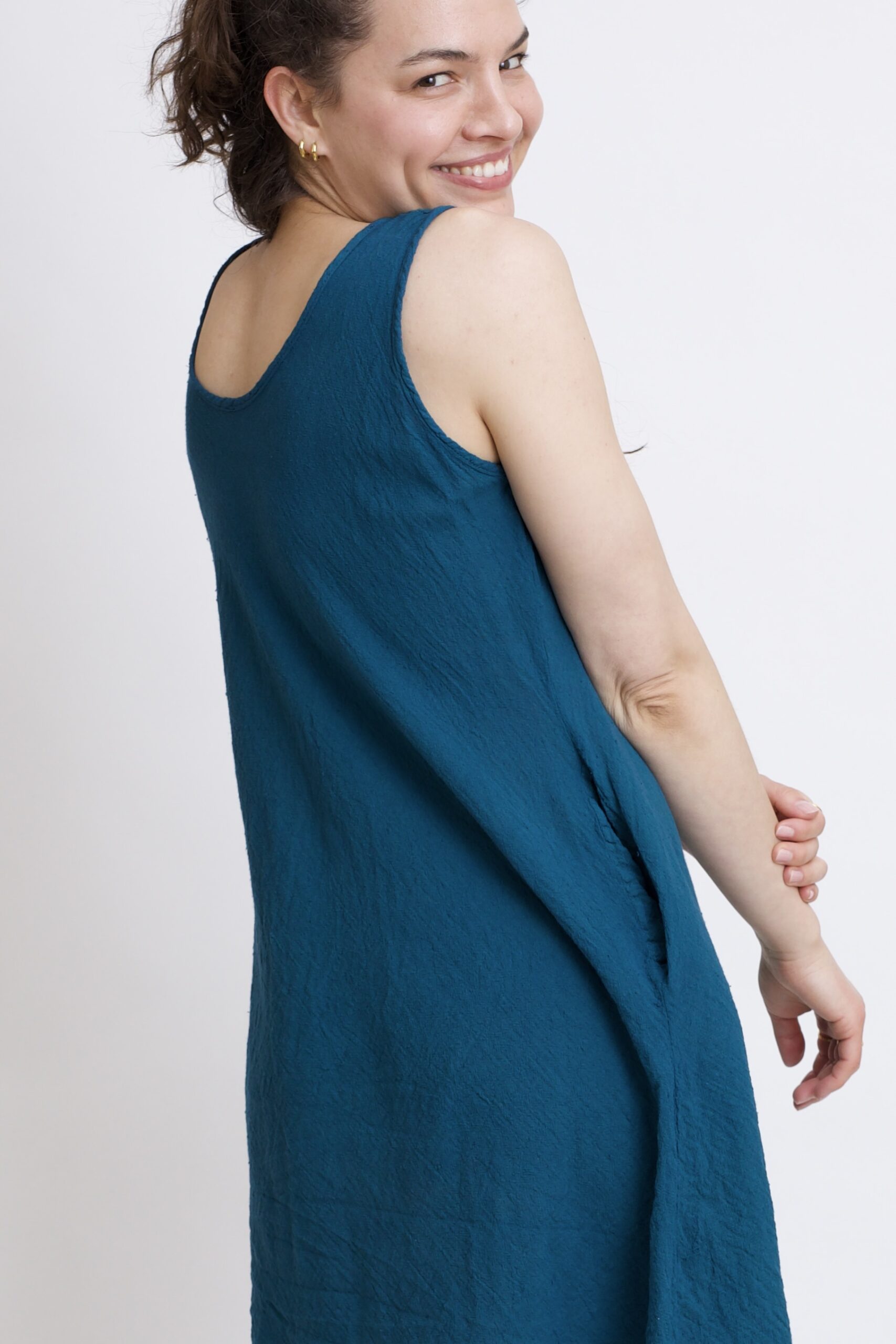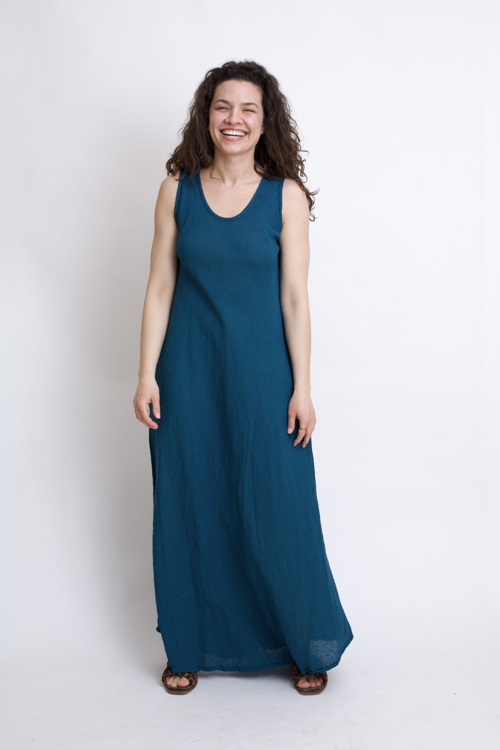 Długa sukienka maxi wykonana z czystej bawełny w kolorze niebieski petrol. Fason w kształcie litery „A” zapewnia wygodę noszenia, ładnie układa się na sylwetce i daje swobodę ruchów. Naturalny materiał sprawia, że sukienka jest przewiewna i idealna na co dzień – zarówno na spacer, do pracy, jak i na letnie wyjścia.