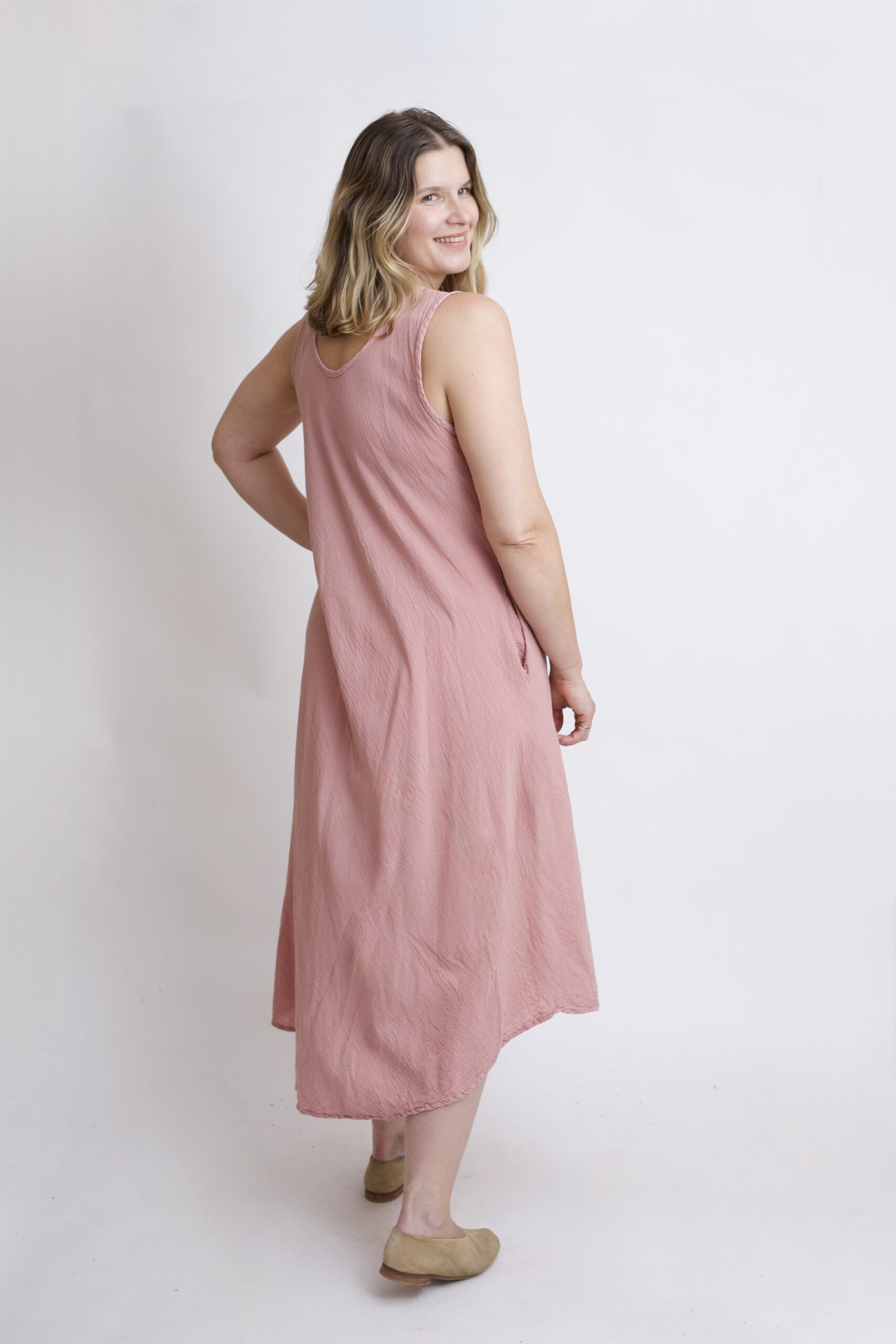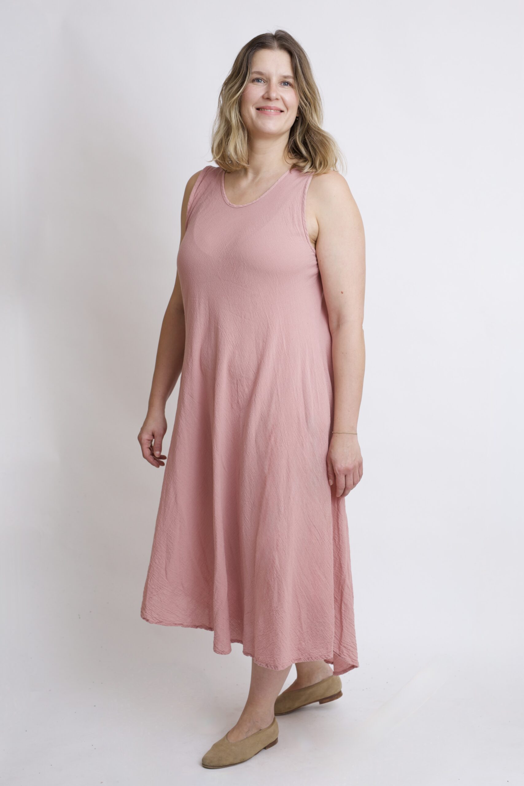 Długa sukienka maxi wykonana z czystej bawełny w kolorze róż pudrowy. Fason w kształcie litery „A” zapewnia wygodę noszenia, ładnie układa się na sylwetce i daje swobodę ruchów. Naturalny materiał sprawia, że sukienka jest przewiewna i idealna na co dzień – zarówno na spacer, do pracy, jak i na letnie wyjścia.