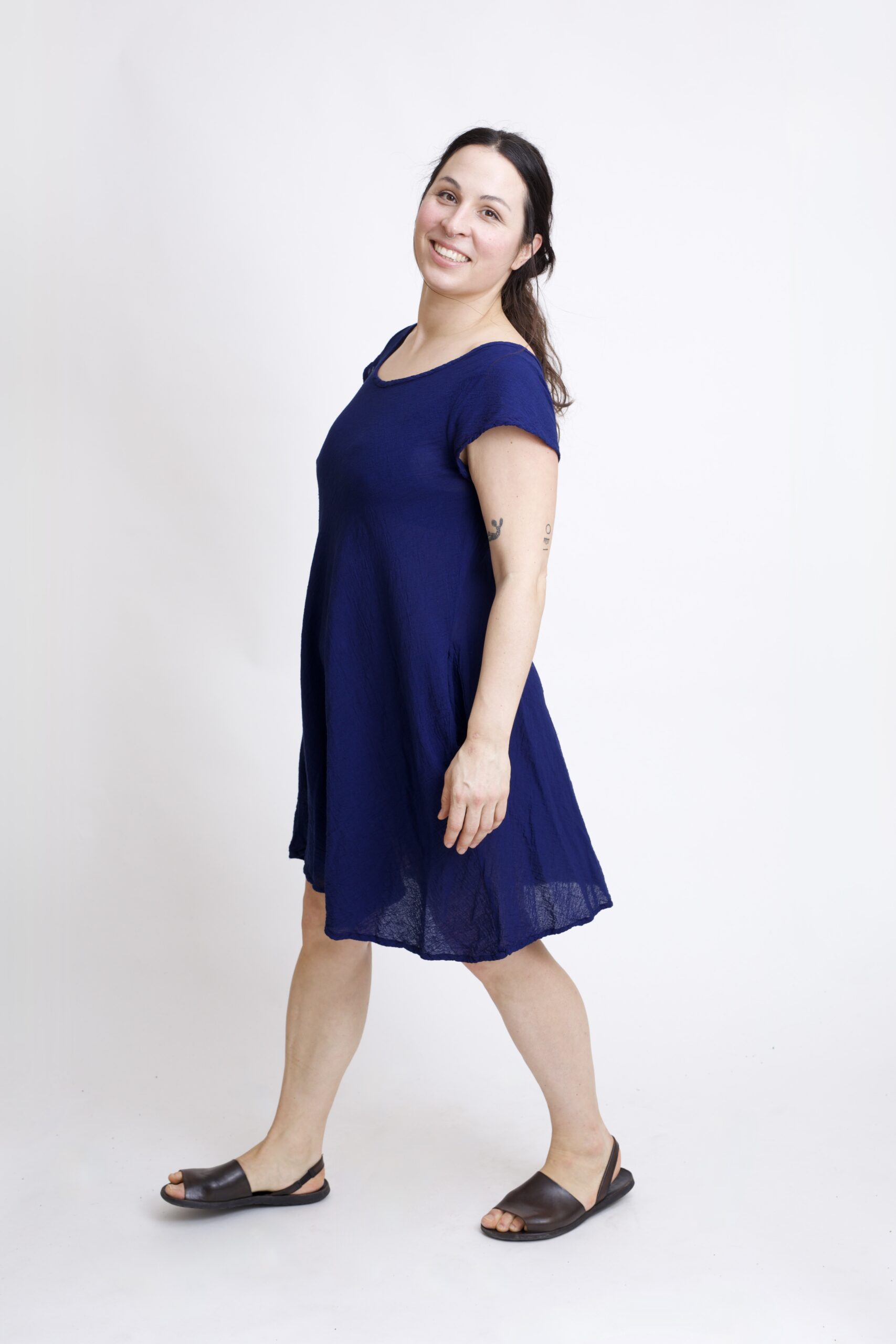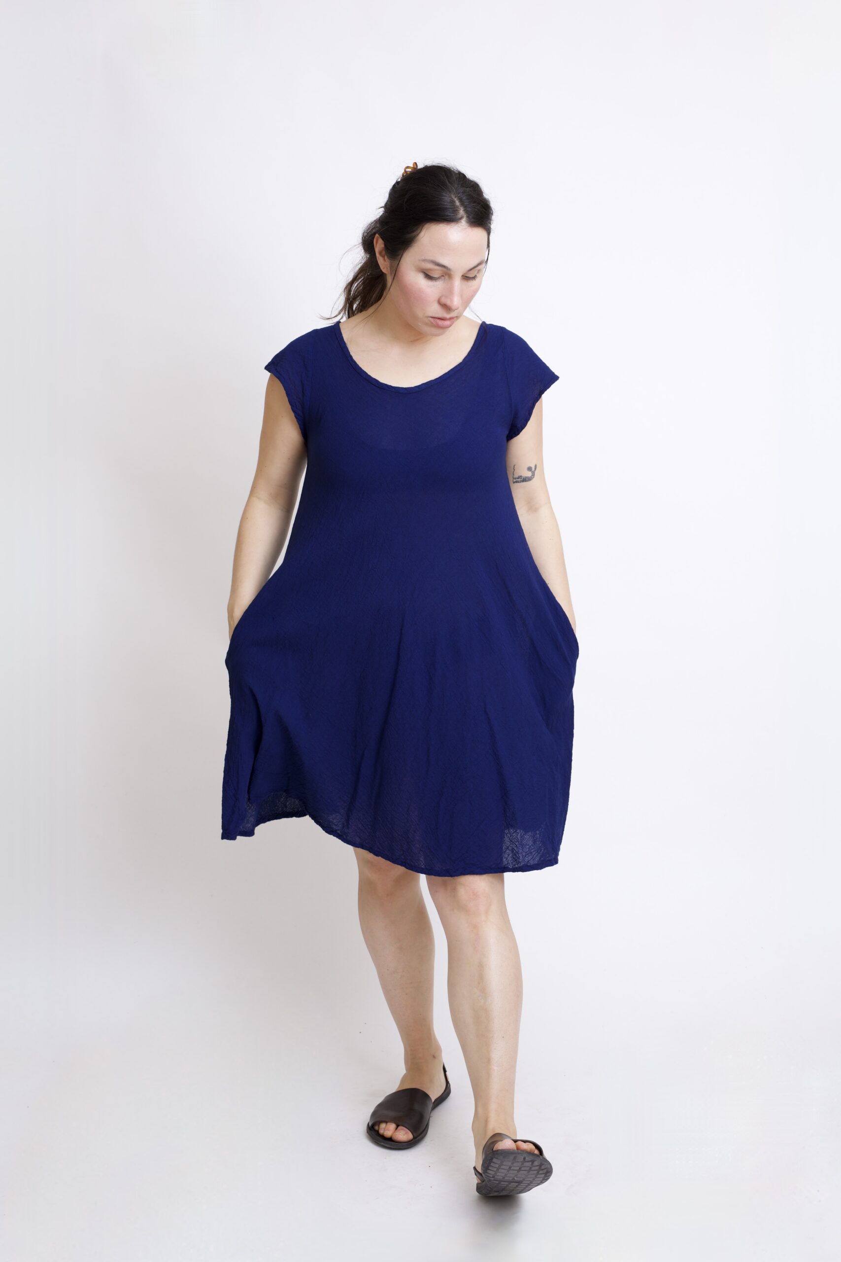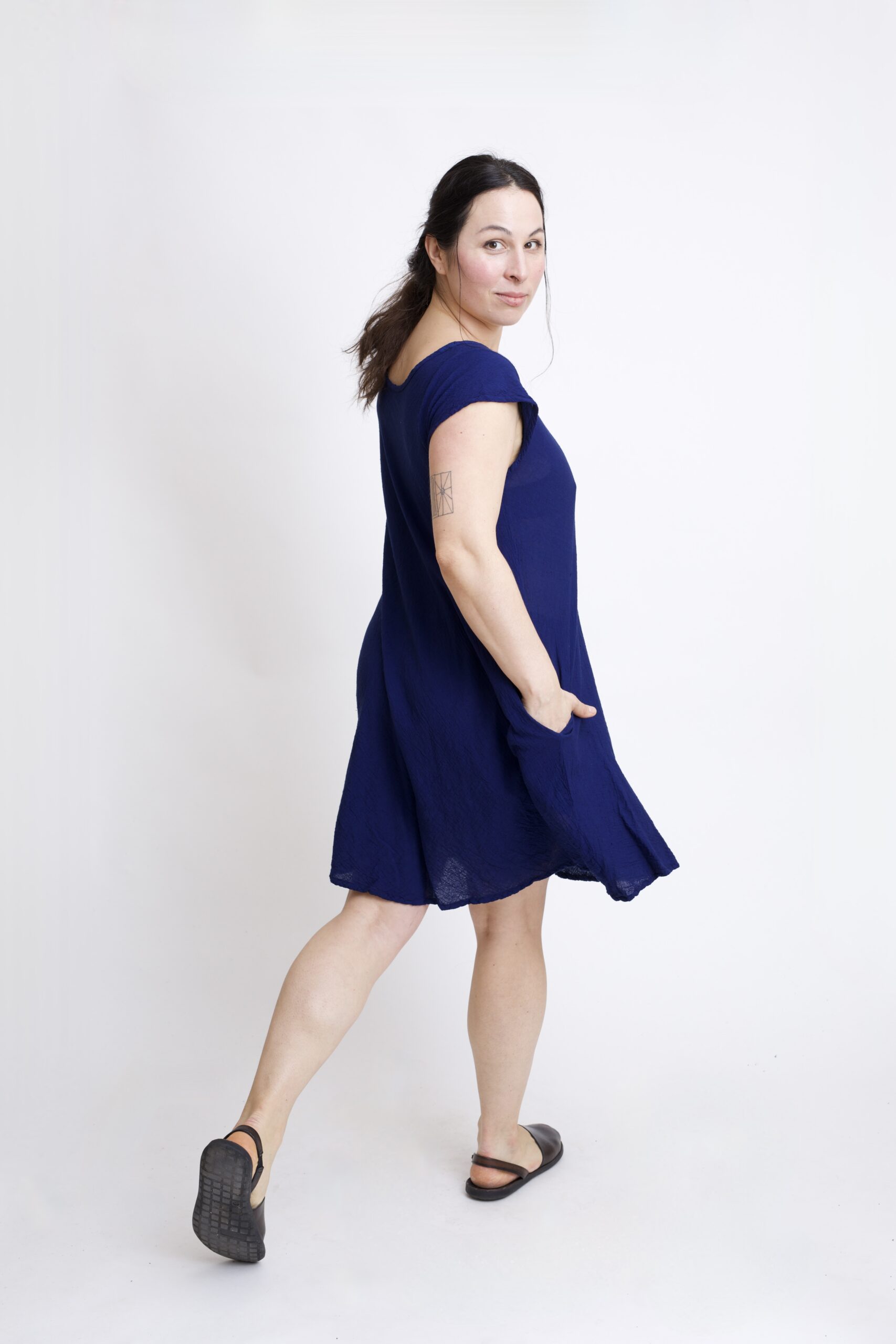 Bawełniana sukienka mini z czystej bawełny z charakterystycznymi „skrzydełkami” na ramionach. Sukienka, która zapewnia przewiewność i komfort noszenia przez cały dzień. Luźny krój, rozszerzający się ku dołowi, pięknie układa się na sylwetce i nie krępuje ruchów. Uniwersalny model z kieszeniami sprawdzi się zarówno w codziennych, jak i letnich stylizacjach. Sukienka w kolorze granatowo-niebieskim.