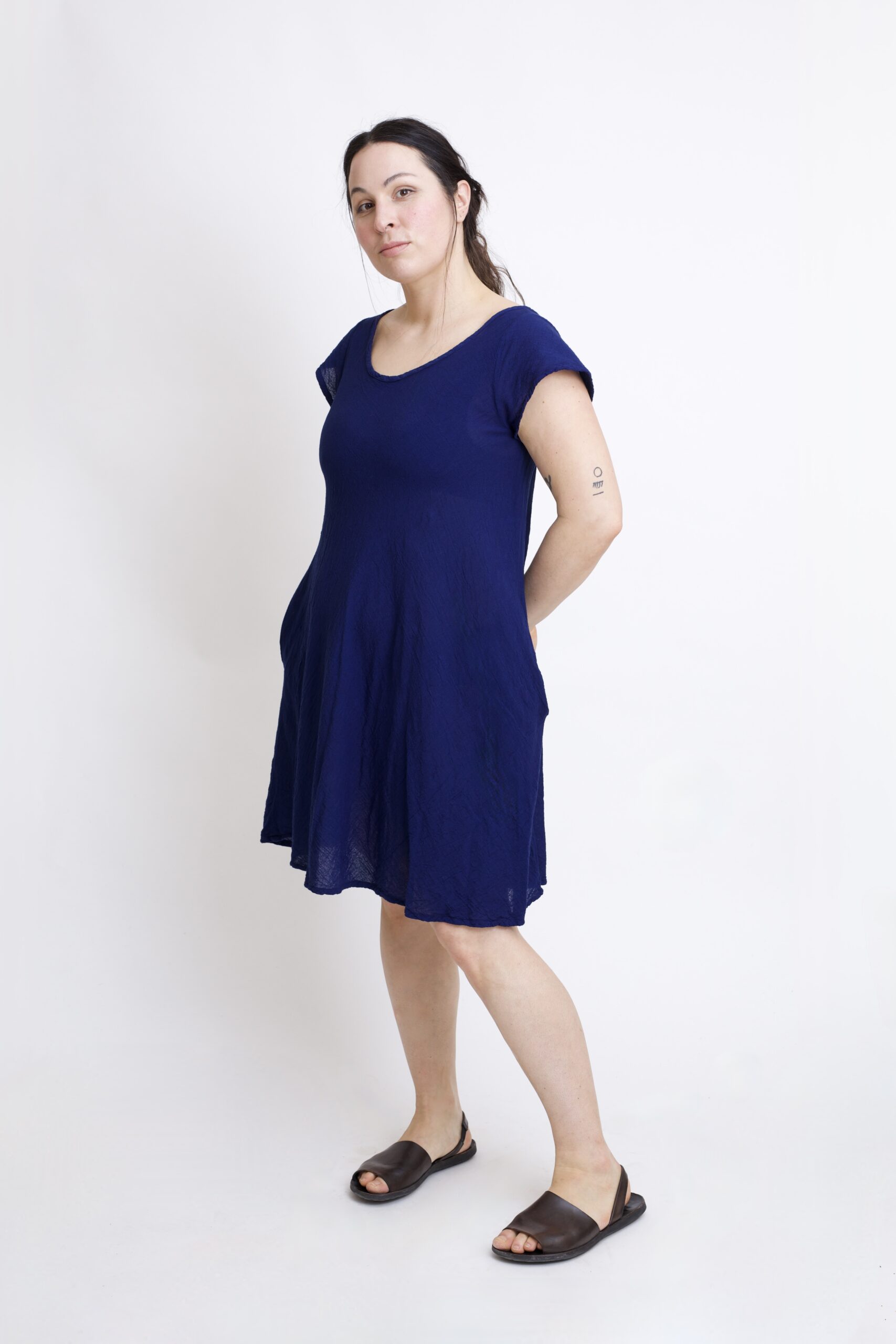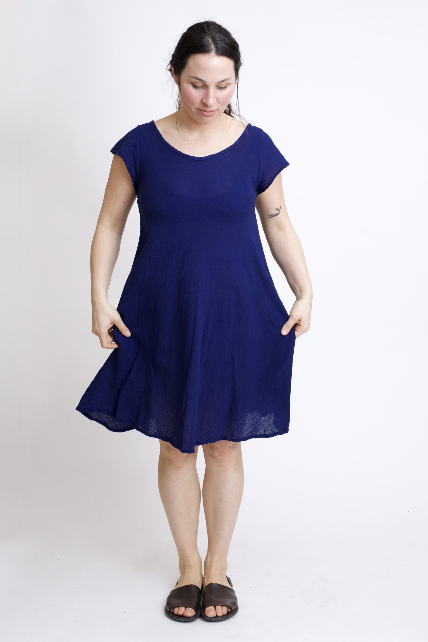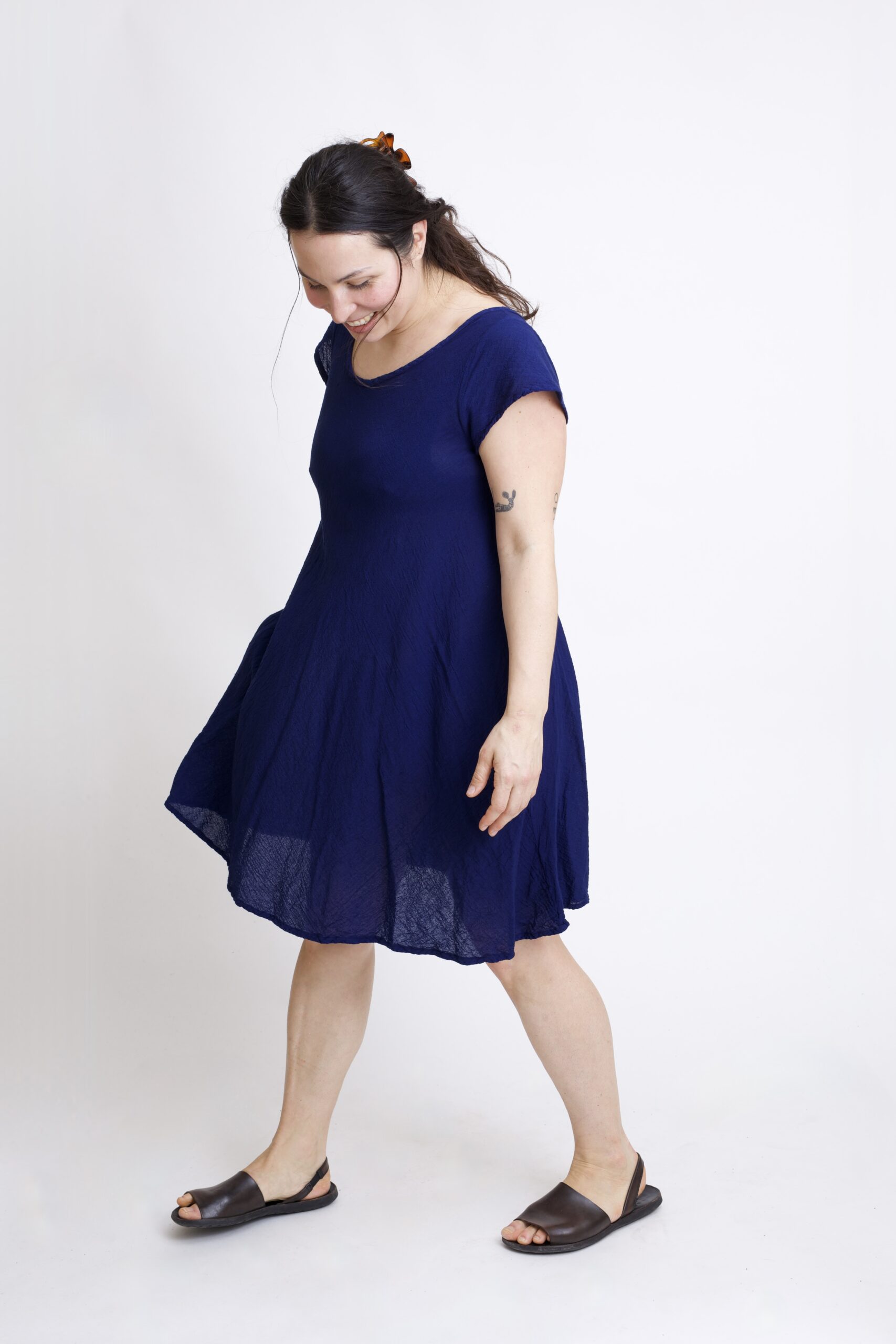 Bawełniana sukienka mini z czystej bawełny z charakterystycznymi „skrzydełkami” na ramionach. Sukienka, która zapewnia przewiewność i komfort noszenia przez cały dzień. Luźny krój, rozszerzający się ku dołowi, pięknie układa się na sylwetce i nie krępuje ruchów. Uniwersalny model z kieszeniami sprawdzi się zarówno w codziennych, jak i letnich stylizacjach. Sukienka w kolorze granatowo-niebieskim.