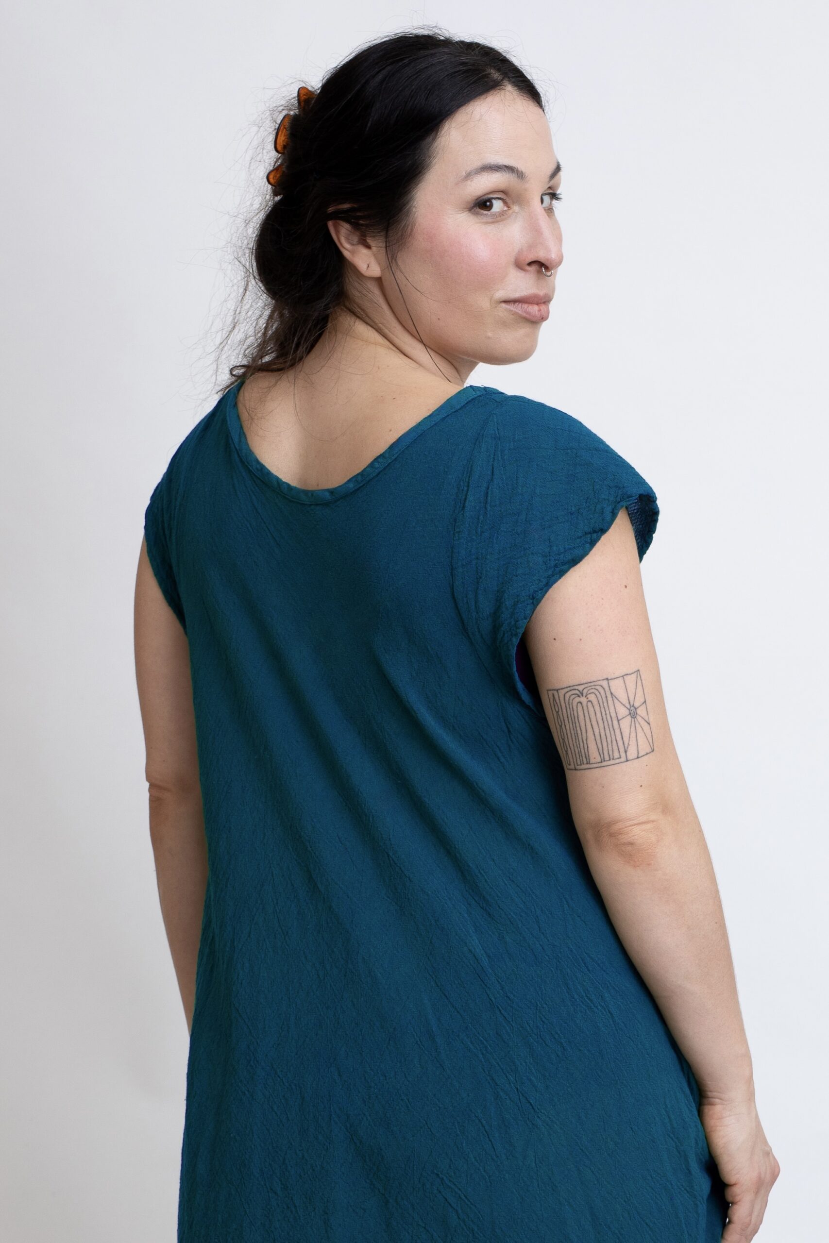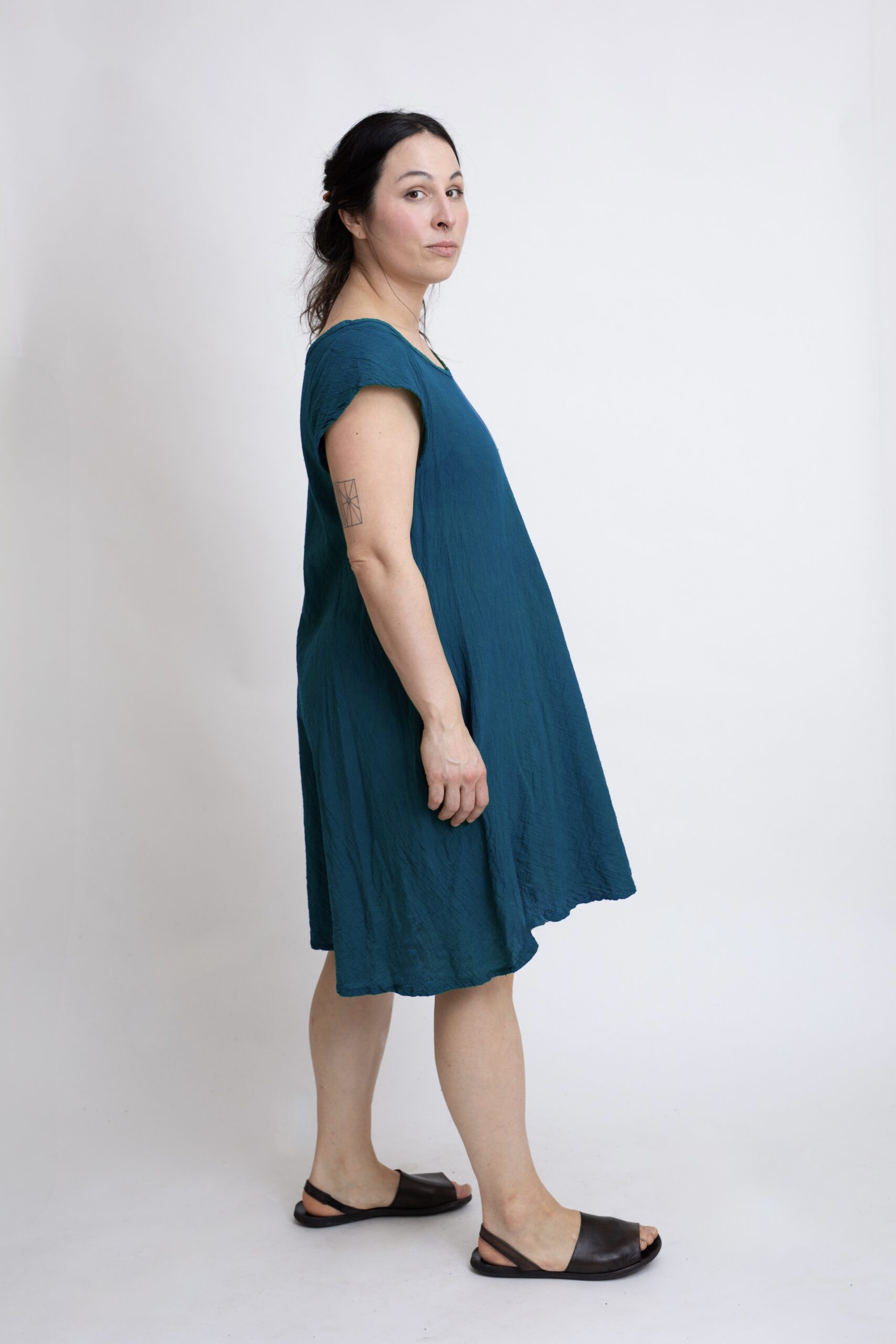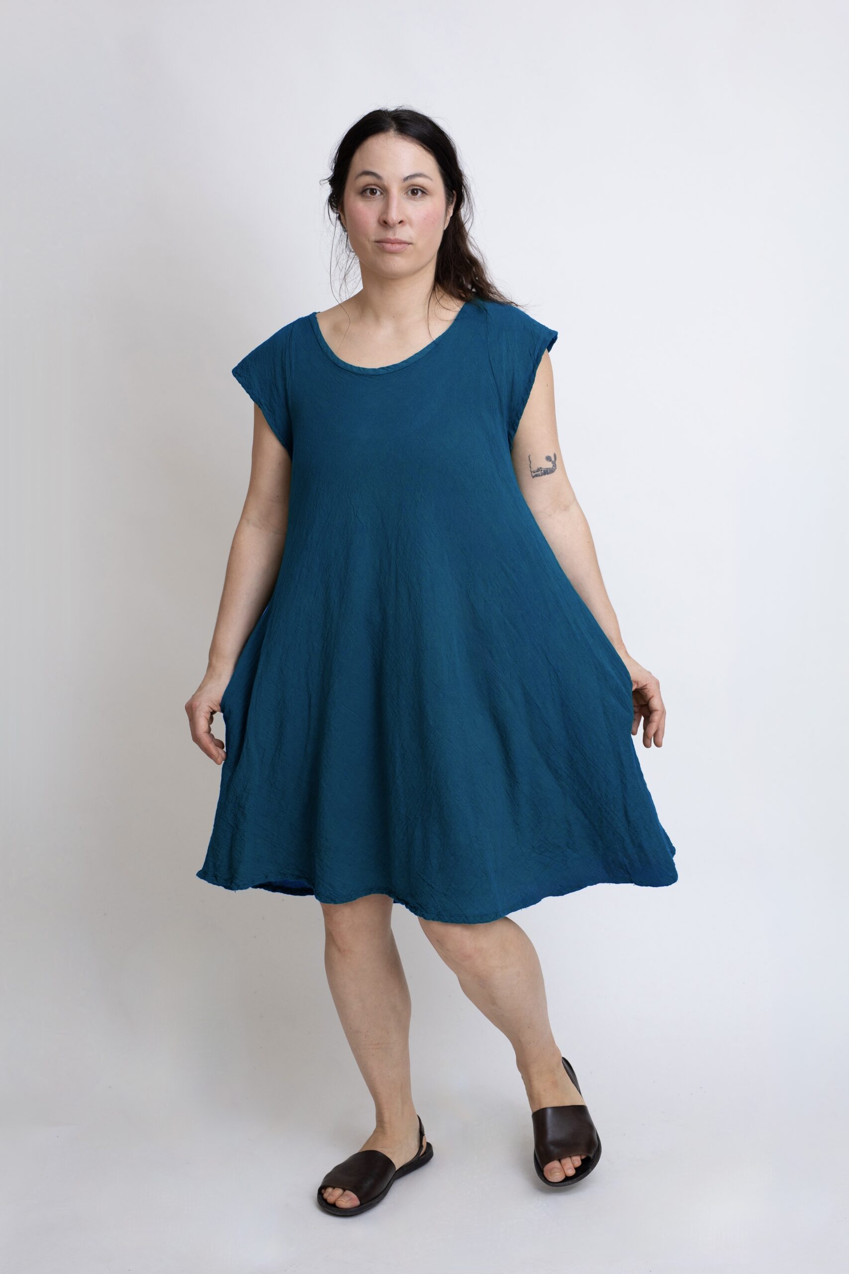Bawełniana sukienka mini z czystej bawełny z charakterystycznymi „skrzydełkami” na ramionach. Sukienka, która zapewnia przewiewność i komfort noszenia przez cały dzień. Luźny krój, rozszerzający się ku dołowi, pięknie układa się na sylwetce i nie krępuje ruchów. Uniwersalny model z kieszeniami sprawdzi się zarówno w codziennych, jak i letnich stylizacjach. Sukienka w kolorze niebieski – petrol.
