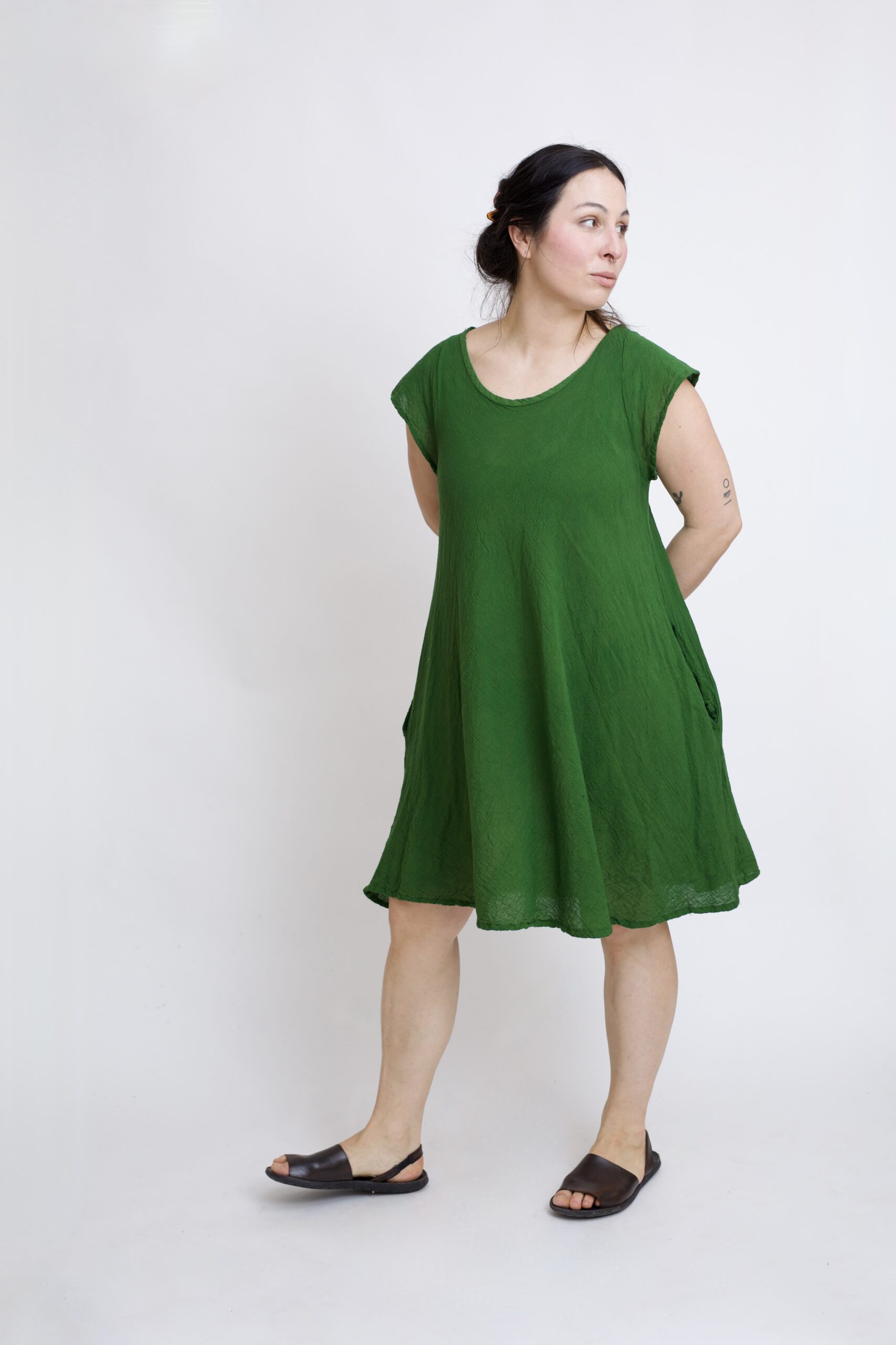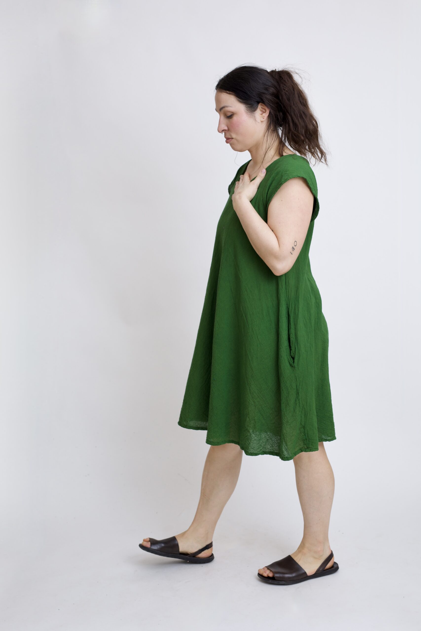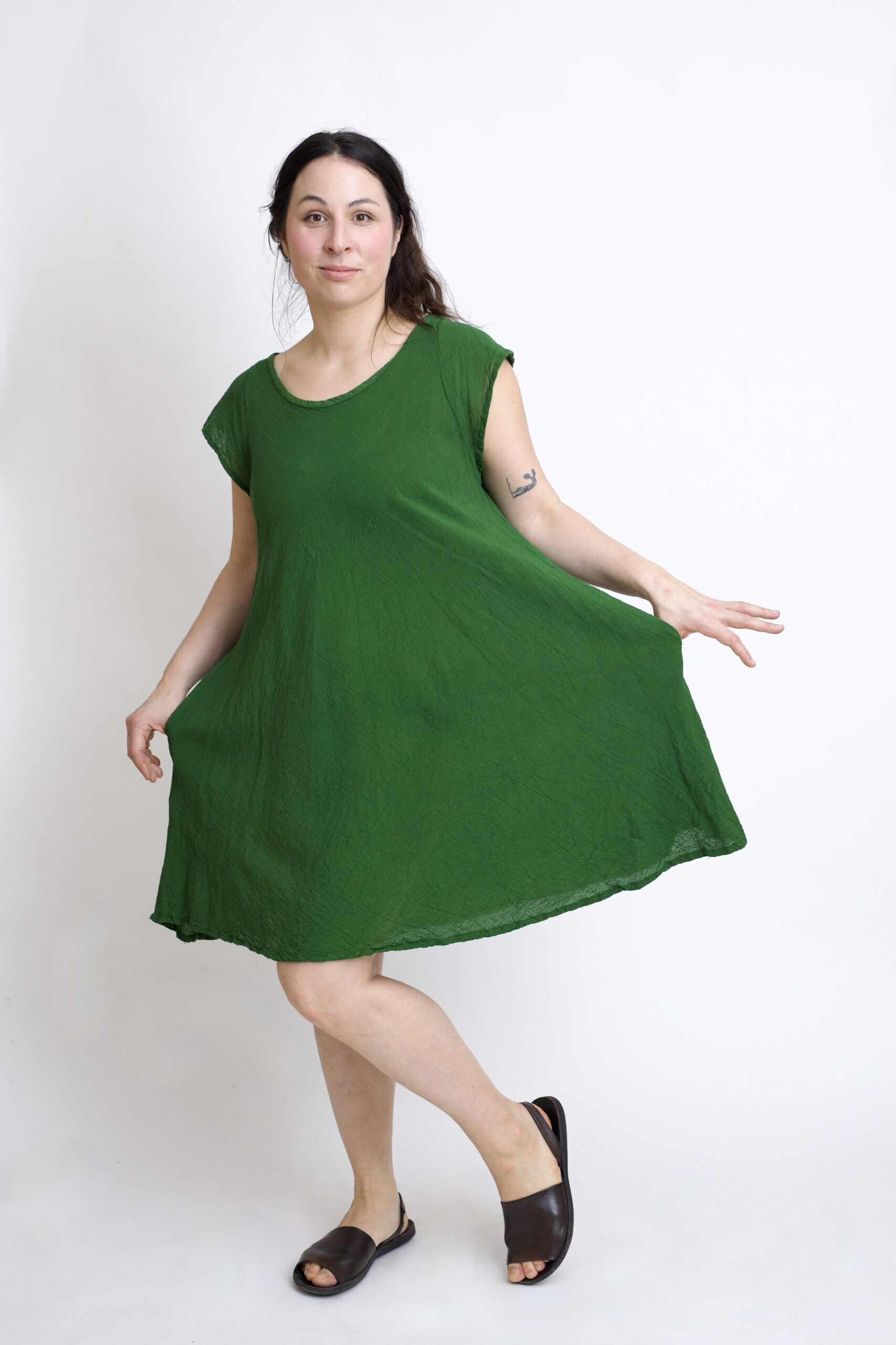 Bawełniana sukienka mini z czystej bawełny z charakterystycznymi „skrzydełkami” na ramionach. Sukienka, która zapewnia przewiewność i komfort noszenia przez cały dzień. Luźny krój, rozszerzający się ku dołowi, pięknie układa się na sylwetce i nie krępuje ruchów. Uniwersalny model z kieszeniami sprawdzi się zarówno w codziennych, jak i letnich stylizacjach. Sukienka w kolorze zielonym.