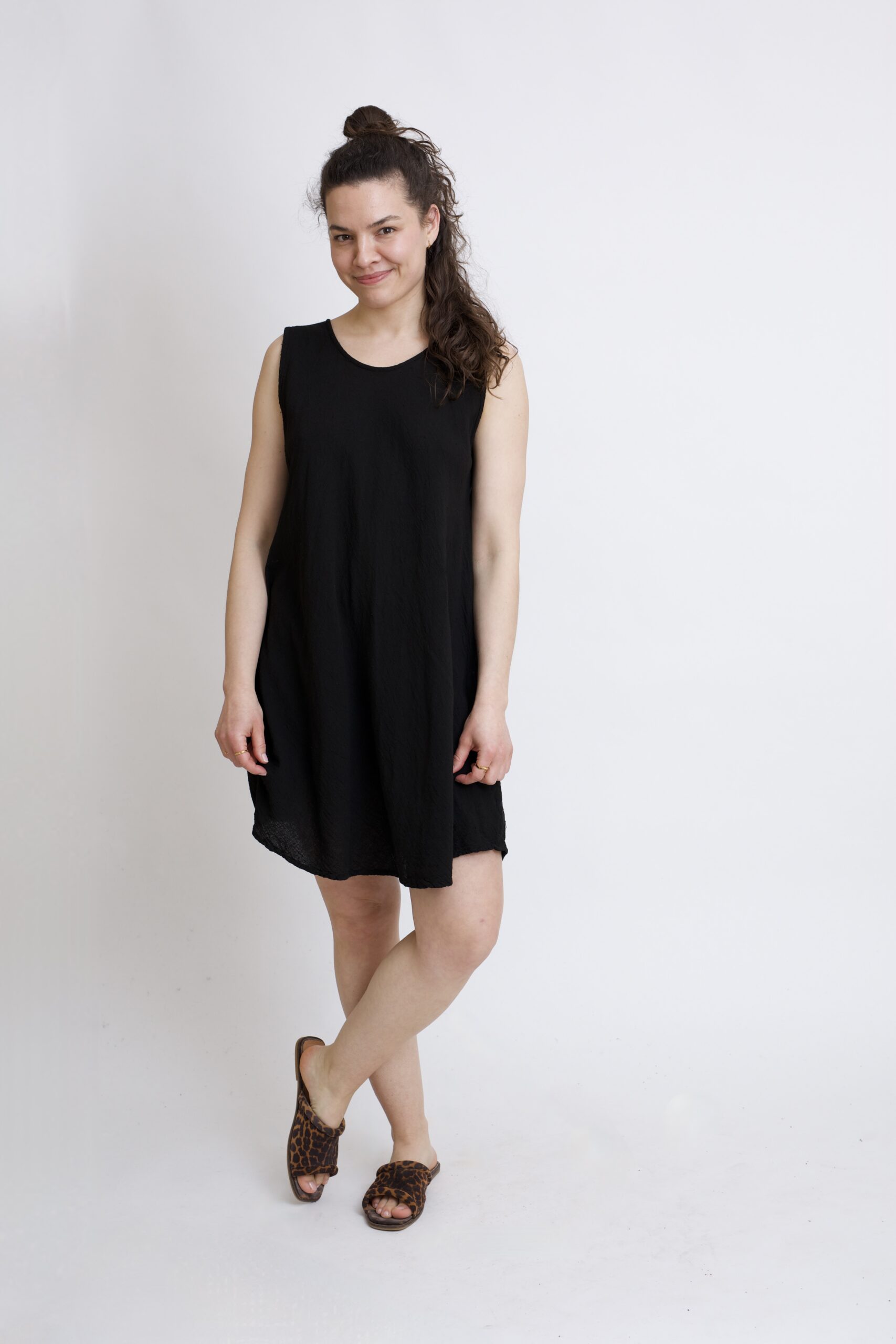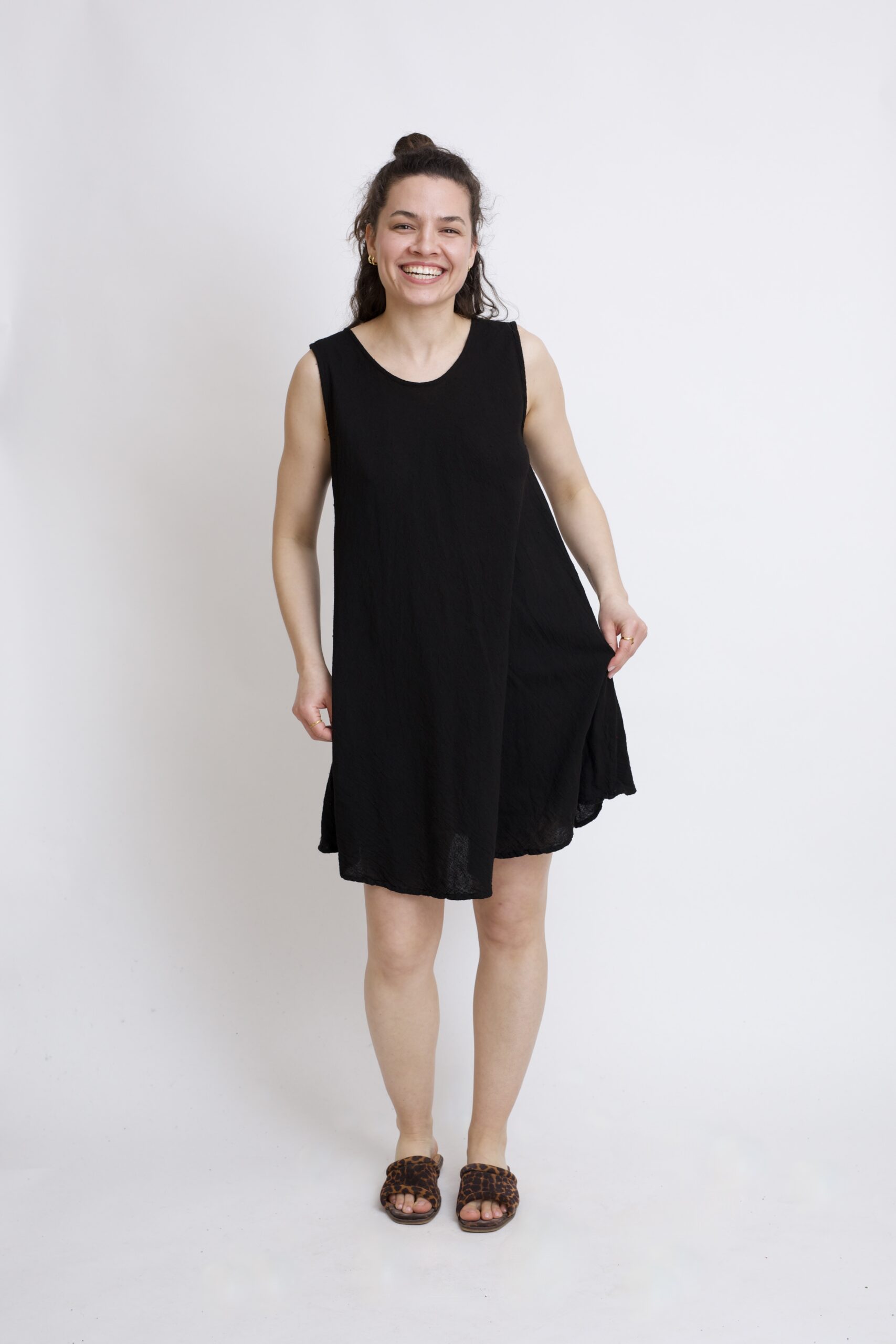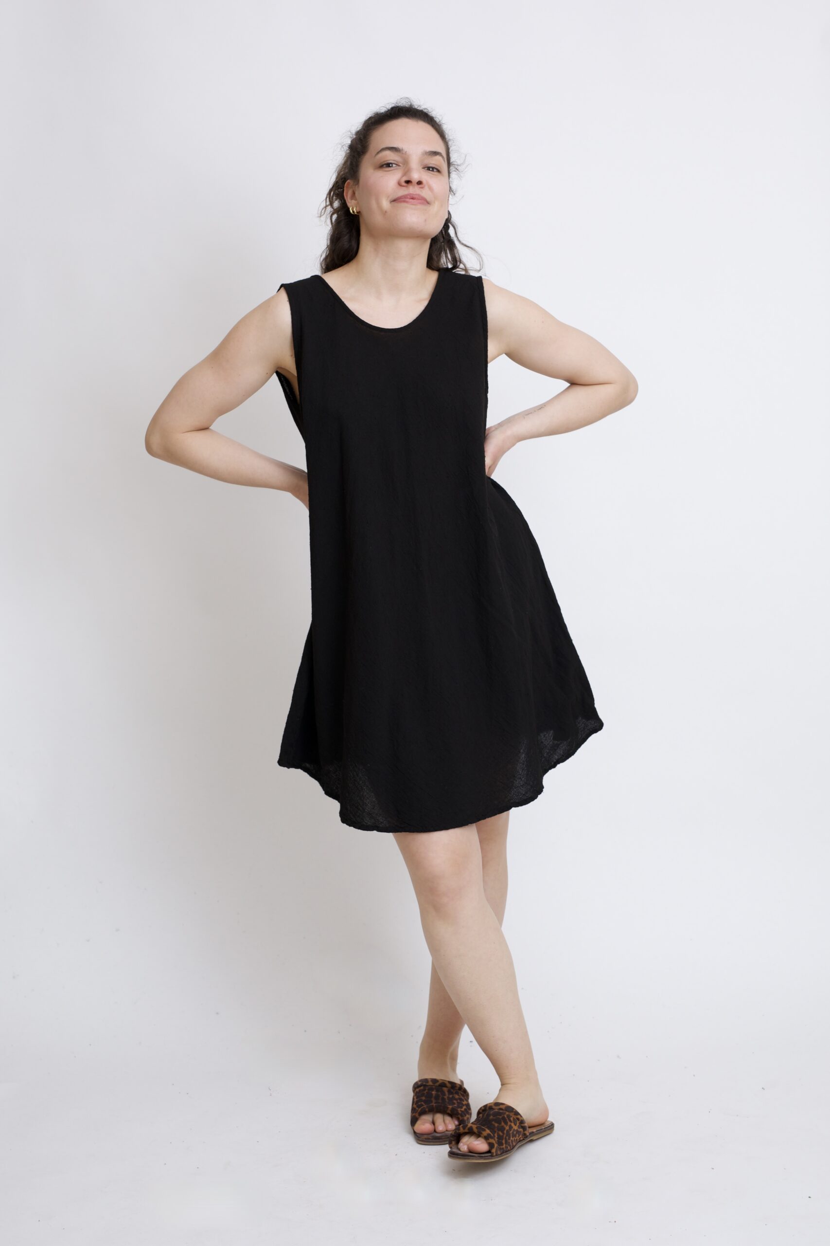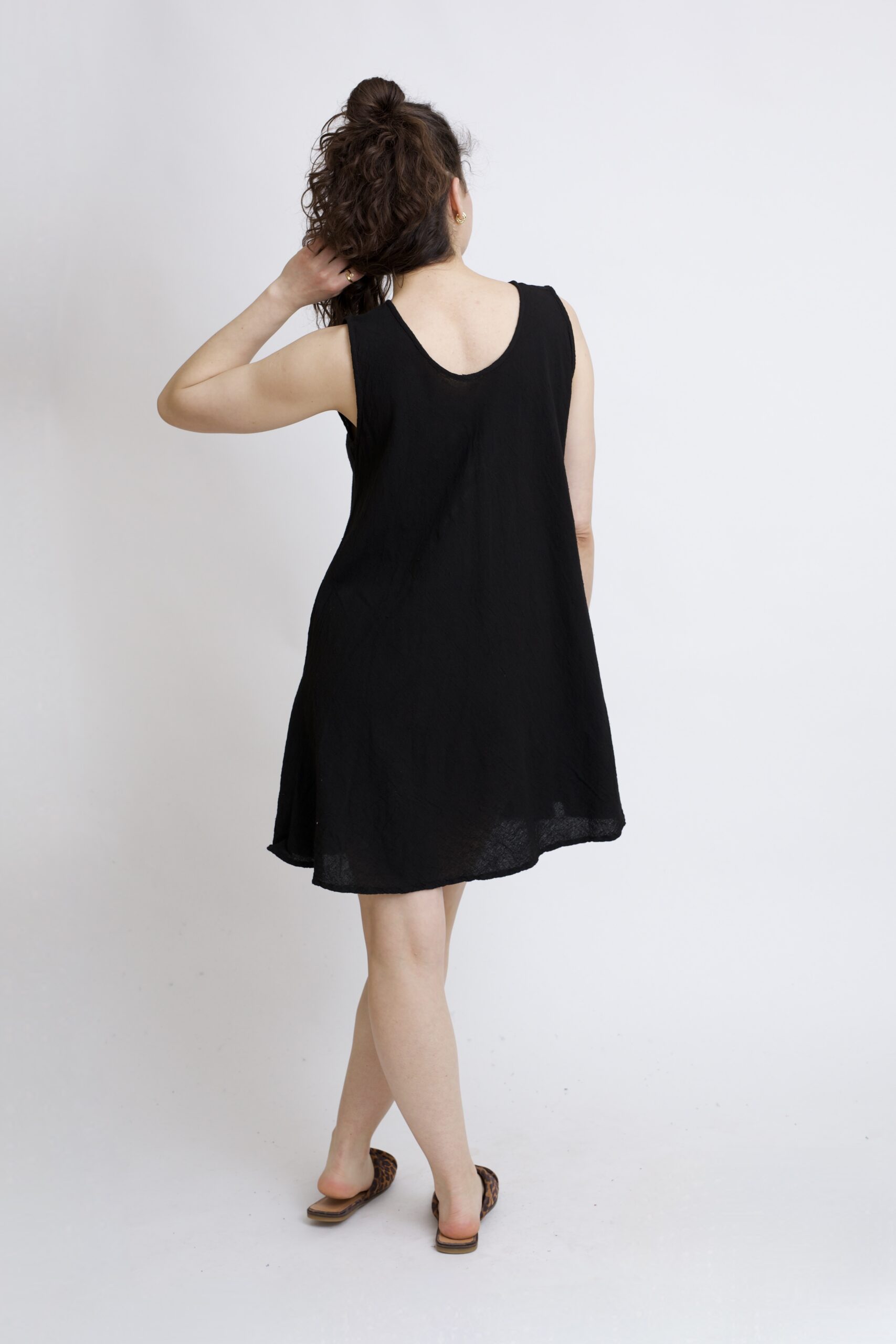 Bawełniana sukienka mini w kolorze czarnym. Klasyczny krój w kształcie litery „A” subtelnie podkreśla talię i zapewnia swobodę ruchów. Prosty ale kobiecy fason sprawdzi się idealnie na co dzień – do pracy, na spacer lub letnie wyjście. Posiada dwie kieszenie.