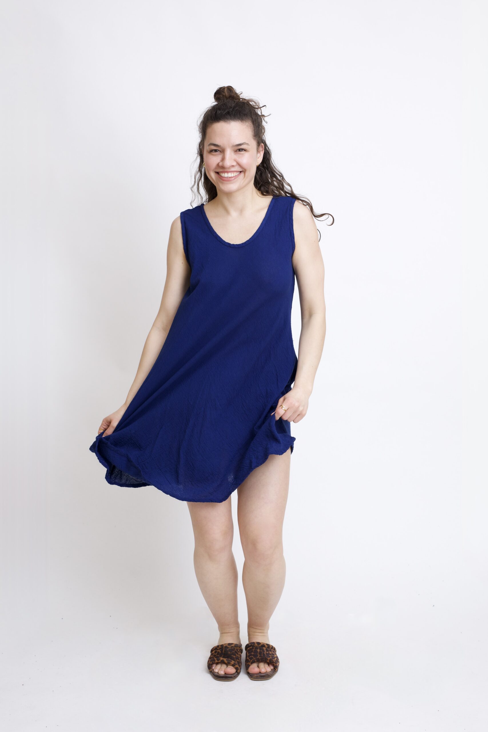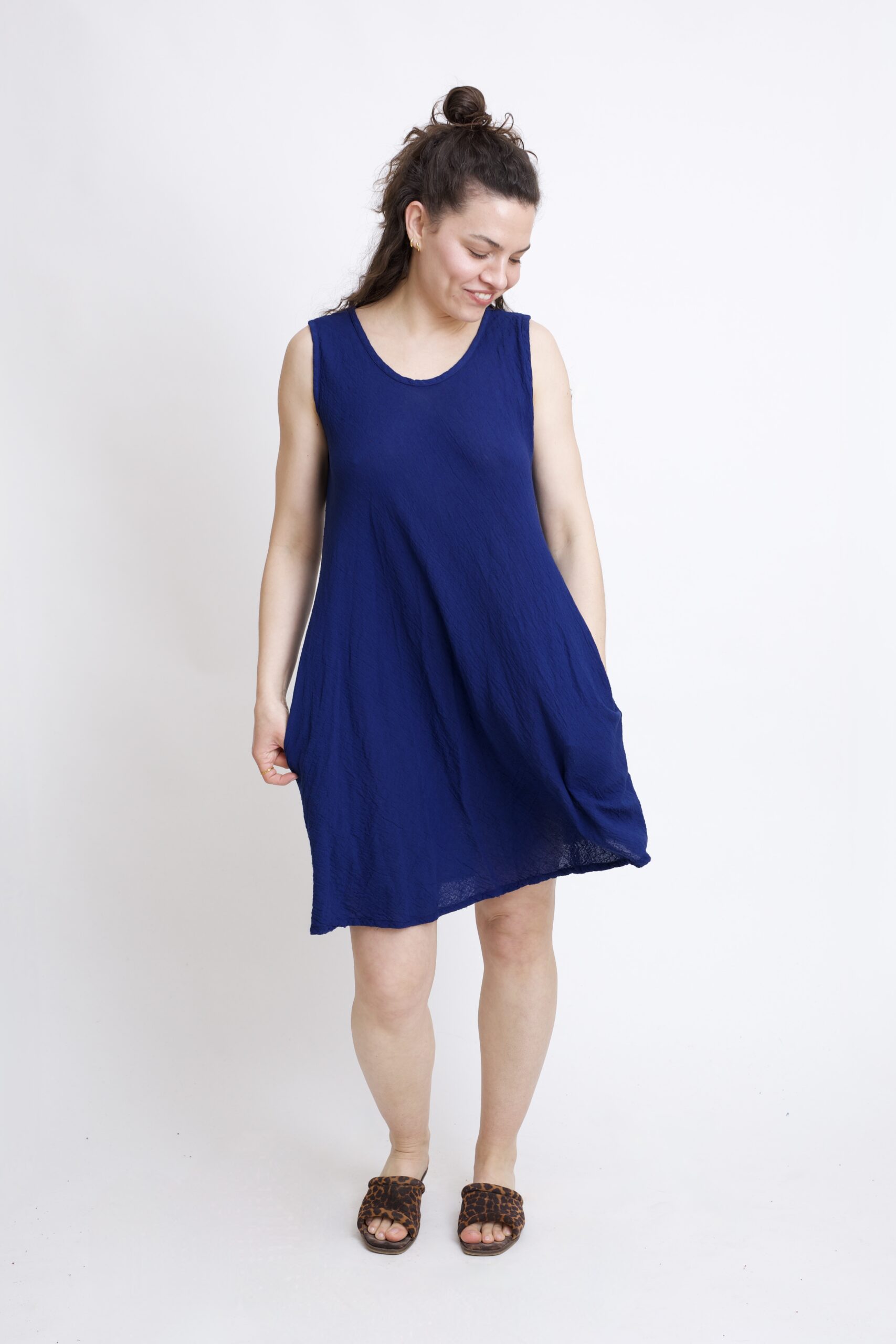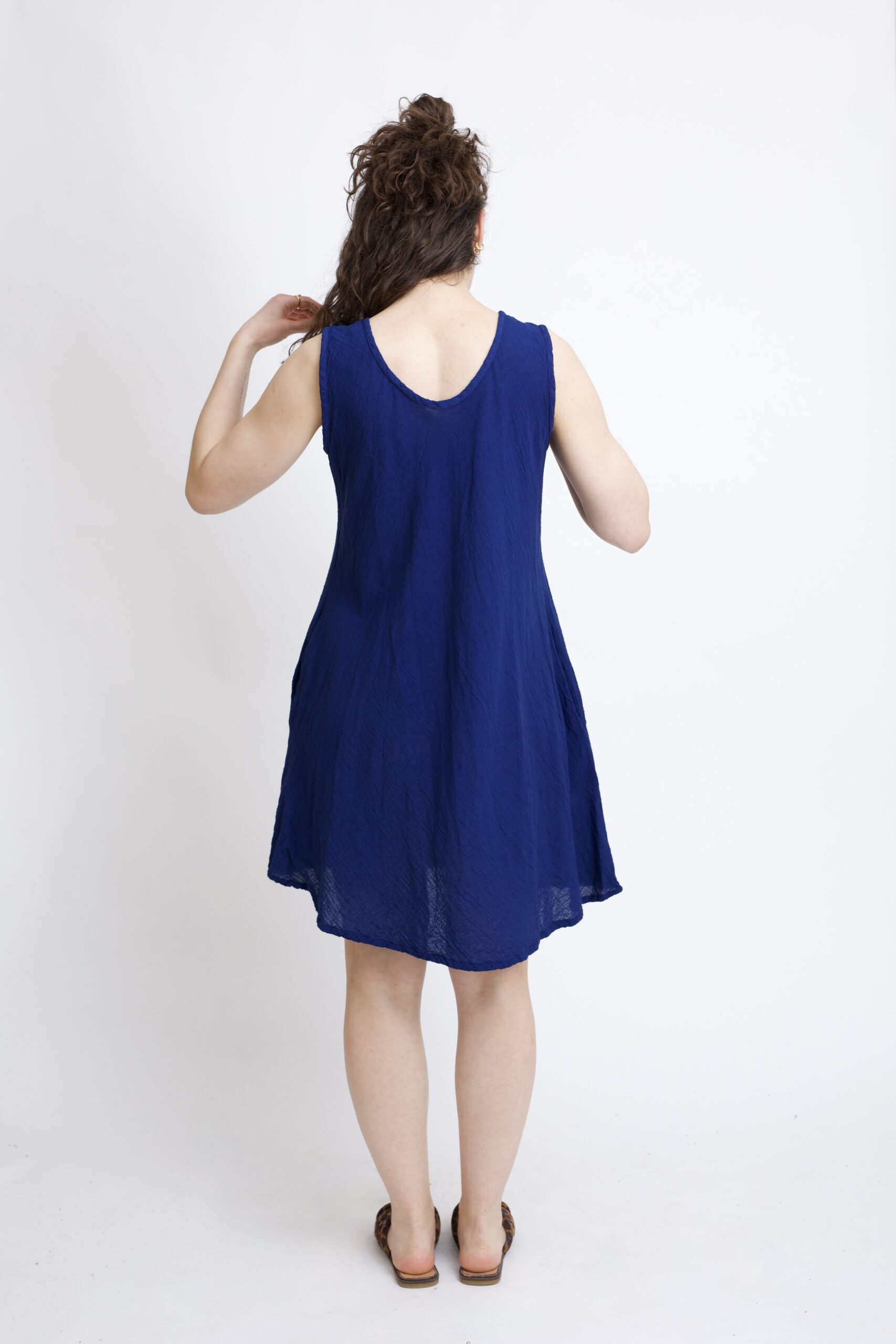 Bawełniana sukienka mini w kolorze granatowo-niebieskim. Klasyczny krój w kształcie litery „A” subtelnie podkreśla talię i zapewnia swobodę ruchów. Prosty ale kobiecy fason sprawdzi się idealnie na co dzień – do pracy, na spacer lub letnie wyjście. Posiada dwie kieszenie.