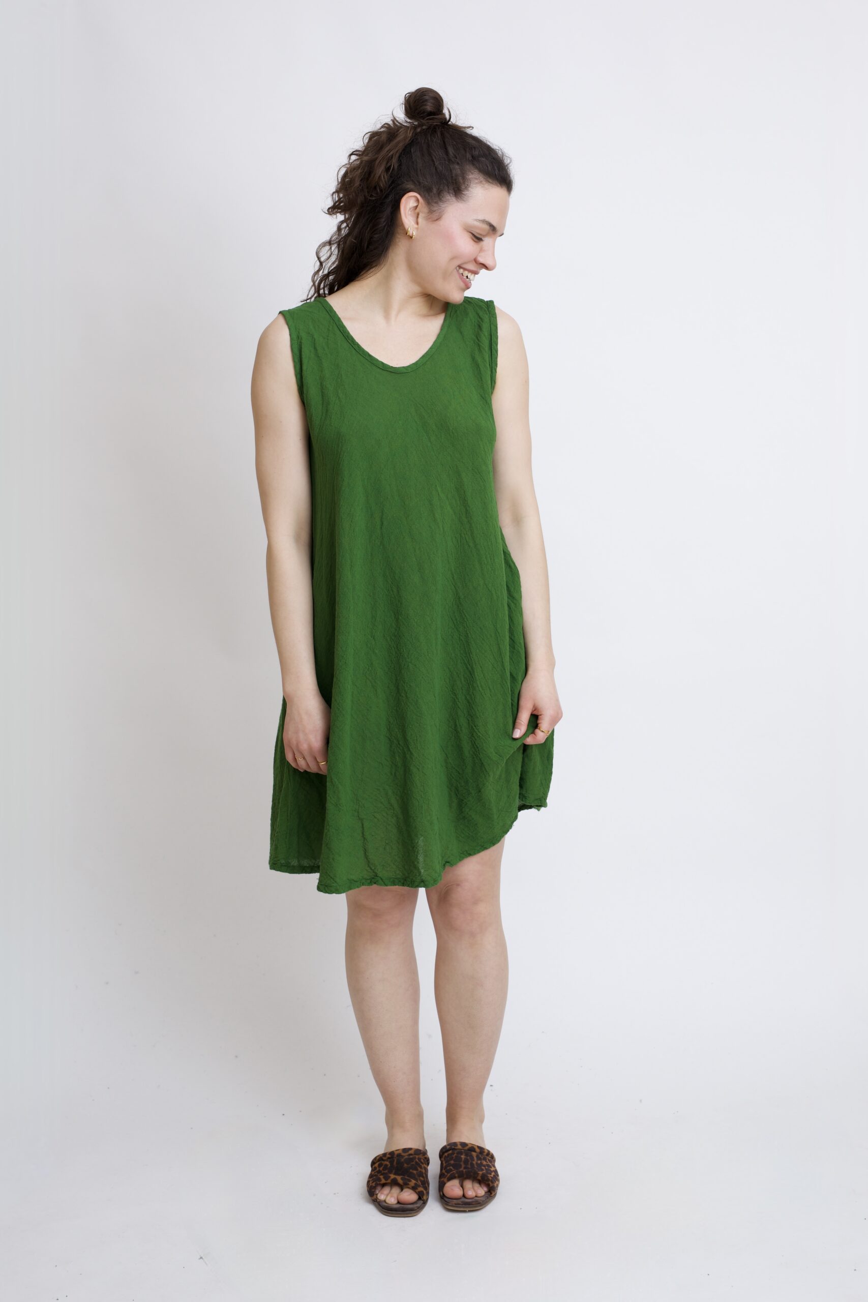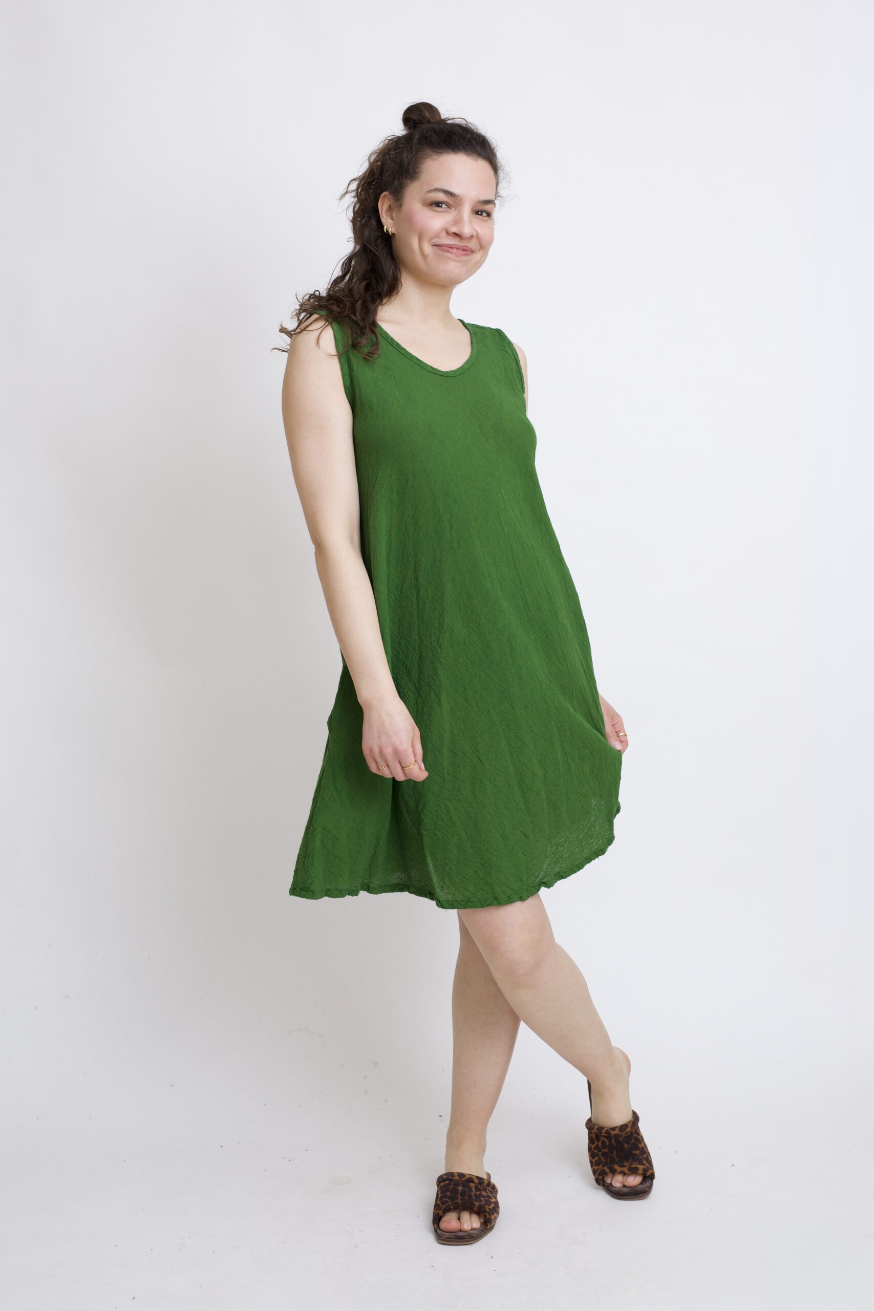 Bawełniana sukienka mini w kolorze zielonym. Klasyczny krój w kształcie litery „A” subtelnie podkreśla talię i zapewnia swobodę ruchów. Prosty ale kobiecy fason sprawdzi się idealnie na co dzień – do pracy, na spacer lub letnie wyjście. Posiada dwie kieszenie.