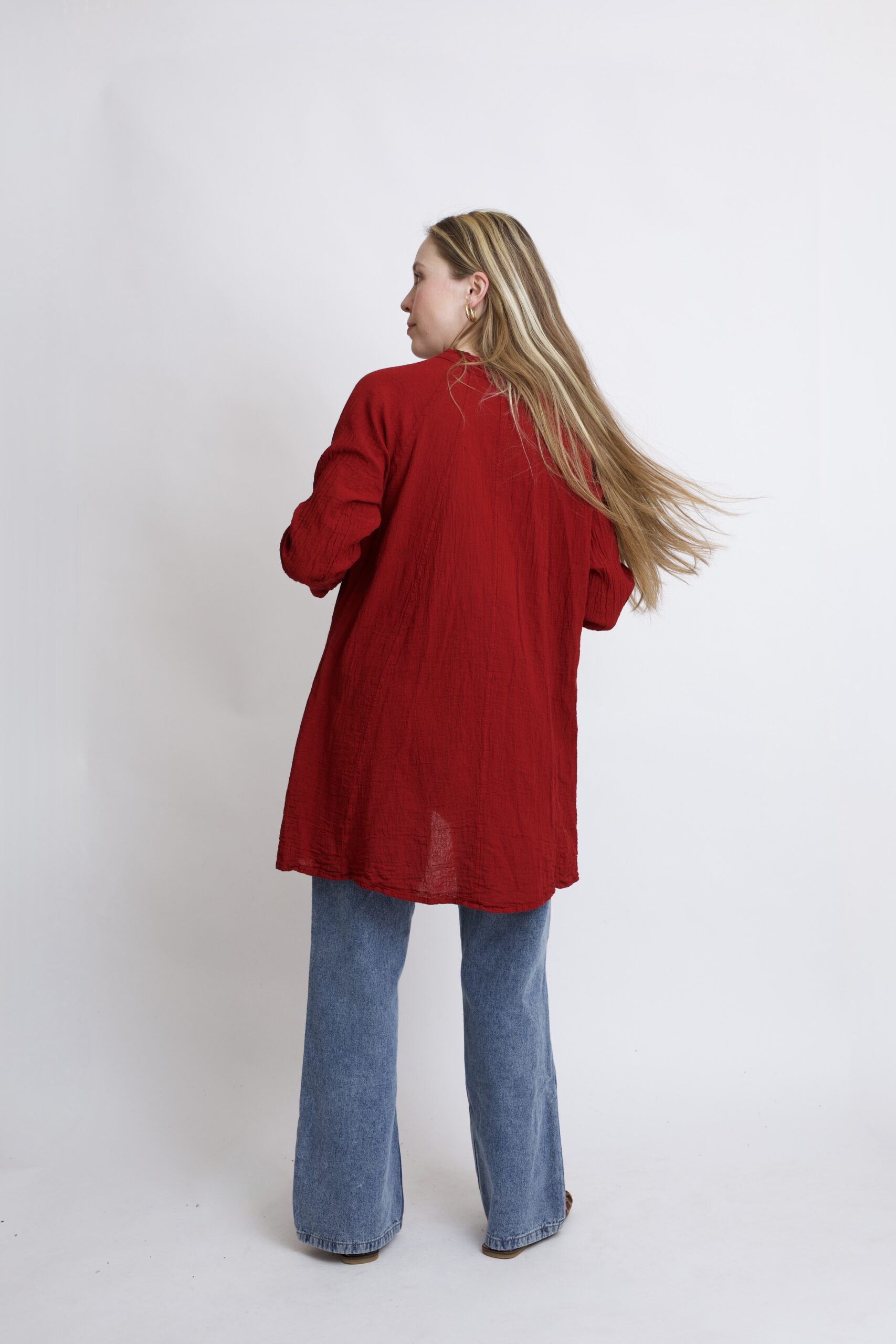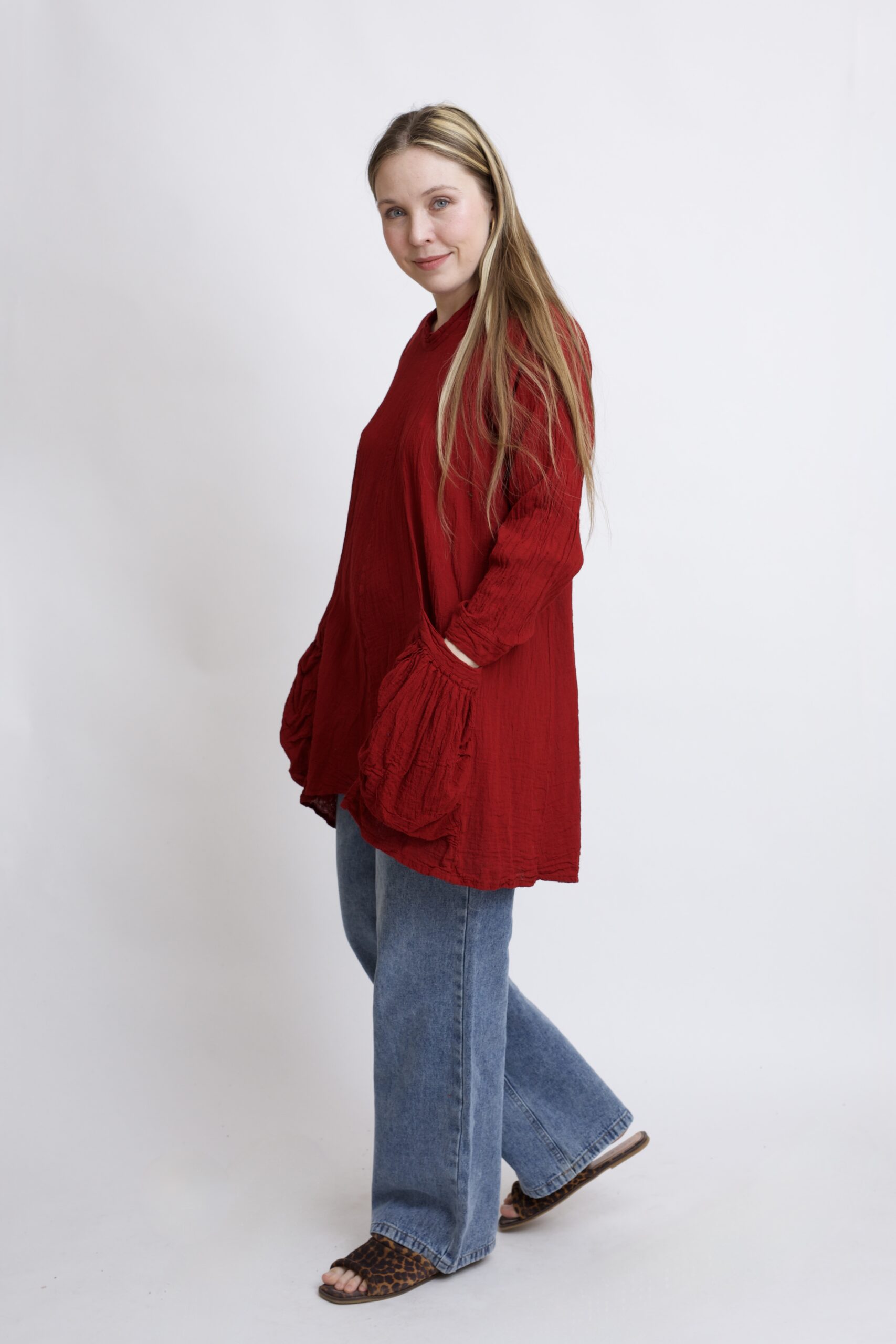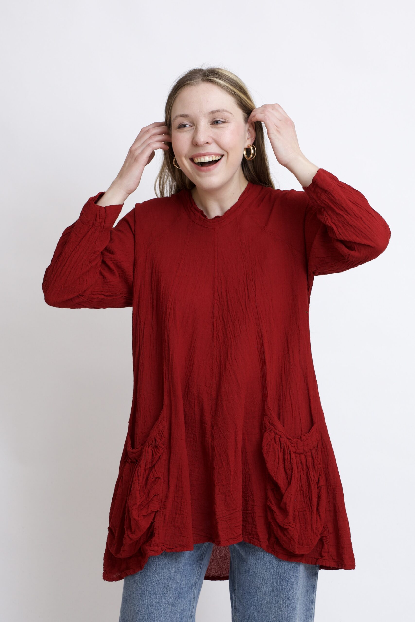 Tunika typu oversize z wysokiej jakości, czystej bawełny. Jej lekko asymetryczna linia dodaje sylwetce lekkości i swobody, a duże, głębokie kieszenie są nie tylko praktyczne, ale też świetnie podkreślają nowoczesny charakter fasonu. Doskonała na co dzień – do legginsów, jeansów czy jako luźna sukienka. Tunika w kolorze burgundowym.