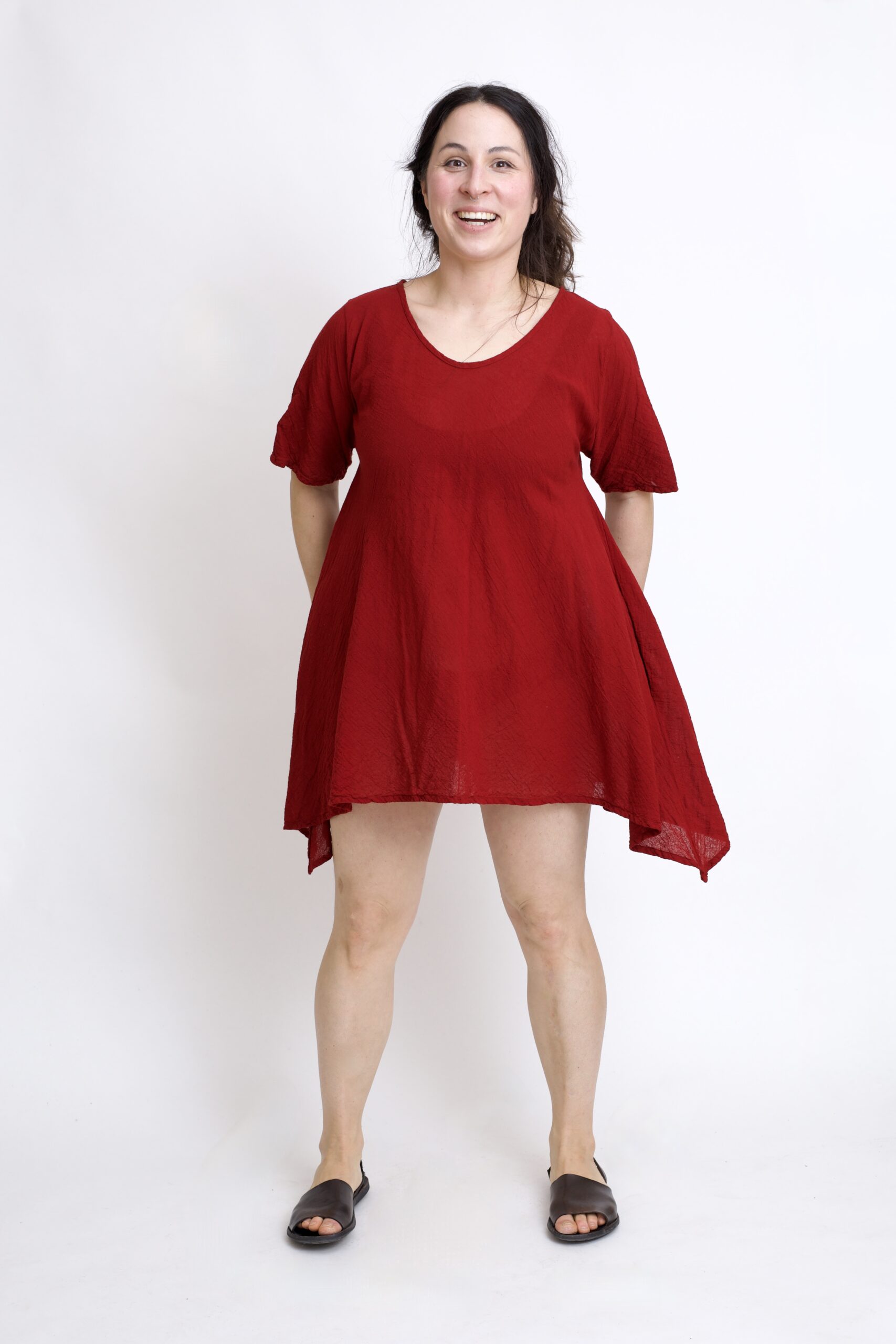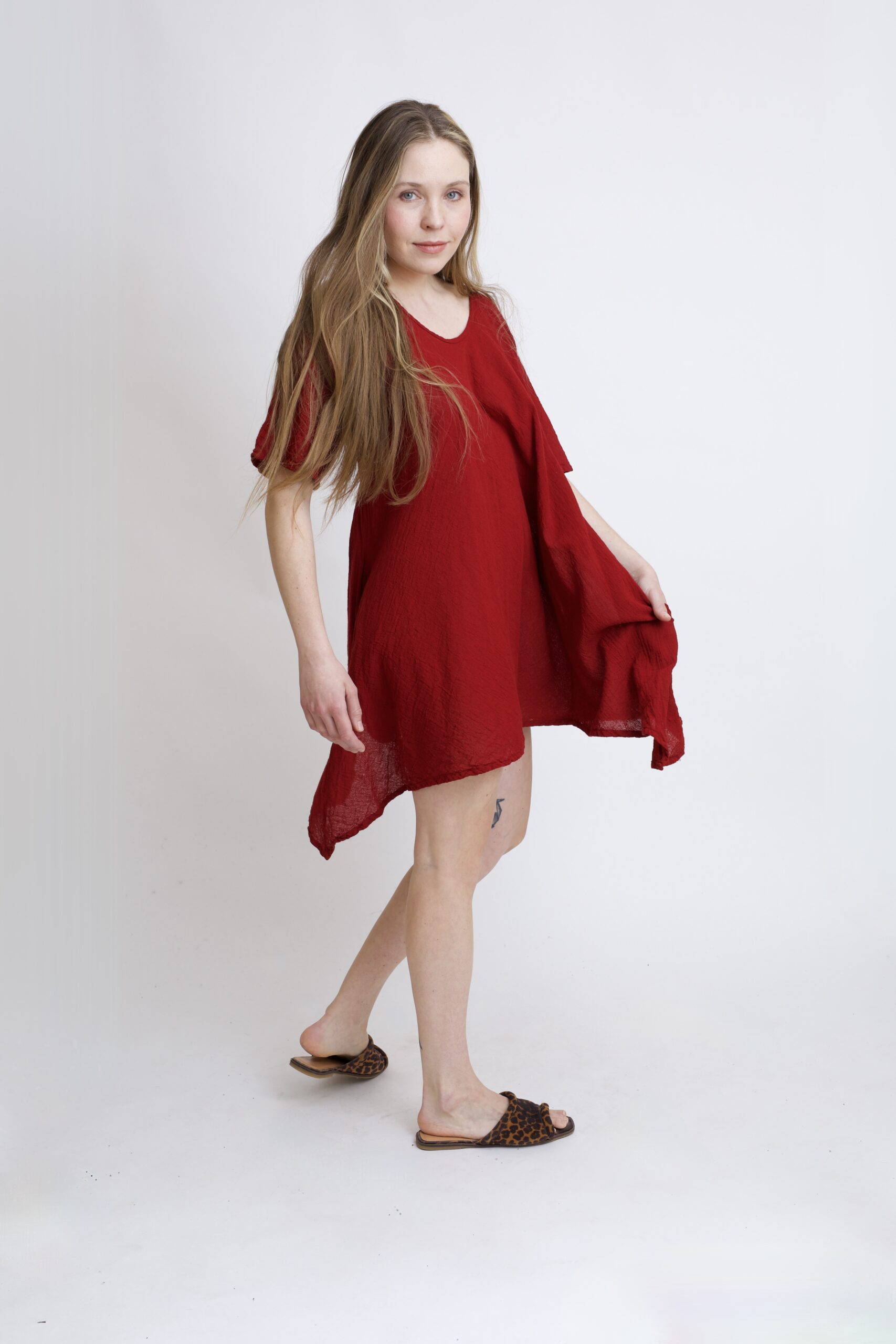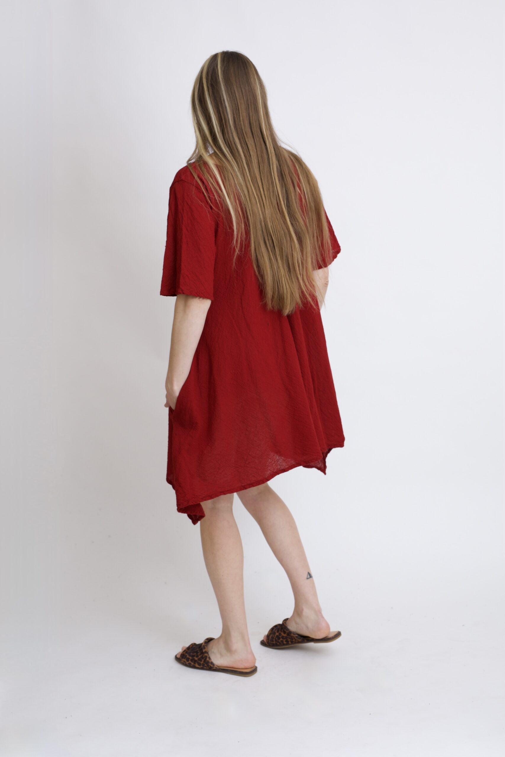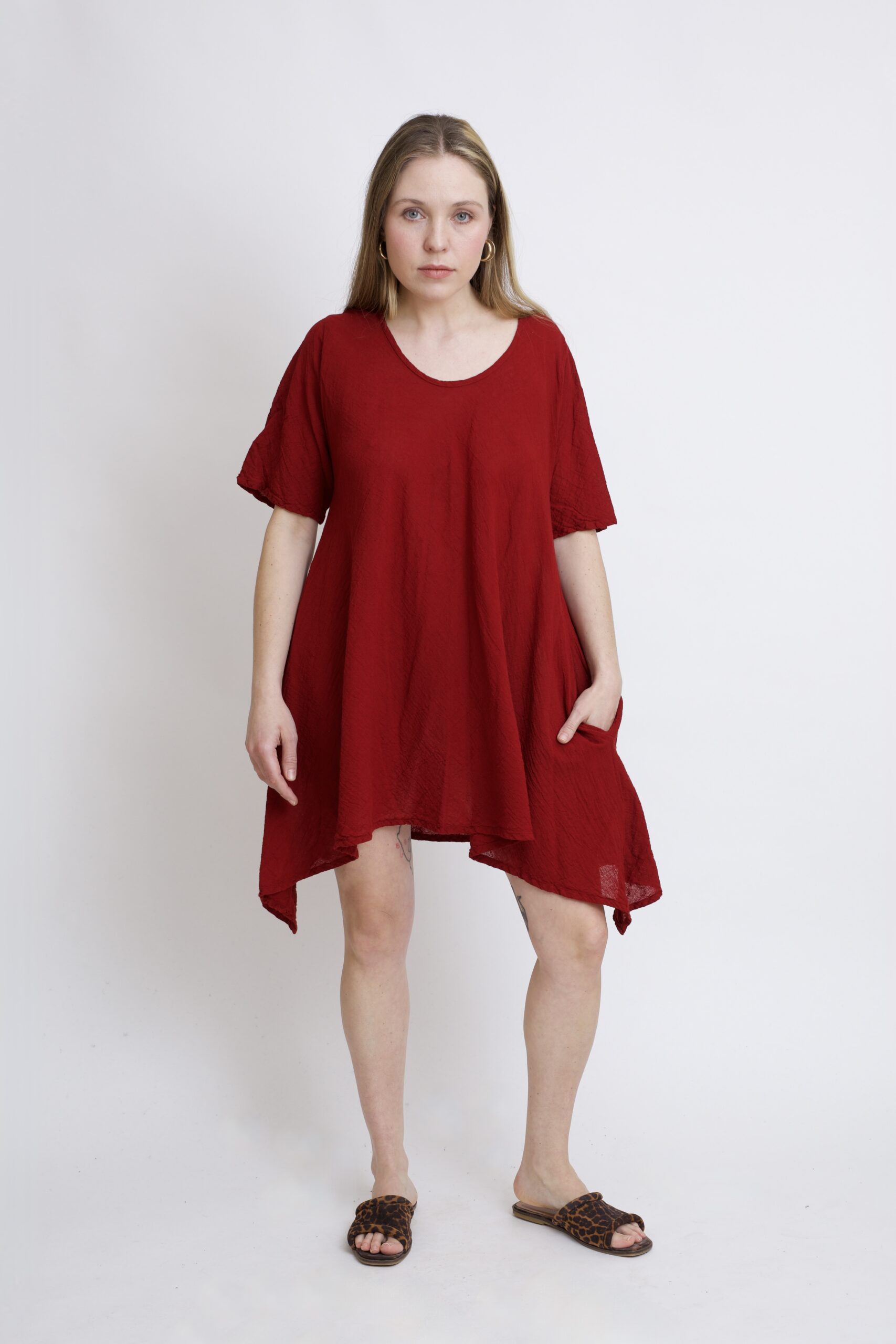 Damska tunika oversize z naturalnej, czystej bawełny. Tunika o charakterystycznym kroju z wydłużonymi bokami, zwanymi ogonami. Asymetryczny fason nadaje jej lekkości i sprawia, że tunika ciekawie układa się w ruchu. To uniwersalny model, który łatwo połączyć z legginsami, spodniami lub jeansami, tworząc wygodną i stylową stylizację na co dzień. Tunika w kolorze burgundowym.