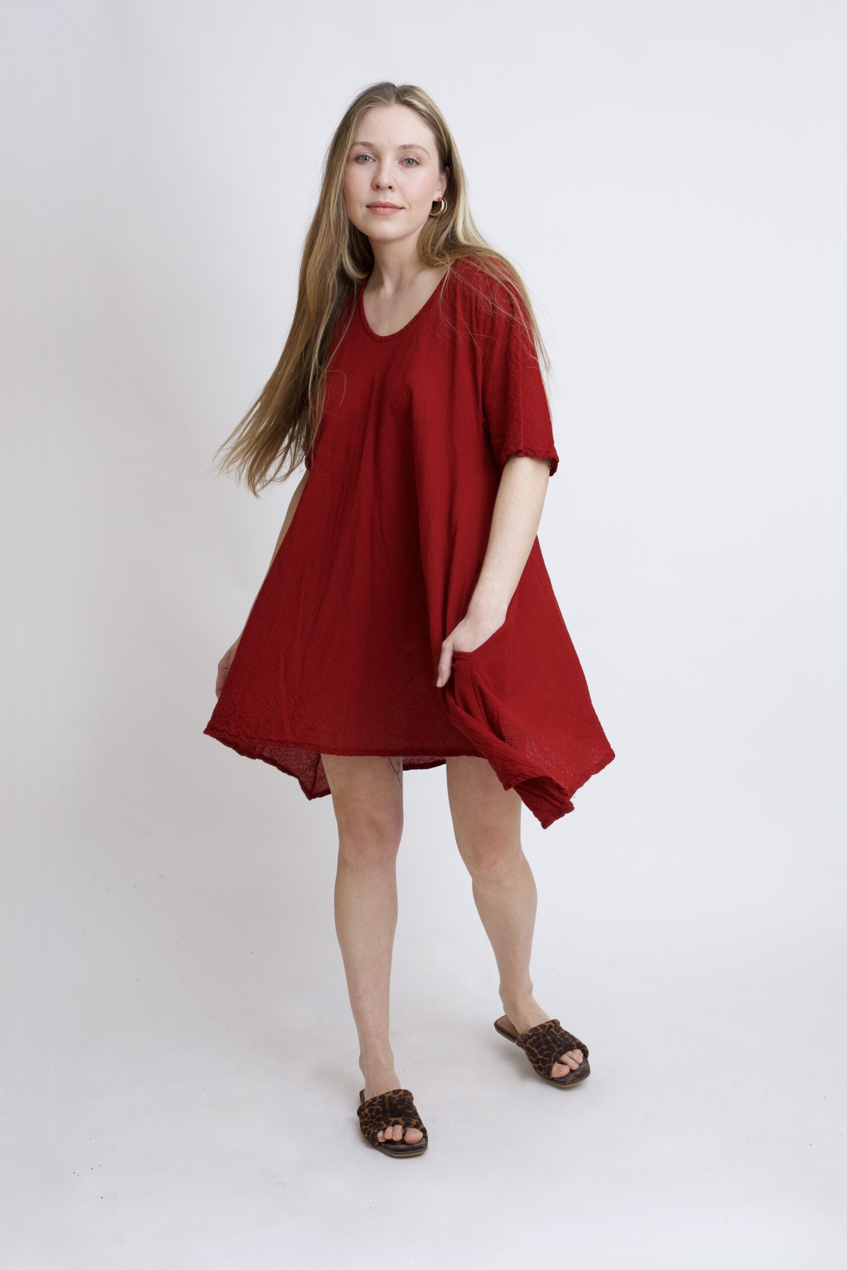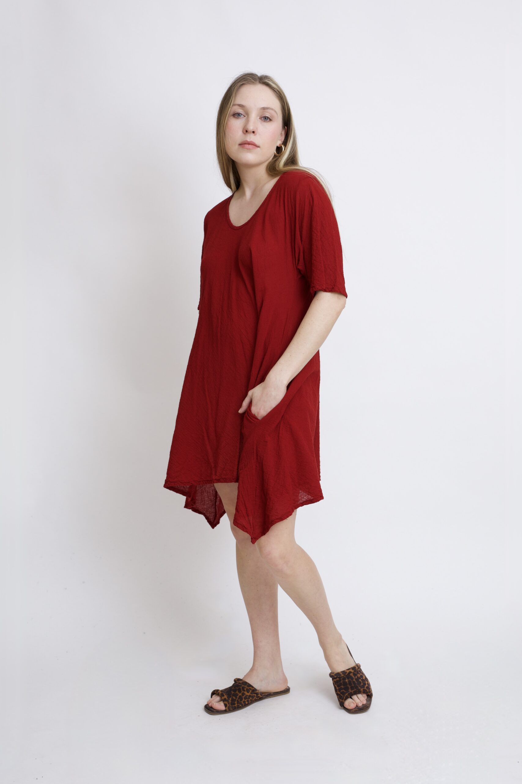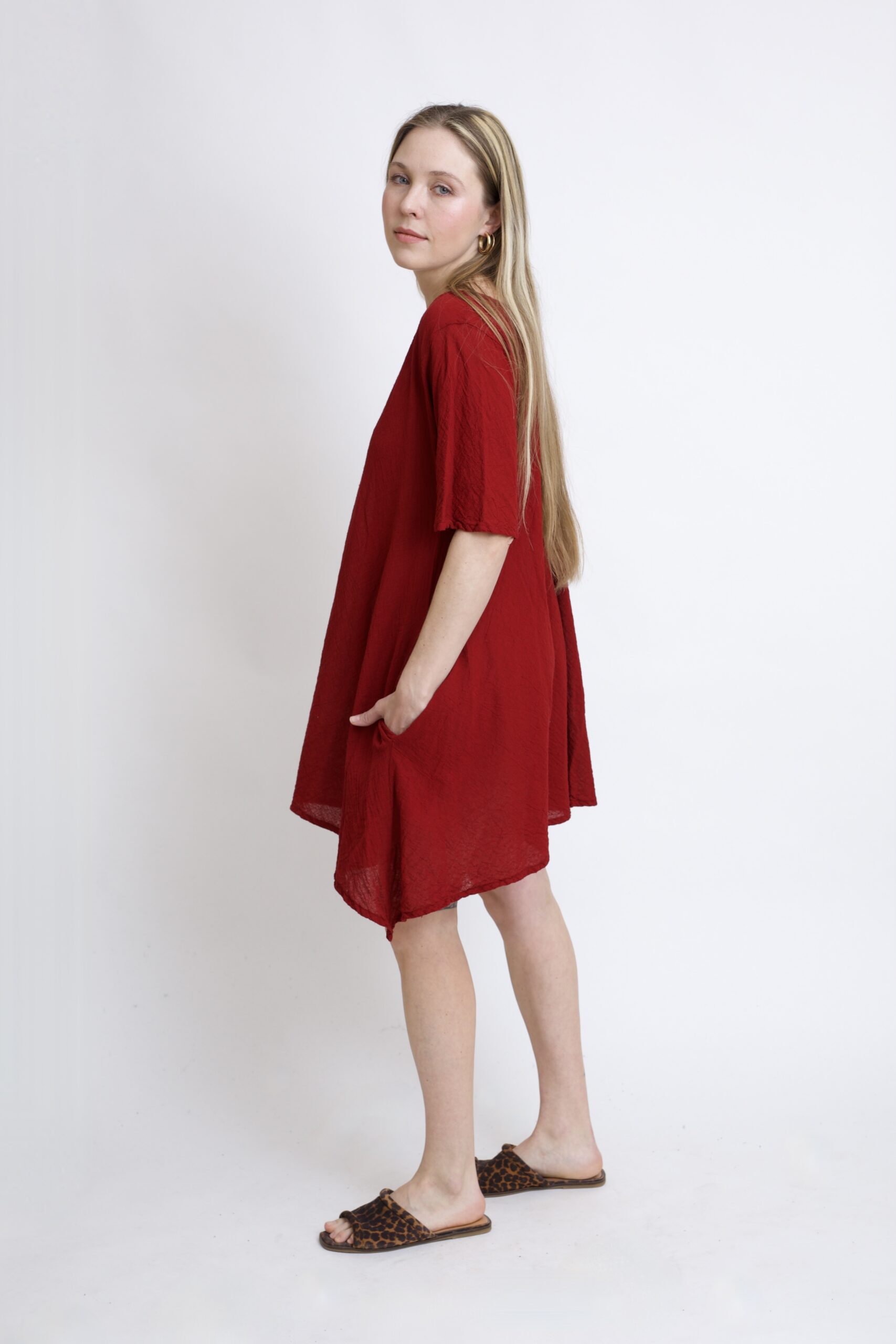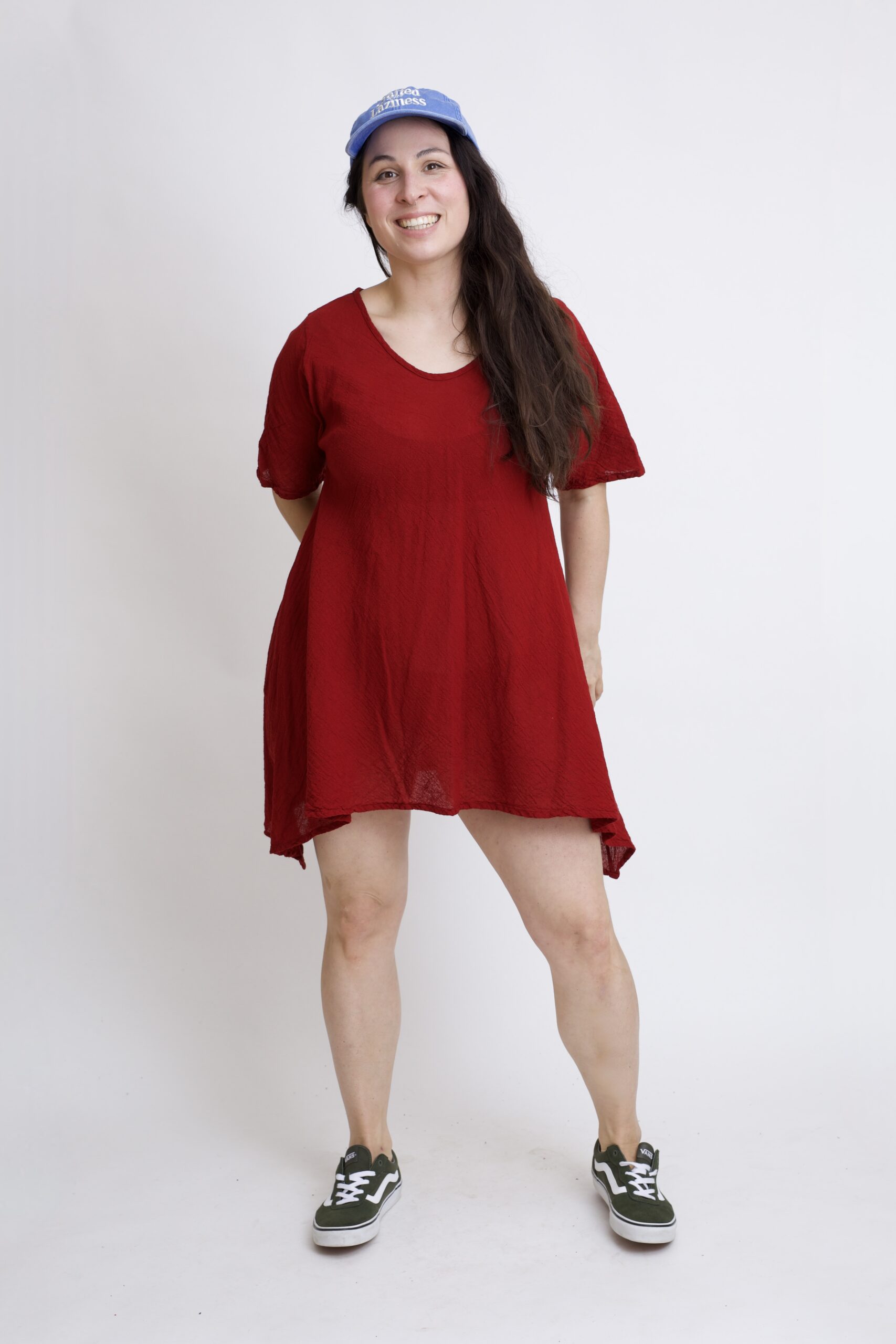 Damska tunika oversize z naturalnej, czystej bawełny. Tunika o charakterystycznym kroju z wydłużonymi bokami, zwanymi ogonami. Asymetryczny fason nadaje jej lekkości i sprawia, że tunika ciekawie układa się w ruchu. To uniwersalny model, który łatwo połączyć z legginsami, spodniami lub jeansami, tworząc wygodną i stylową stylizację na co dzień. Tunika w kolorze burgundowym.