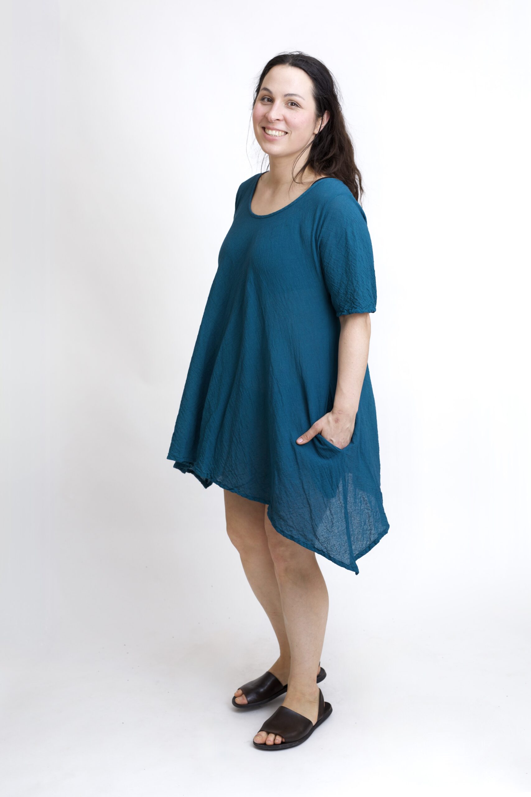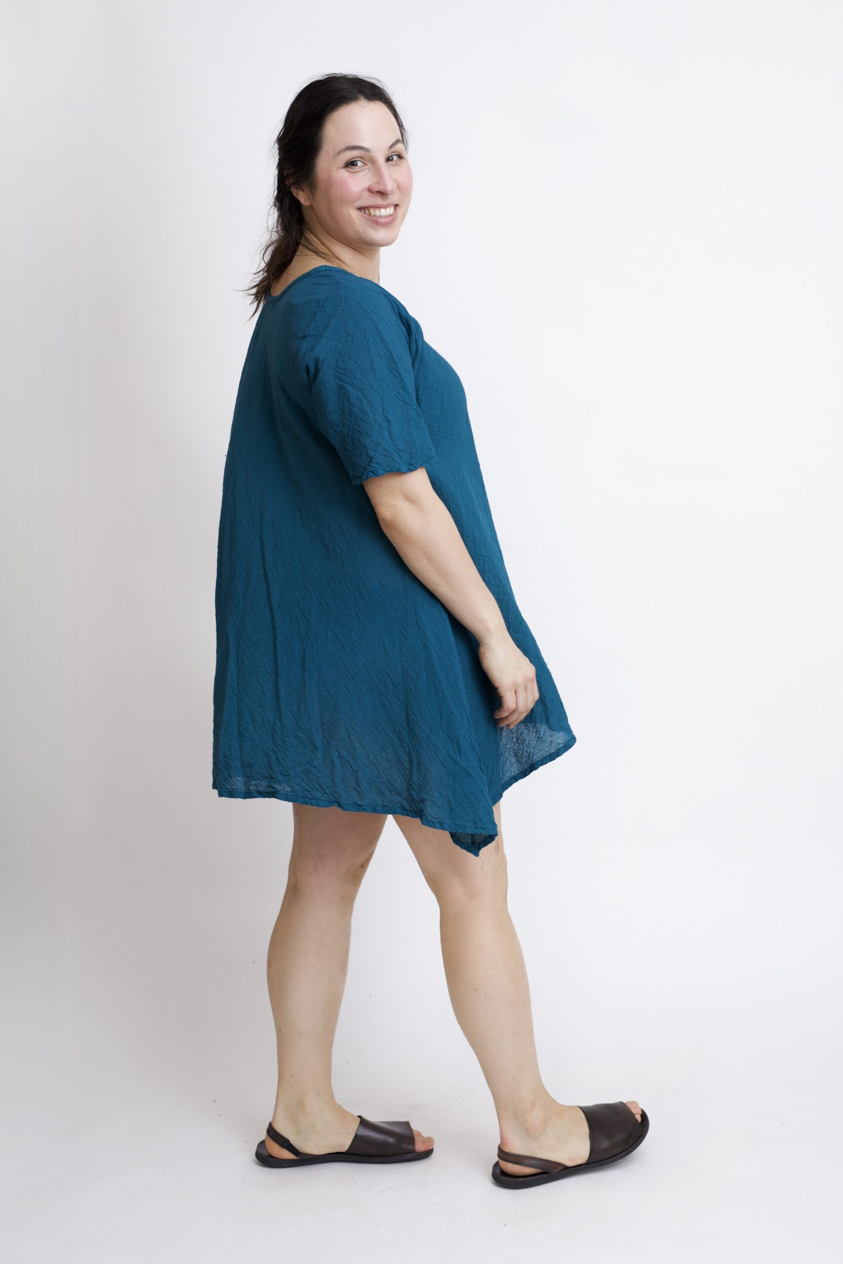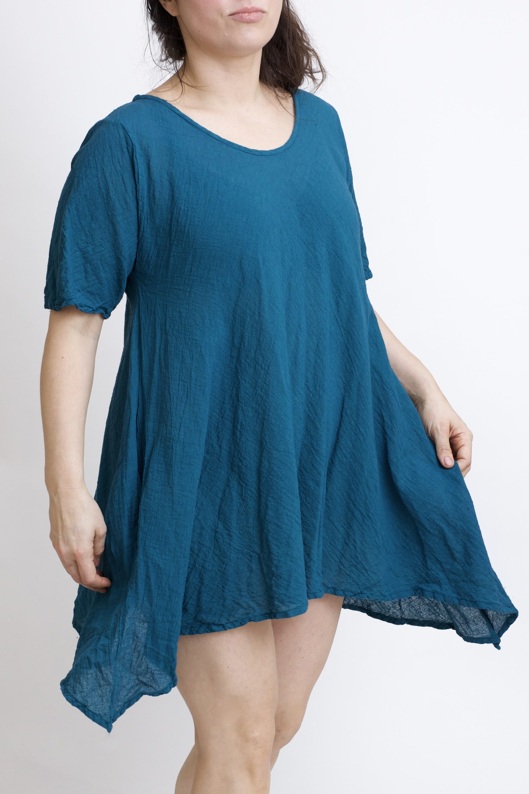 Damska tunika oversize z naturalnej, czystej bawełny. Tunika o charakterystycznym kroju z wydłużonymi bokami, zwanymi ogonami. Asymetryczny fason nadaje jej lekkości i sprawia, że tunika ciekawie układa się w ruchu. To uniwersalny model, który łatwo połączyć z legginsami, spodniami lub jeansami, tworząc wygodną i stylową stylizację na co dzień. Tunika w kolorze niebieskim-petrol.