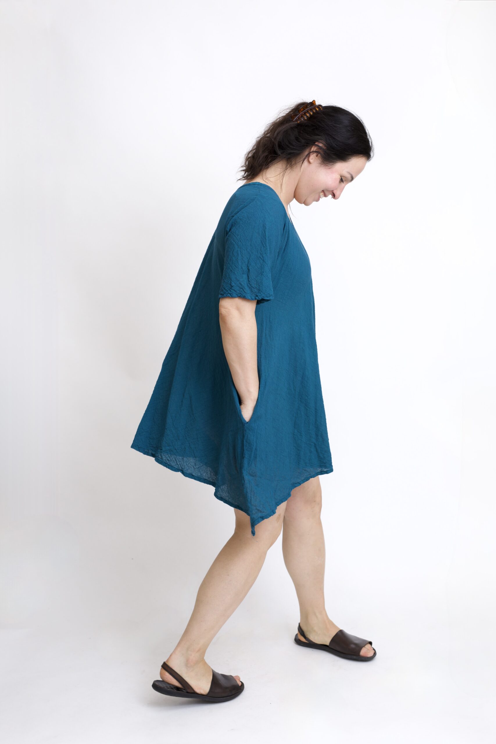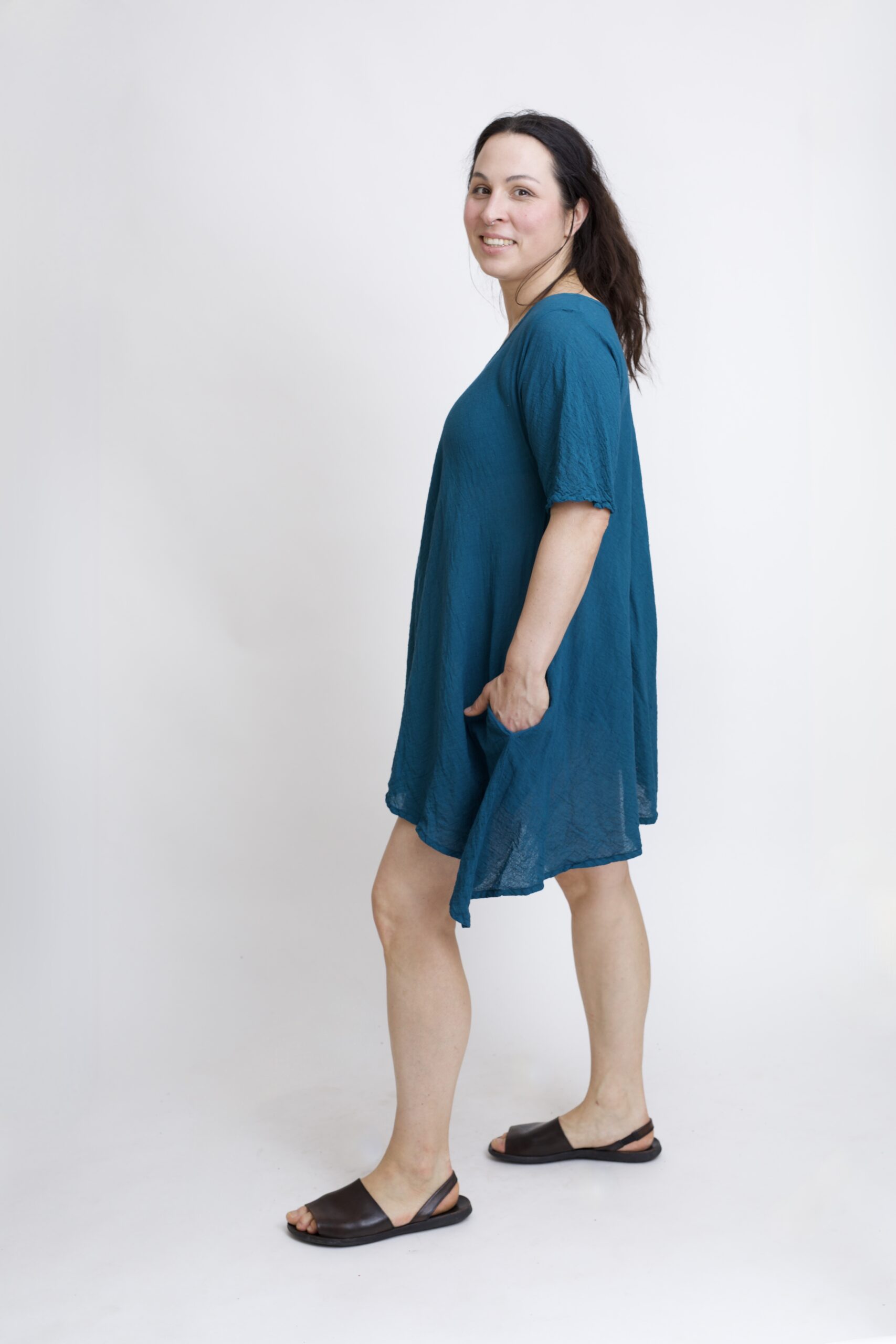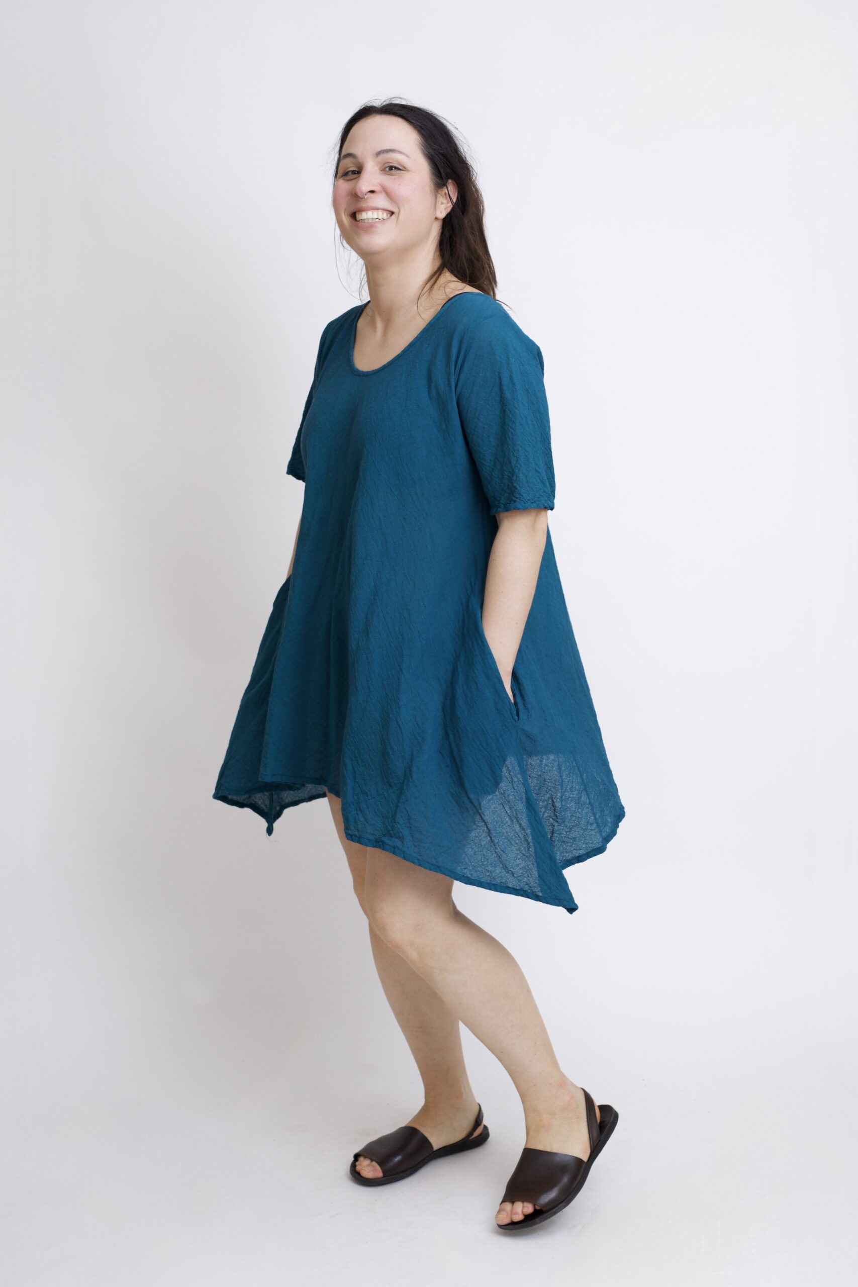 Damska tunika oversize z naturalnej, czystej bawełny. Tunika o charakterystycznym kroju z wydłużonymi bokami, zwanymi ogonami. Asymetryczny fason nadaje jej lekkości i sprawia, że tunika ciekawie układa się w ruchu. To uniwersalny model, który łatwo połączyć z legginsami, spodniami lub jeansami, tworząc wygodną i stylową stylizację na co dzień. Tunika w kolorze niebieskim-petrol.