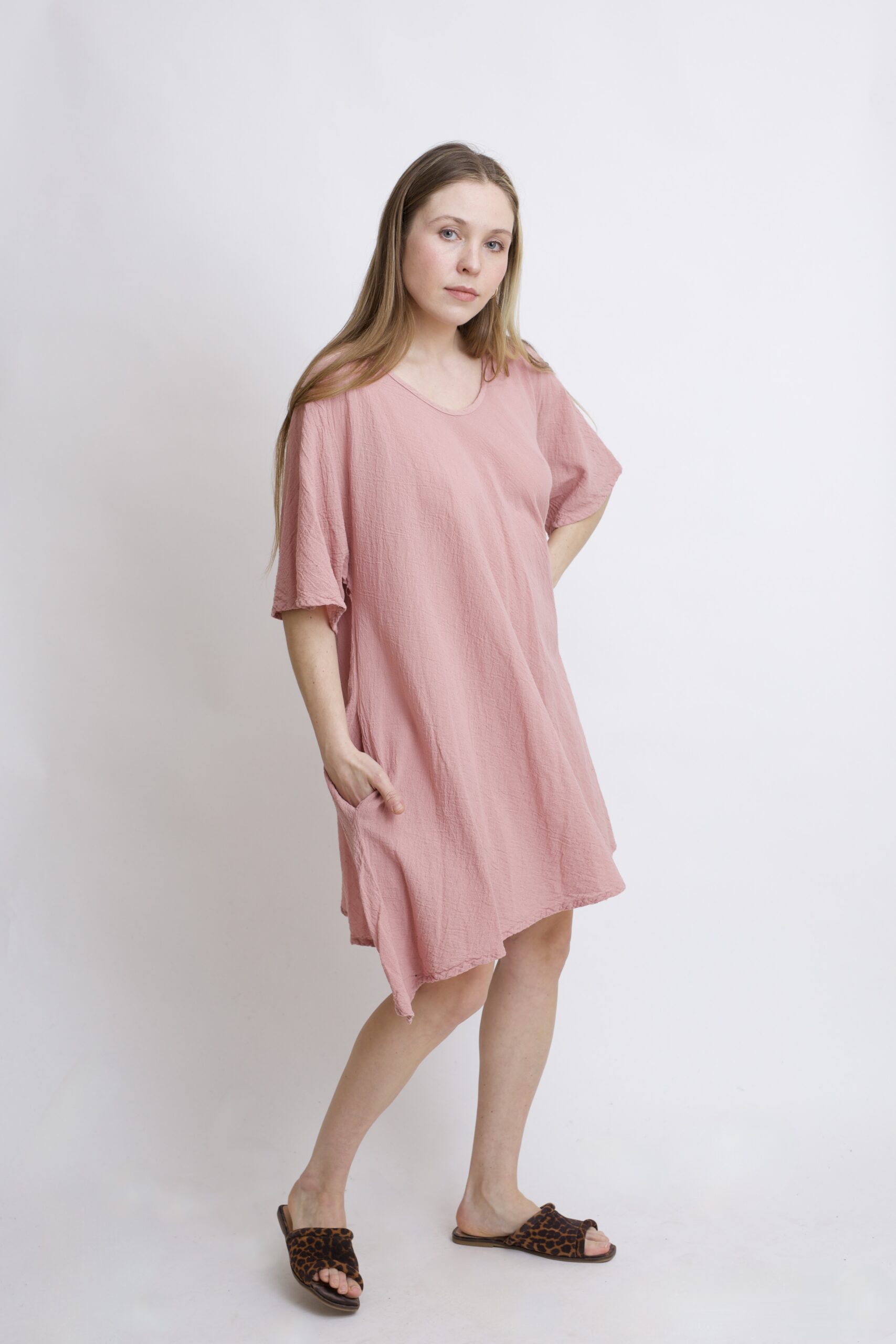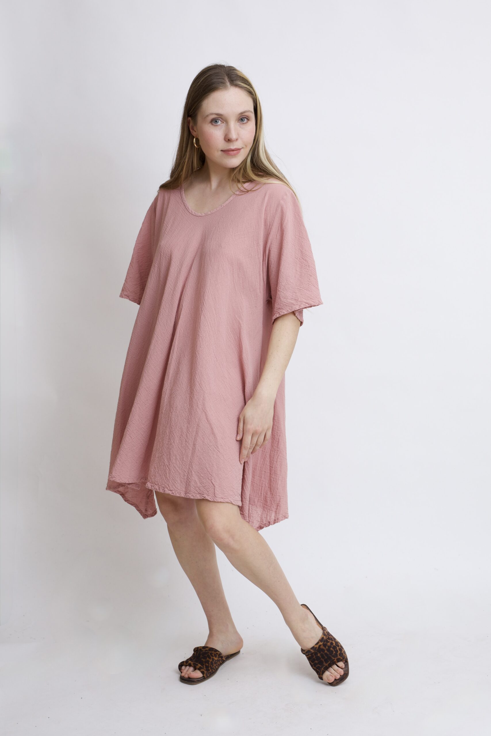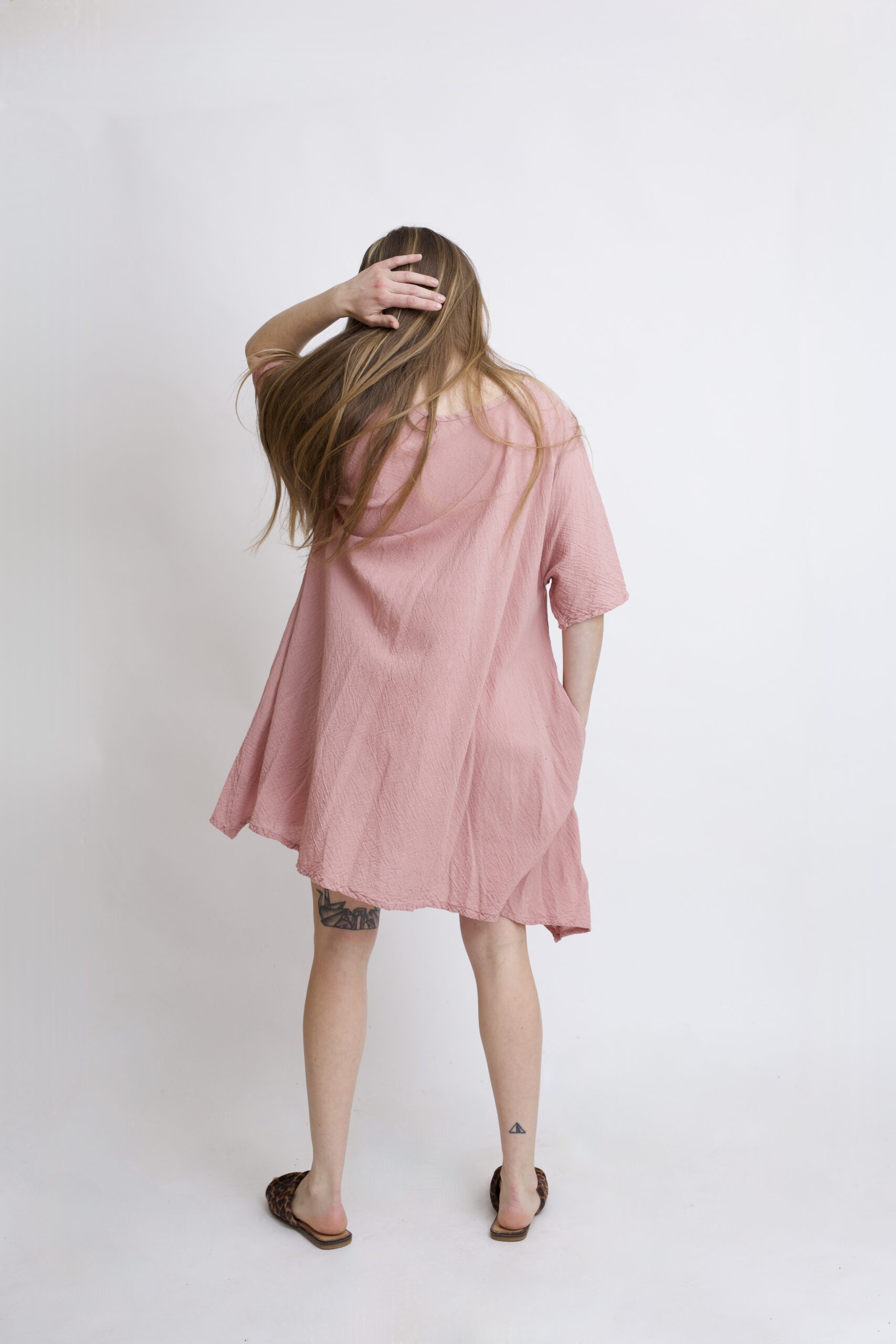 Damska tunika oversize z naturalnej, czystej bawełny. Tunika o charakterystycznym kroju z wydłużonymi bokami, zwanymi ogonami. Asymetryczny fason nadaje jej lekkości i sprawia, że tunika ciekawie układa się w ruchu. To uniwersalny model, który łatwo połączyć z legginsami, spodniami lub jeansami, tworząc wygodną i stylową stylizację na co dzień. Tunika w kolorze Róż Pudrowy.