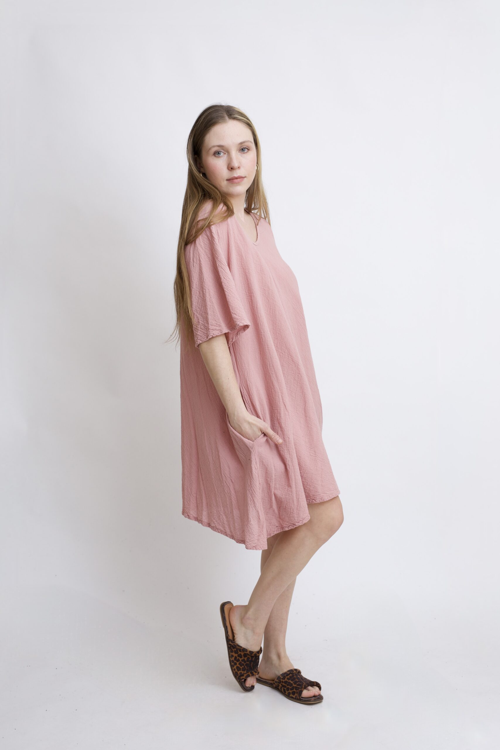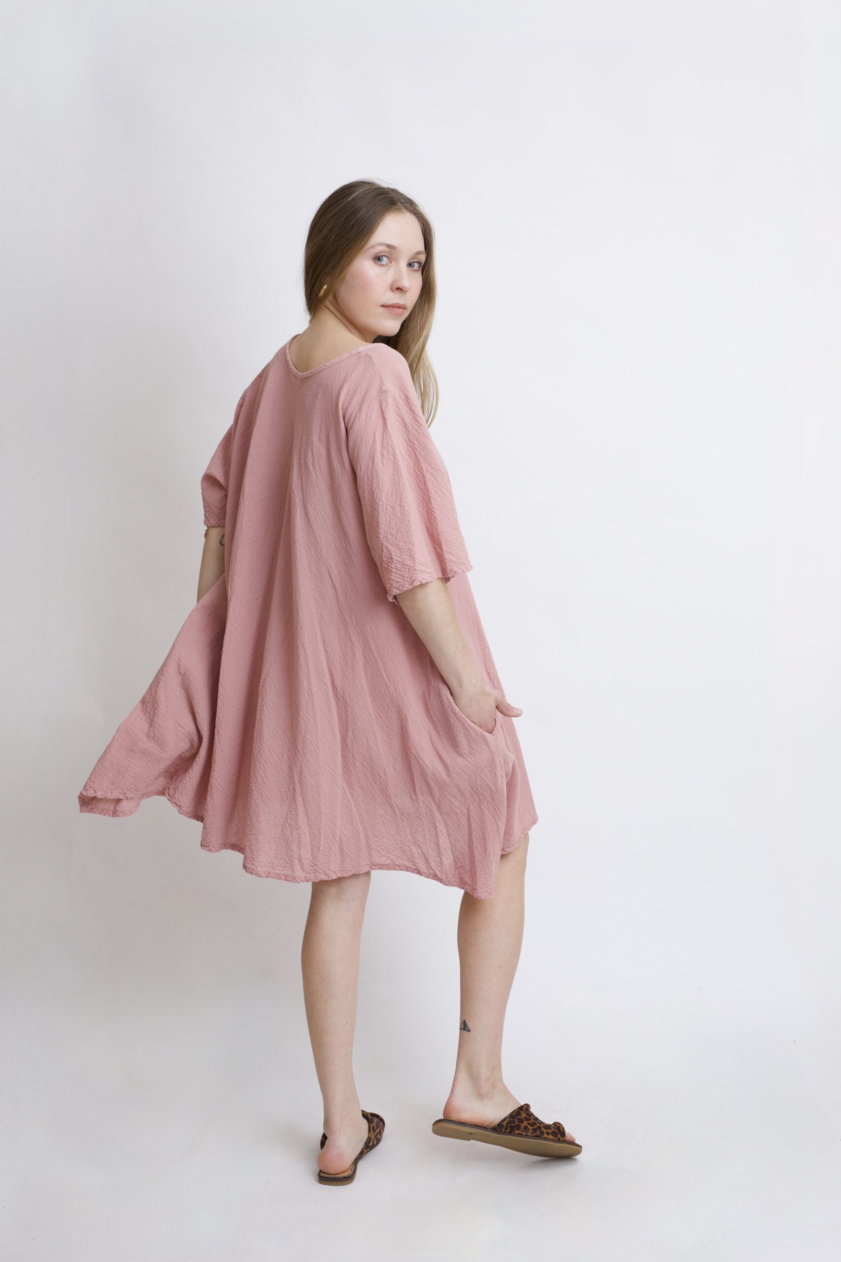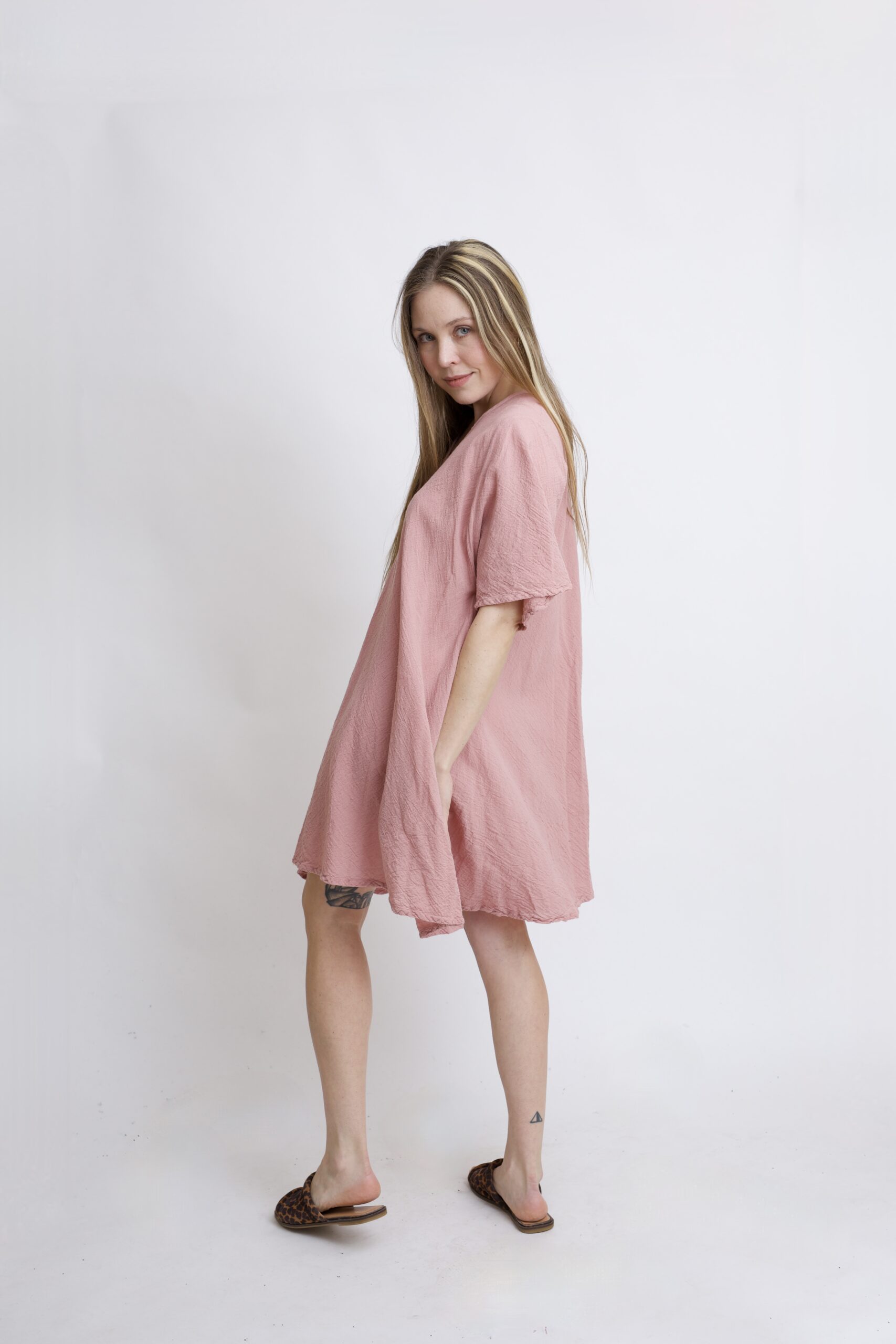 Damska tunika oversize z naturalnej, czystej bawełny. Tunika o charakterystycznym kroju z wydłużonymi bokami, zwanymi ogonami. Asymetryczny fason nadaje jej lekkości i sprawia, że tunika ciekawie układa się w ruchu. To uniwersalny model, który łatwo połączyć z legginsami, spodniami lub jeansami, tworząc wygodną i stylową stylizację na co dzień. Tunika w kolorze Róż Pudrowy.