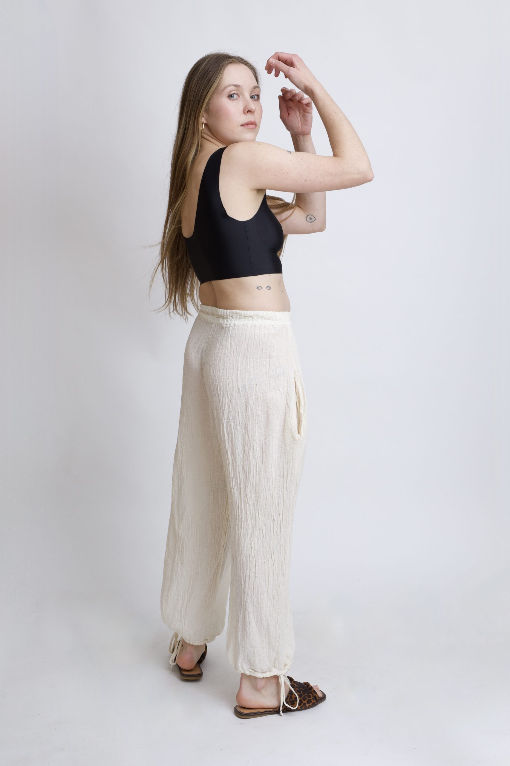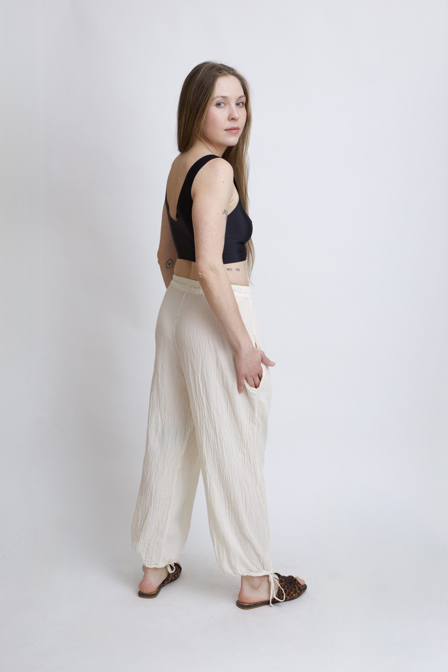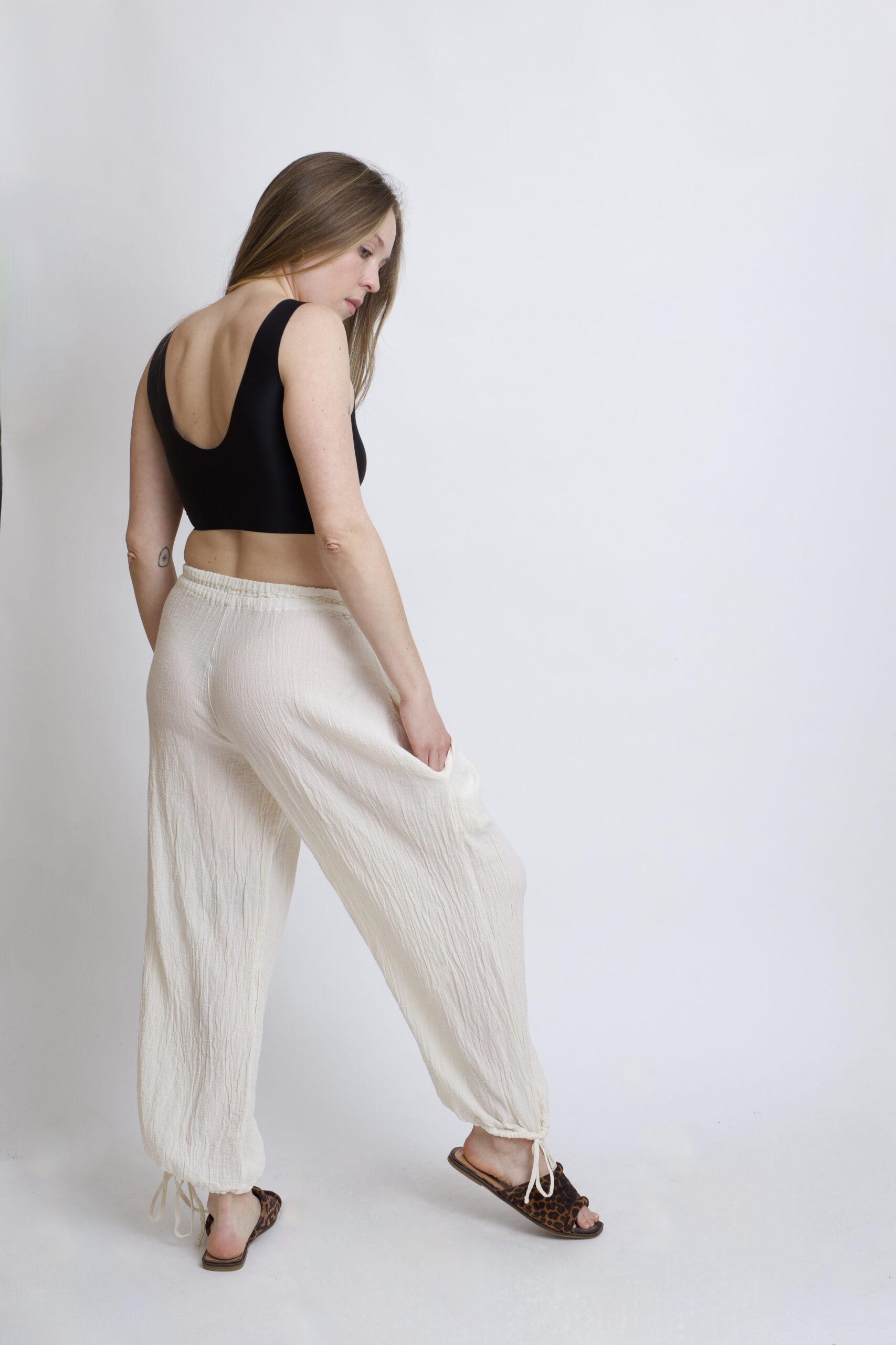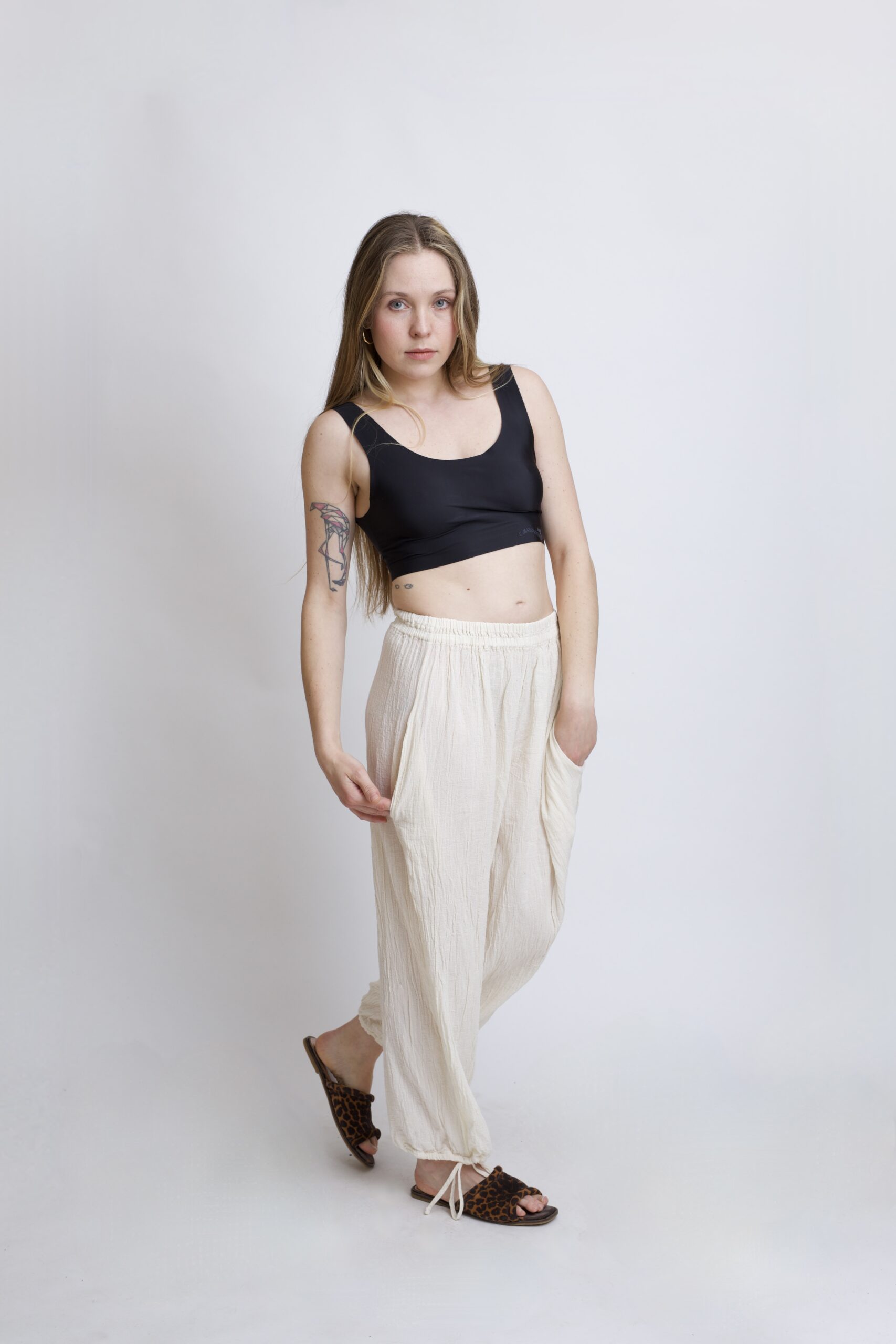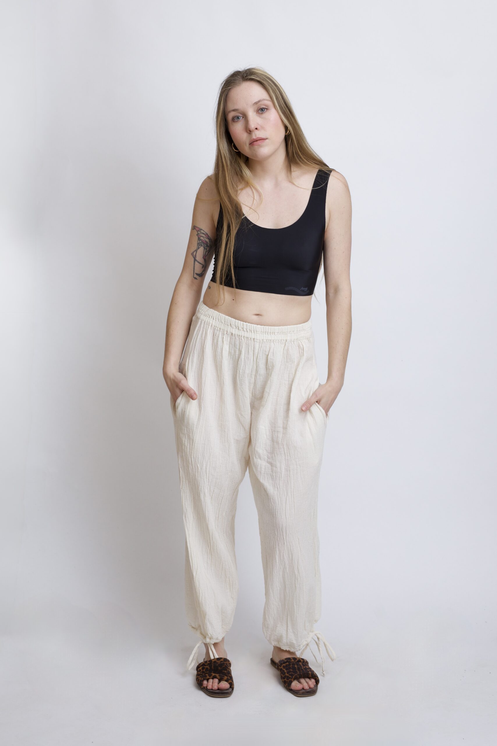 Bawełniane spodnie z szeroką regulowaną nogawką, wykonane z miękkiej, oddychającej bawełny. Elastyczna guma w pasie doskonale dopasowuje się do sylwetki. Praktyczne troczki pozwalają na regulację ich szerokości w nogawce – noś je tak, jak lubisz. Wyposażone w dwie kieszenie. Świetnie sprawdzą się zarówno na spacer, w domu, jak i w codziennych stylizacjach.