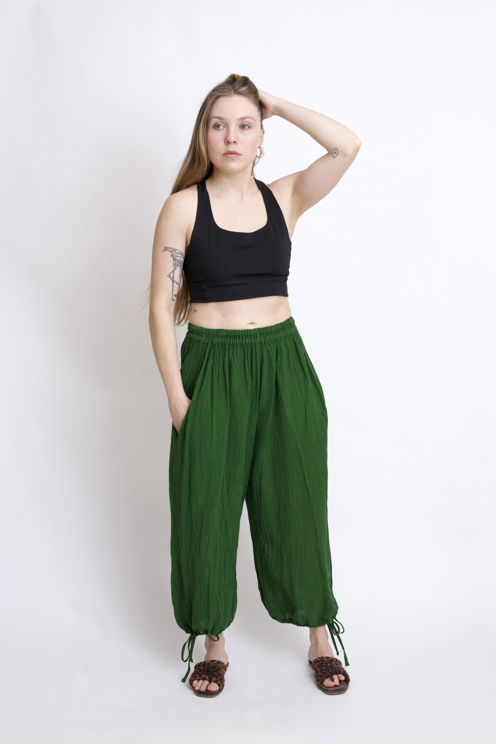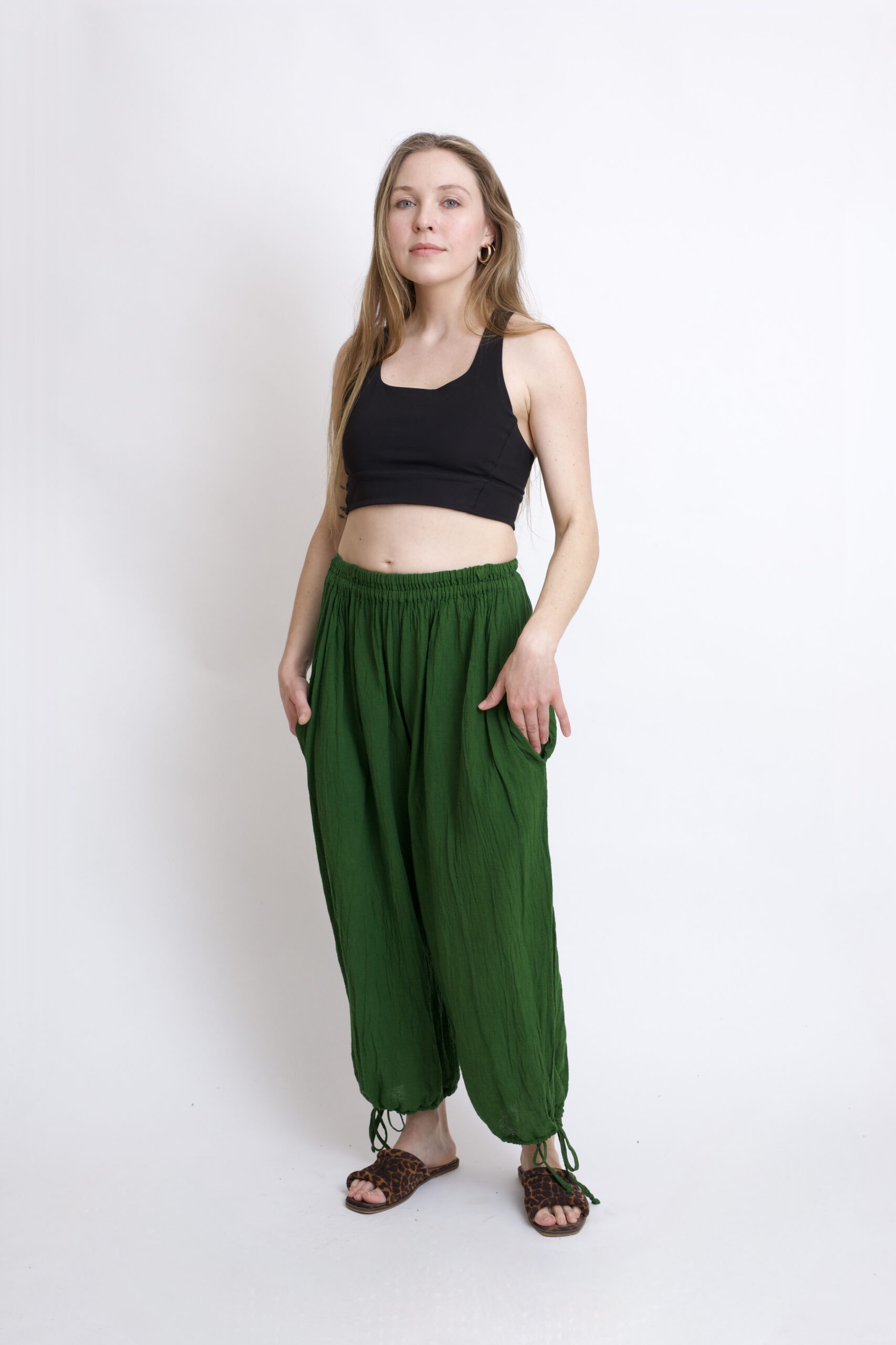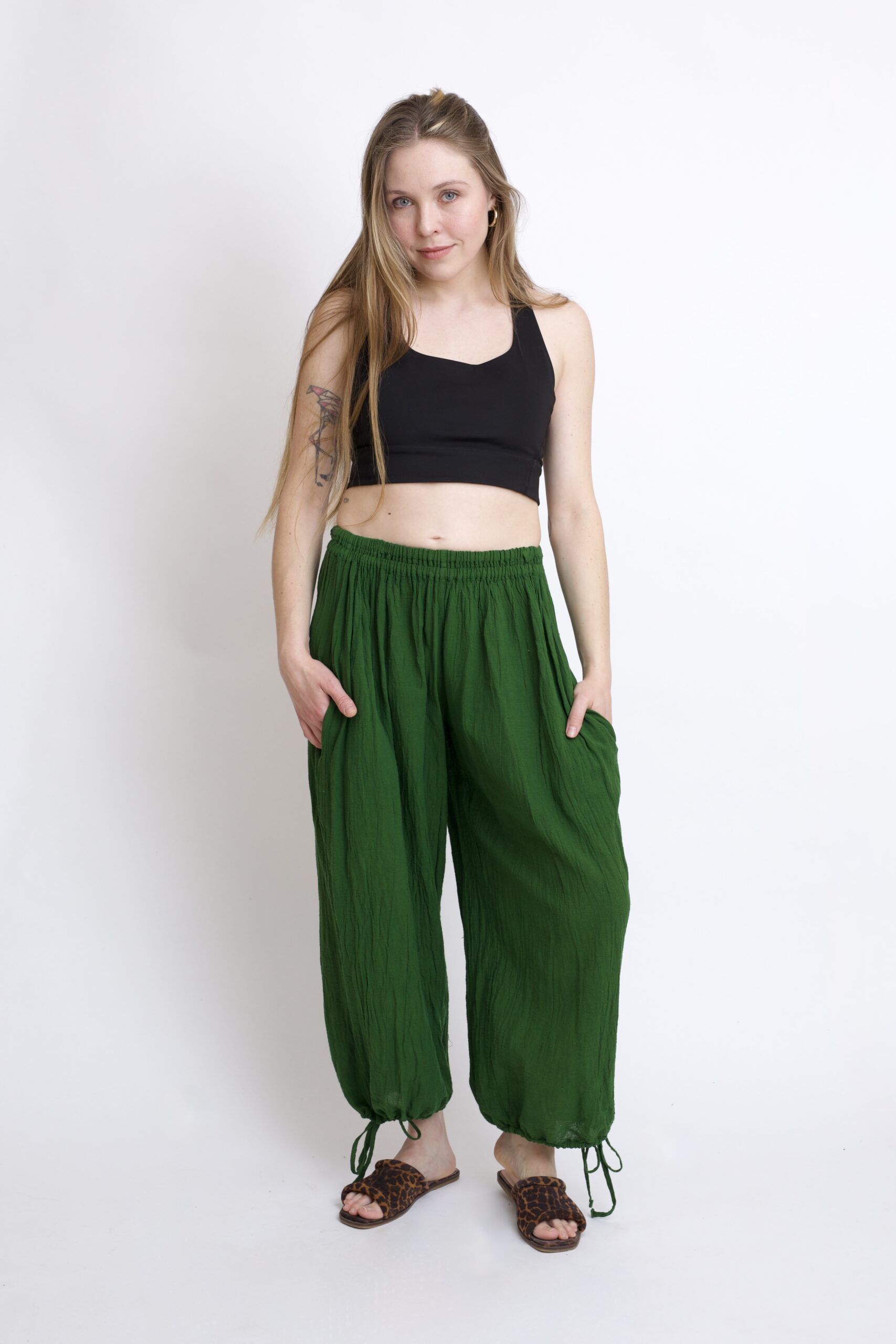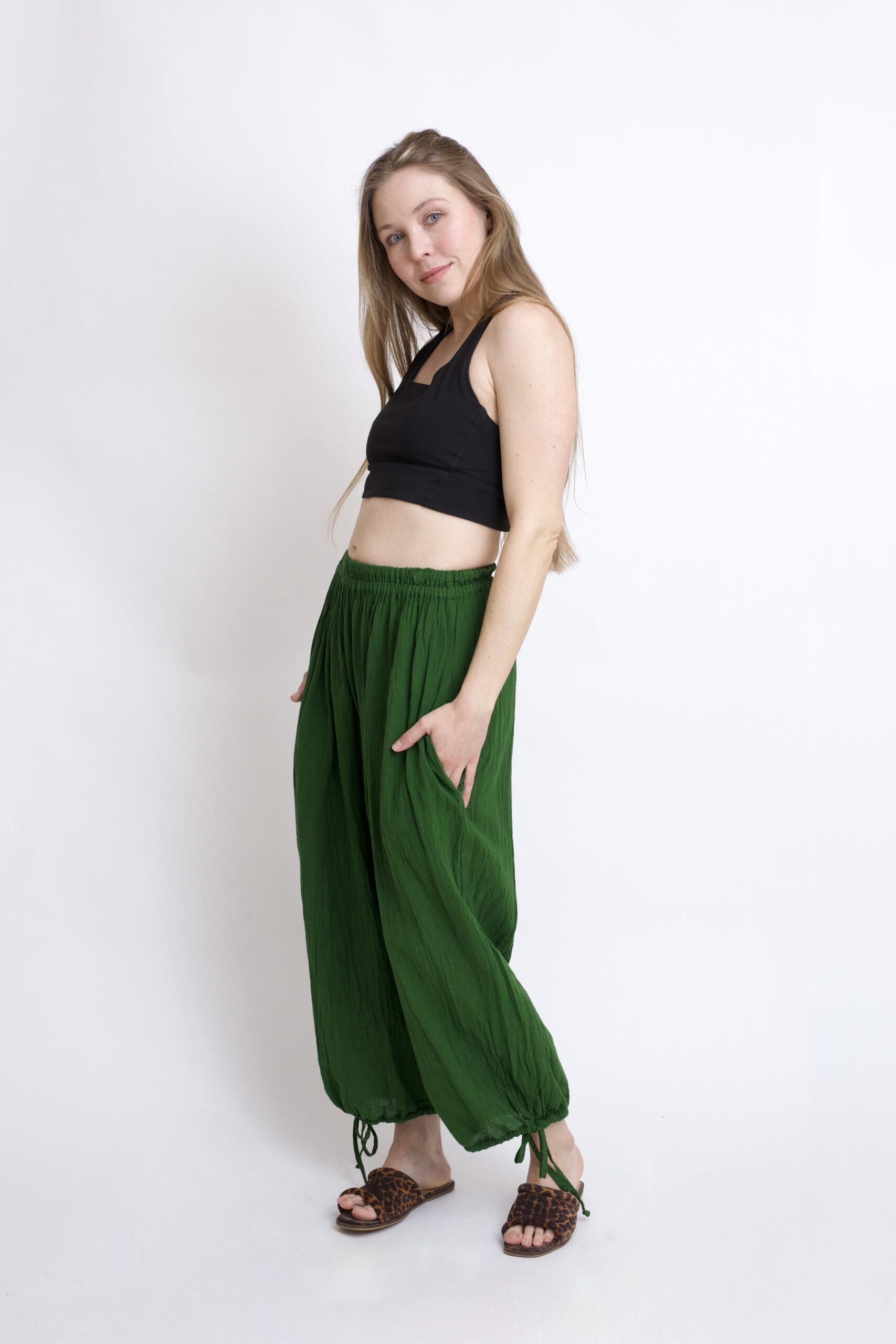 Bawełniane spodnie zielone z szeroką, regulowaną nogawką. Wykonane z miękkiej, oddychającej bawełny. Elastyczna guma w pasie doskonale dopasowuje się do sylwetki. Praktyczne troczki pozwalają na regulację ich szerokości w nogawce – noś je tak, jak lubisz. Wyposażone w dwie kieszenie. Świetnie sprawdzą się zarówno na spacer, w domu, jak i w codziennych stylizacjach.