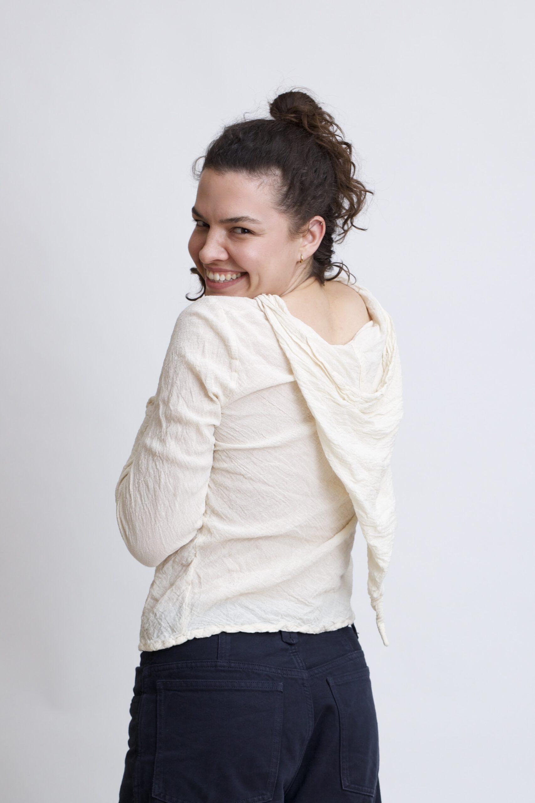 Damski top z bawełny organicznej o luźnym, wygodnym kroju. Rozkloszowane rękawy oraz spiczasty kapturek nadają topowi wyjątkowego charakteru. Naturalna bawełna sprawia, że bluzka jest przewiewna i przyjemna dla skóry.