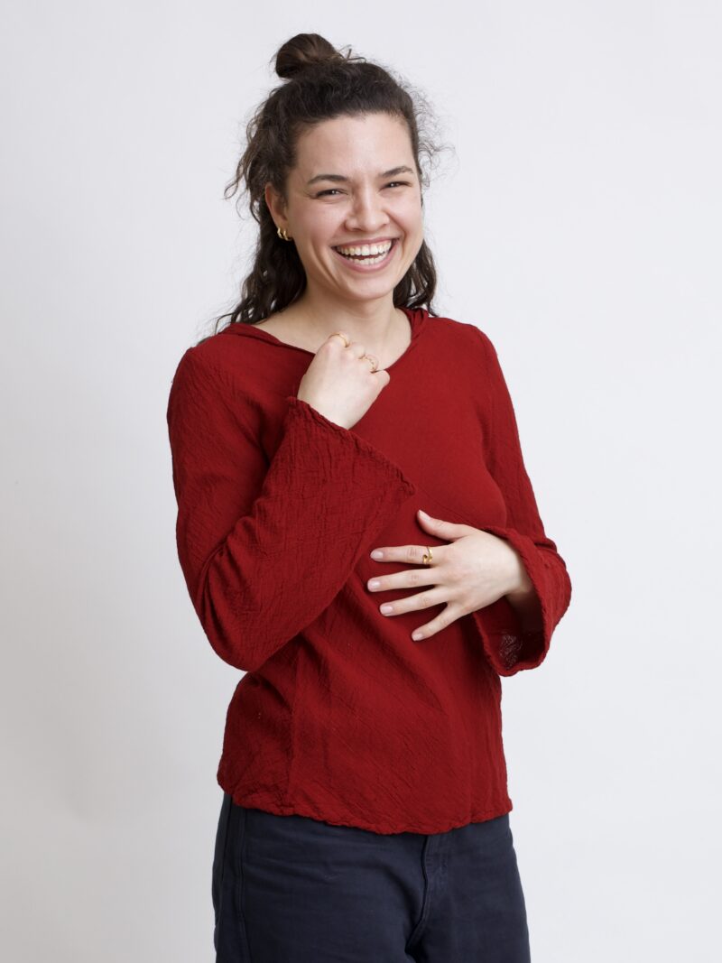 Damski top z bawełny organicznej o luźnym, wygodnym kroju. Rozkloszowane rękawy oraz spiczasty kapturek nadają topowi wyjątkowego charakteru. Naturalna bawełna sprawia, że bluzka jest przewiewna i przyjemna dla skóry. Top w kolorze róż burgundowym.