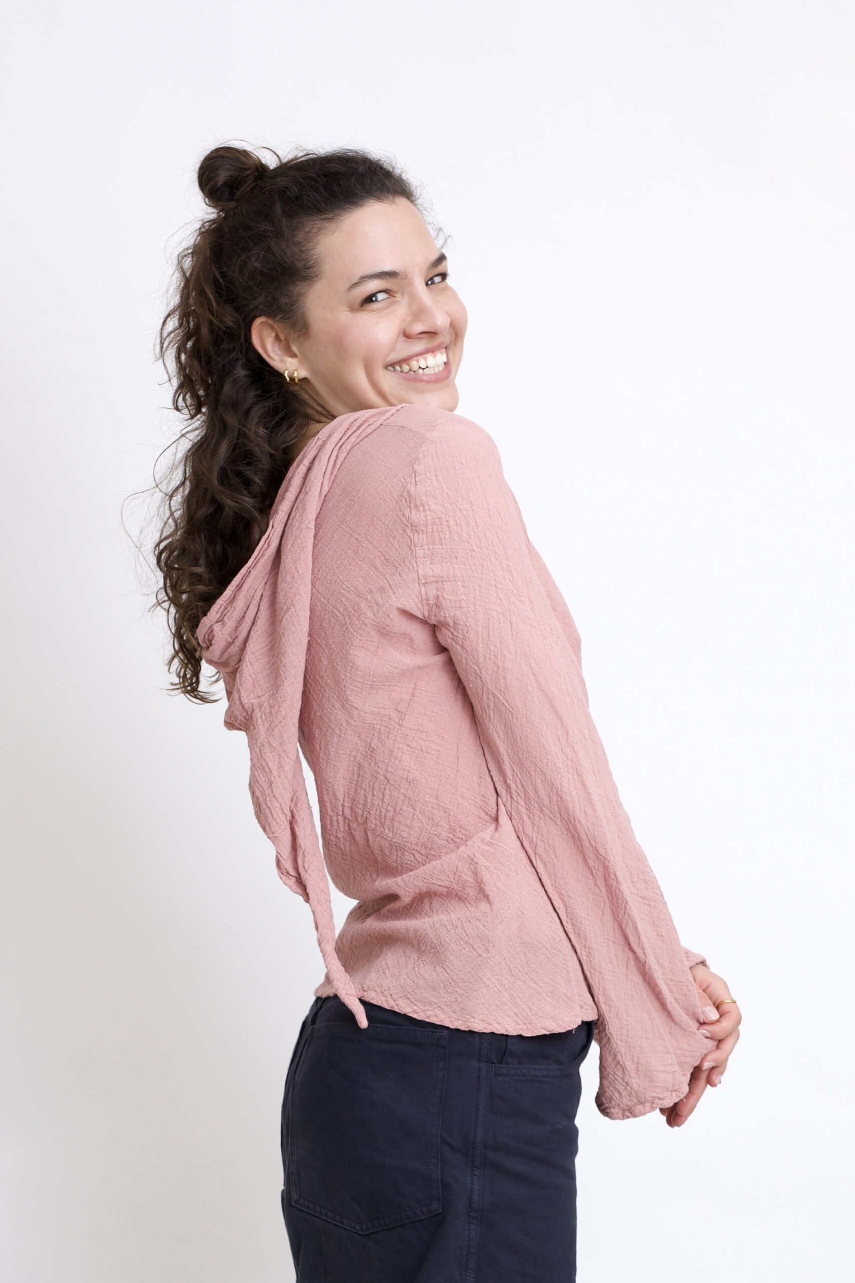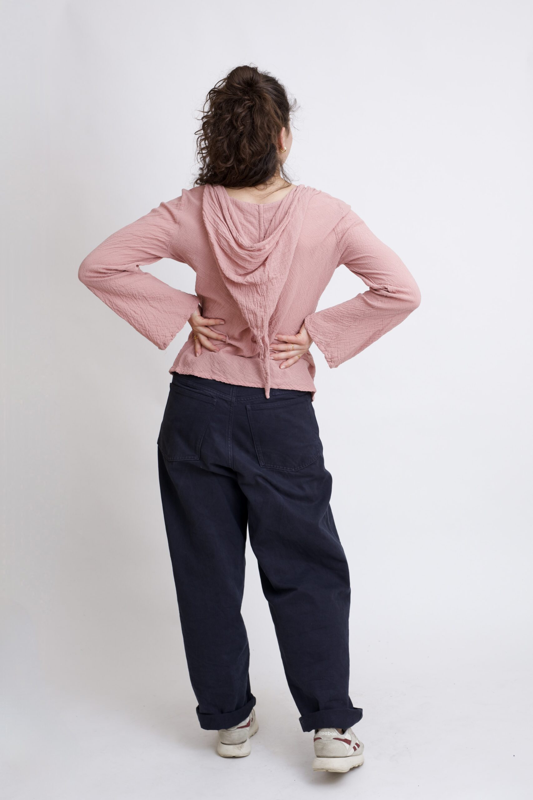 Damski top z bawełny organicznej o luźnym, wygodnym kroju. Rozkloszowane rękawy oraz spiczasty kapturek nadają topowi wyjątkowego charakteru. Naturalna bawełna sprawia, że bluzka jest przewiewna i przyjemna dla skóry. Top w kolorze róż pudrowy.