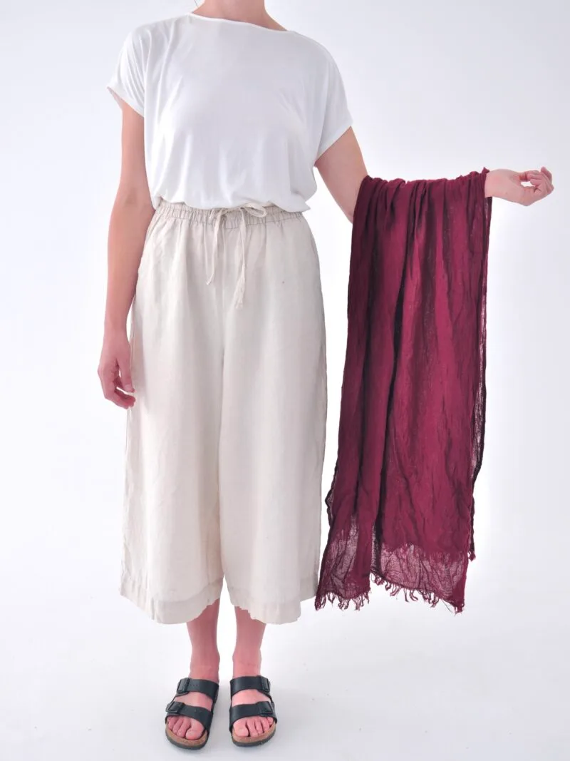 Szal czerwonawy ametyst to ciemny, czerwono-fioletowy odcień oberżyny. Złożony kolor podkreśla unikatowy styl i dodaje energii. Oberżyna działa mocno, ale pozostaje elegancka. Kolor świetnie komponuje się z jasnymi, beżowymi oraz neutralnymi barwami. Ton oberżyny inspiruje do tworzenia wyrazistych zestawień. To odcień, który zwraca uwagę i podkreśla indywidualność stylu. Szal wykończony ręcznie plecionymi frędzlami, pozwala poczuć luz i oryginalność w twoim stylu na co dzień.